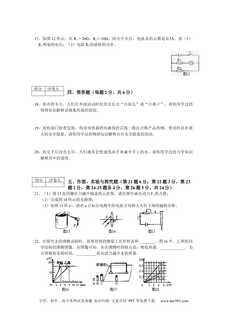 小学、初中、高中各种试卷真题知识归纳文案合同PPT等免费下载www.doc985.com吉林省2013年初中毕业生学业考试物理试题题号一二三四五总分得分一、单项选择题(每题2分,共12分)()1、下列描述中最接近实际的数值是A.我省去年冬季的最低气温约-10℃B.做一次眼保健操的时间约20minC.普通房门的高度约2mD.一本九年级物理书的重量约10N()2、图1所示的几种现象,能体现出力改变物体运动状态的是()3、下列现象中通过热传递的方式改变物体内能的是A.陨石进入大气层后燃烧发光B.天冷时人们通常会搓手取暖C.锯木头时锯片发热D.烈日下自行车轮胎受热会胀破()4、如图2所示,小明从山坡上滑下的过程中A.动能增大,重力势能增大B.动能减小,重力势能减小C.动能增大,重力势能减小D.动能减小,重力势能增大()5、图3是小明戴上眼镜前和戴上眼镜后观察到的远处帆船的情形,由此可以判断出小明视力存在的问题以及所戴的眼镜的镜片类型是A.远视眼凸透镜B.近视眼凹透镜C.远视眼凹透镜D.近视眼凸透镜()6、如图4所示,电源电压不变,在a、b间接一个“3V1W”的小灯泡,调节滑动变阻器的滑片p至图示位置时,小灯泡正常发光。若在a、b间换接一个“3V1.5W”的小灯泡,使其正常发光,滑片p应A.向M移动B.向N移动C.保持不变D.无法实现二、填空题(每空1分,共18分)7、2013年6月11日,“神州十号”飞船发射成功,在“神州十号”升空过程中,以地面为参照物,“神州十号”是______的;人们收看到的电视直播画面是通过______传送的。8、考场上,监考老师宣读考生守则的声音是由老师的声带________产生并通过______传入得分评卷人得分评卷人小学、初中、高中各种试卷真题知识归纳文案合同PPT等免费下载www.doc985.com考生耳中的。9、炎热的夏日,河边的砂石烫脚而河水却比较凉,这是因为水的_______比砂石的大的缘故。河水和砂石吸收的能量来自太阳,太阳能可以在自然界里源源不断的得到,它属于___________能源。10、如图5所示,不透明的容器中有一只铁质玩具青蛙,人的眼睛在S位置时刚好看不到青蛙。这是_______________的缘故;向容器中注入适量的水,眼睛就能够看到青蛙了,这是_______________造成的。11、如图6所示,蜡烛甲燃烧一会后会闻到蜡油味,这是_______现象;把蜡烛甲与未点燃的蜡烛乙靠在一起,然后用吸管对着蜡烛乙的上方吹,会发现蜡烛乙被“吹”着了,这是因为空气流速大的位置,压强_________的缘故。12、为了保证用电安全,在家庭电路中,电灯的开关应该与_______线相连;如图7所示,用电水壶烧水时,若不慎有水溅入旁边的插座里。可能会导致电路__________,使空气开关跳闸。13、如图8所示,吸管由于受到__________的作用会紧紧“吸附”在墙壁上,又由于吸盘与墙壁间有___________,所以即使在吸盘上挂一定重量的物体,吸盘也不会脱落。14、图9是小明同学设计的“电子水平仪”,若将水平仪旋转到倾斜的平台上,由于重锺所受重力的方向总是_______________,金属丝就会与中央有孔的金属板接触,铃响灯亮,在该电路中,电铃与电灯是_______联的。15、如图10所示,小雨用200牛的拉力把重量是320N的物体匀速提升3m,拉力所做的功是_______J,动滑轮的机械效率是_________。三、计算题(每空5分,共10分)16、如图11所示,放在水平桌面的杯子,质量0.2kg,容积是5×10-4m3,杯子与桌面接触的面积是5×10-3m2,现将杯子装满水。求:(1)杯子中水的质量;(2)杯子对桌面的压强。(g取10N/kg)得分评卷人小学、初中、高中各种试卷真题知识归纳文案合同PPT等免费下载www.doc985.com17、如图12所示,在R1=20Ω,R2=10Ω,闭合开关后,电流表的示数是0.3A。求(1)R1两端的电压;(2)电阻R2的消耗的功率。四、简答题(每题2分,共6分)18、寒冷的冬天,人们在外面活动时经常会长出“白眉毛”或“白胡子”,请你用学过的物理知识解释该现象形成的原因。19、质检部门检查发现,伪劣电热器的电源线的芯线一般比合格产品的细,使用时存在很大的安全隐患,请你用学过的物理知识解释存在安全隐患的原因。20、洗完手后没有毛巾,人们通常会快速甩动手来减少手上的水,请你...