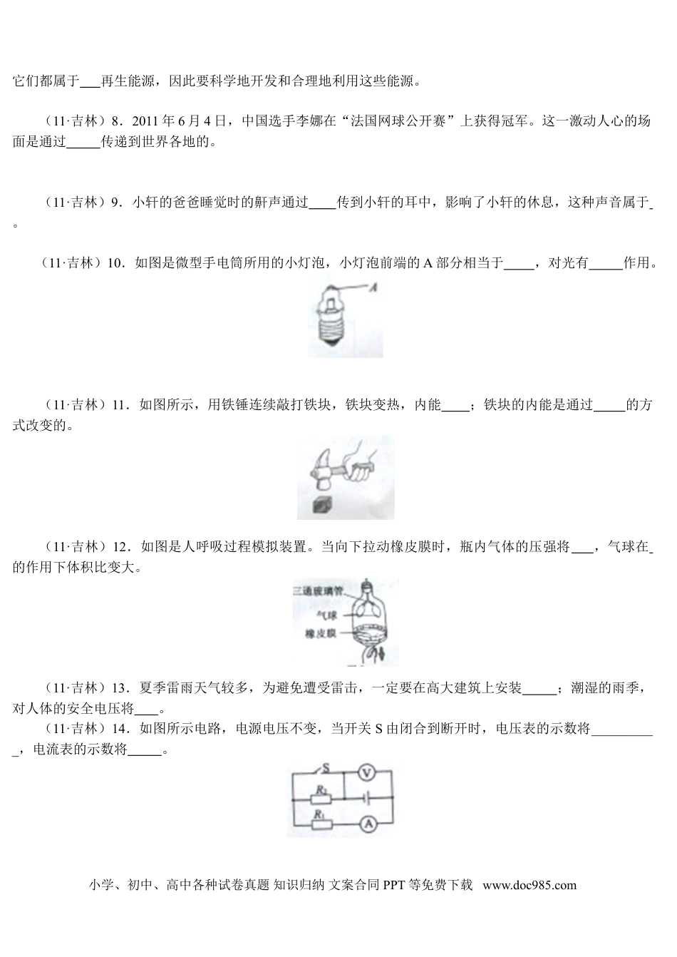 吉林省2011年初中毕业生学业考试物理化学合卷物理一、单项选择题(每题2分,共12分)(11·吉林)1.下列数剧中与实际相符的是A.中学生脚的长度为50cmB.中学生的体重为50NC.人体的密度约为1.0×103kg/m3D.人在正常呼吸时肺内的气压约为108pa(11·吉林)2.能说明分子不停地运动的现象是A.花香四溢B.漫天沙尘C.落叶纷飞D.细雨绵绵(11·吉林)3.如图所示,用照相机对左侧的景物拍照,底片上所成的像正确的是(11·吉林)4.下列说法中正确的是A.控制电灯的开关与该电灯是并联的B.能够使试电笔氖管发光的是零线C.使用电冰箱时必须使用两孔插座D.电饭锅是利用电流的热效应工作的(11·吉林)5.小轩坐在船上,下列说法正确的是A.船前进时,小轩相对于船是运动的,B.停止划桨时船会立即停止C.用桨向后划水船会前行,说明物体间力的作用是相互的D.小轩对船的压力和船对小轩的支持力是一对平衡力(11·吉林)6.如图所示电路,电源电压不变,R是定值电阻。当将一个“2.5V0.5A”的小灯泡接在a、b两点间是,小灯泡恰好正常发光;若换一个“3.8V0.5A”的小灯泡接在a、b两点间,则这个小灯泡A.比正常发光亮些B.比正常发光暗些C.能正常发光D.灯丝将会被烧断二、填空题(每空1分)共18分)(11·吉林)7.地球内部蕴藏着石油、煤、天然气等物质,这些物质是人类生产和生活的主要能源来源,小学、初中、高中各种试卷真题知识归纳文案合同PPT等免费下载www.doc985.com它们都属于再生能源,因此要科学地开发和合理地利用这些能源。(11·吉林)8.2011年6月4日,中国选手李娜在“法国网球公开赛”上获得冠军。这一激动人心的场面是通过传递到世界各地的。(11·吉林)9.小轩的爸爸睡觉时的鼾声通过传到小轩的耳中,影响了小轩的休息,这种声音属于。(11·吉林)10.如图是微型手电筒所用的小灯泡,小灯泡前端的A部分相当于,对光有作用。(11·吉林)11.如图所示,用铁锤连续敲打铁块,铁块变热,内能;铁块的内能是通过的方式改变的。(11·吉林)12.如图是人呼吸过程模拟装置。当向下拉动橡皮膜时,瓶内气体的压强将,气球在的作用下体积比变大。(11·吉林)13.夏季雷雨天气较多,为避免遭受雷击,一定要在高大建筑上安装;潮湿的雨季,对人体的安全电压将。(11·吉林)14.如图所示电路,电源电压不变,当开关S由闭合到断开时,电压表的示数将__________,电流表的示数将。小学、初中、高中各种试卷真题知识归纳文案合同PPT等免费下载www.doc985.com(11·吉林)15.如图所示,2011年1月12日,长吉城际铁路正式运营。早上6点50分CHR5型“和谐号”列车由长春开往吉林。列车运行的平均速度约为200km/h,全程约为110km,全程运行时间大约是;乘客看到窗外的树木向后运动,他是以为参照物。(11·吉林)16.一台“220V120W”的新型液晶电视机,正常工作2h消耗的电能为。不看电视时及时切断电源,减少待机时间可以达到的目的。三、计算题(每题5分,共10分)(11·吉林)17.如图所示,一个体重为600N的人站在漂浮于水面的木筏上,木筏的体积为0.4m3,木筏的密度为0.6×103kg/m3,(g=10N/kg)求:(1)木筏的重力(2)木筏排开水的体积(11·吉林)18.如图所示,灯L标有“6V3W”字样,电源电压为9V且保持不变。闭合开关S,灯L正常发光,求:(1)电阻R的阻值(2)灯泡正常发光时电阻R消耗的功率。四、简答题(每题2分,共6分)(11·吉林)19.请写出一种避免汽车在冰雪路面上行驶时出现打滑现象的具体做法,并说出理由。(11·吉林)20.在干燥的季节里,人们穿着化纤衣料的衣服时,衣服常会吸附在身上。请解释这种现象产生的原因。(11·吉林)21.如图所示,用浸透酒精的湿方巾擦拭扎紧的气球,然后摆动气球或給气球扇风,会观察到气球的体积明显缩小。请用相关的物理知识对此现象作出解释。小学、初中、高中各种试卷真题知识归纳文案合同PPT等免费下载www.doc985.com五、作图、实验与探究题(第22题6分,第23题5分、第24题3分,第25题5分、第26题5分,共24分)(11·吉林)22.(1)请在图中画出压缩的弹簧对拇指弹力的示意图。(11·吉林)22.(2)请在图中画...