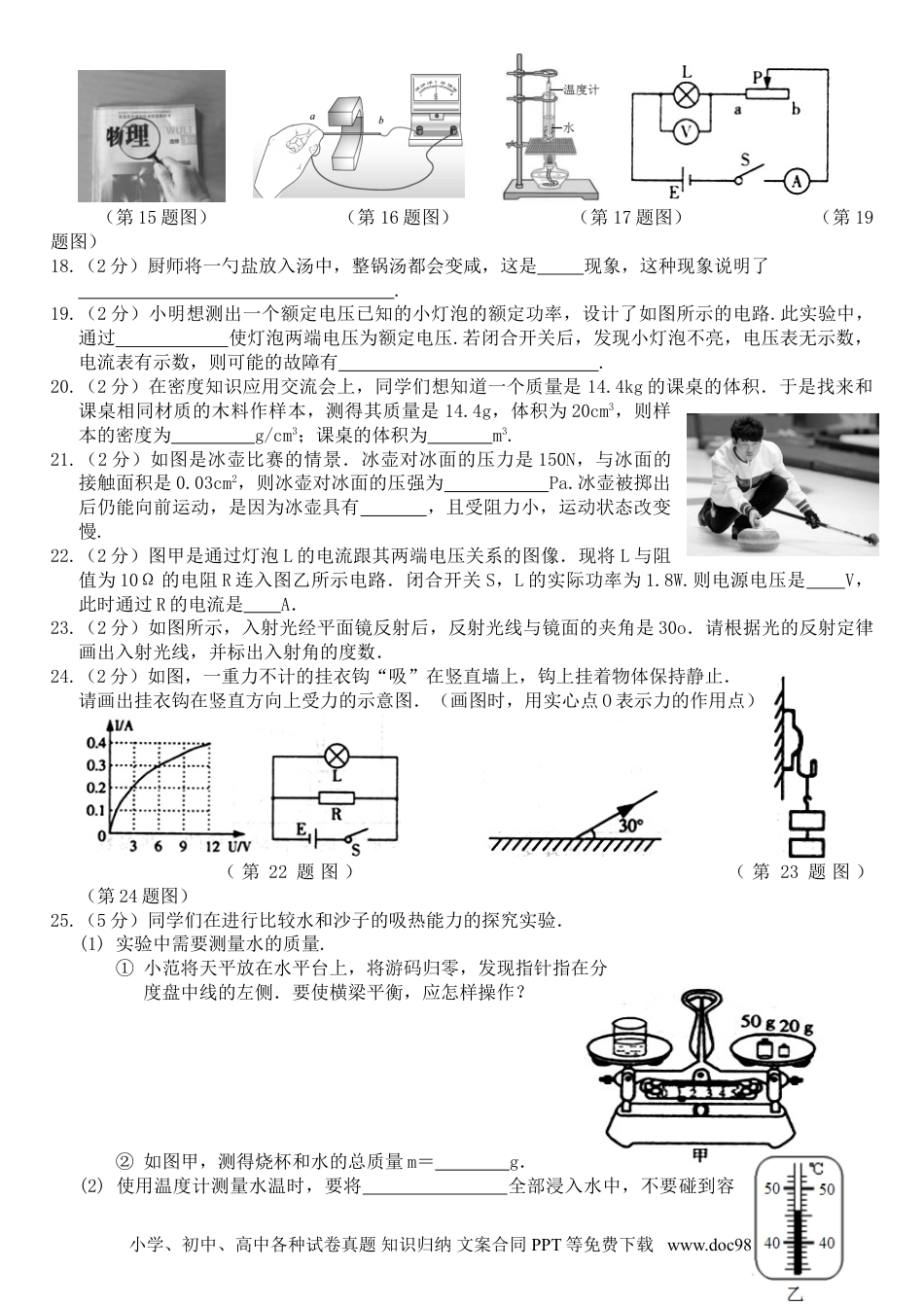 2015年黑龙江哈尔滨中考物理真题及答案一、选择题(每小题2分,共24分,每小题只有一个正确答案)1.下列数据中,符合实际的是()A.物理课本的长度约为50cmB.适合人洗澡的水温约为80℃C.一个鸡蛋的质量约为50gD.短跑运动员比赛时的速度可达30m/s2.下列说法不正确的是()A.雾是水蒸气凝固形成的B.露是水蒸气液化形成的C.雪是水蒸气凝华形成的D.霜是水蒸气凝华形成的3.如图所示的四种现象中,是由光的直线传播形成的是()A.太阳光经过凸透镜形成光斑B.手影的形成C.水中铅笔看起来变弯折D.塔在水中形成倒影4.下列有关热机的说法正确的是()A.内燃机的冷却液需要用比热容较大的物质B.内燃机的做功冲程是机械能转化为内能的过程C.汽油机消耗的汽油可循环使用,是取之不尽的能源D.热机的使用缓解了城市的热岛效应5.利用下列器材,不能完成的实验是()A.探究压力作用效果与受力面积的关系B.准确地测量液体压强的大小C.探究连通器的特点D.证明大气压强的存在6.下列各电路中,闭合开关,两个灯泡不能都发光的电路是()7.下列对应图示的做法,不符合安全用电与保护原则的是()小学、初中、高中各种试卷真题知识归纳文案合同PPT等免费下载www.doc985.comA.同时将双手分别接触裸露的火线和零线B.远离有此标志的设备C.雷雨天不在树下避雨D.家庭电路中安装熔断器8.如图是滑雪运动员从山上滑下的情景,下列说法中正确的是()A.运动员加速下滑过程中动能增大B.运动员下滑过程中,若一切外力都消失,他将处于静止状态C.运动员穿上滑雪板,因增大了与雪地的接触面积,而增大了摩擦力D.运动员弓着腰,是通过降低重心来增大重力的9.如图,下列关于电磁现象的表述不正确的是()A.闭合开关,线圈转动,说明磁场对电流有力的作用B.用橡胶棒接触验电器的金属球,金属箔片张开,说明橡胶棒带电C.用丝绸摩擦过的玻璃棒靠近纸屑,纸屑被吸引,说明玻璃棒有磁性D.给导线通电,导线附近的磁针发生偏转,说明电流周围存在磁场10.电饭锅是常用的家用电器,下列与之相关的说法错误的是()A.组成材料中既有导体又有绝缘体B.工作时,利用了电流的热效应C.工作时,通过热传递使食物温度升高D.与其它家用电器是串联连接的11.小聪测量了如图所示的滑轮组的机械效率,他先后进行了两次实验,将钩码分别匀速竖直提升h1和h2的高度(h1>h2).对两次实验中一些物理量进行比较,正确的是(其中s为绳子自由端通过的距离,H为动滑轮上升的高度)()A.s1=s2B.H1=H2C.η1=η2D.W有用1=W有用212.L1灯规格为“6V3W”,L2灯规格为“3V3W”,忽略灯丝电阻变化,则下列说法正确的是()A.L1与L2灯丝电阻之比为2:lB.两灯串联,当电路中电流为0.5A时,L2灯两端电压为3VC.两灯并联,当一个灯正常发光时,通过另一个灯的电流为1AD.两灯并联在3V电压下,L1灯与L2灯消耗的实际功率之比为1:4三、非选择题(38题~53题,计46分)13.(2分)哈夏音乐会上,优美的小提琴声是由琴弦的产生的,琴声是通过传到台下观众处的.14.(2分)红绿信号灯可控制交通,主要是利用光来传播,红光、绿光都属于波.15.(2分)小聪用凸透镜观察到如图所示的现象,此时课本到凸透镜的距离在此凸透镜的,成的是正立、放大的像.16.(2分)如图所示,若使导体ab在磁场中做切割磁感线运动,灵敏电流表指针便发生偏转,这是现象,根据这一原理制成了机.17.(2分)小明用如图所示的装置探究“水沸腾的规律”.为了完成实验,需要测量的物理量是温度和.实验表明:水沸腾过程中吸热,温度.小学、初中、高中各种试卷真题知识归纳文案合同PPT等免费下载www.doc985.com(第15题图)(第16题图)(第17题图)(第19题图)18.(2分)厨师将一勺盐放入汤中,整锅汤都会变咸,这是现象,这种现象说明了.19.(2分)小明想测出一个额定电压已知的小灯泡的额定功率,设计了如图所示的电路.此实验中,通过使灯泡两端电压为额定电压.若闭合开关后,发现小灯泡不亮,电压表无示数,电流表有示数,则可能的故障有.20.(2分)在密度知识应用交流会上,同学们想知道一个质量是14.4kg的课桌的体积.于是找来和课桌相同材质的木料作样本,测得其质量是14.4g,...