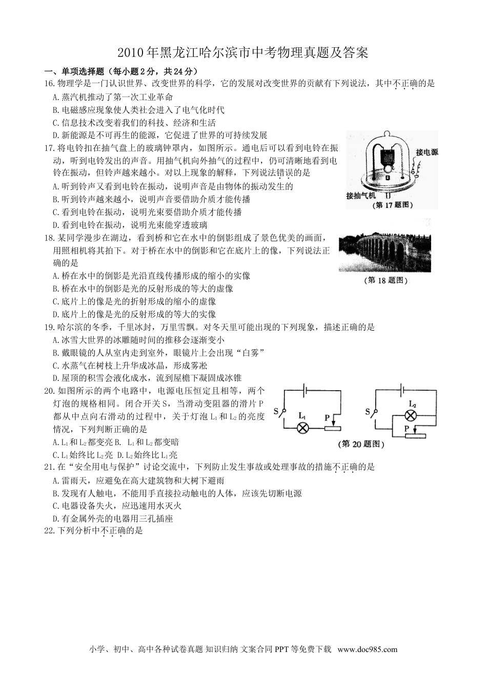 2010年黑龙江哈尔滨市中考物理真题及答案一、单项选择题(每小题2分,共24分)16.物理学是一门认识世界、改变世界的科学,它的发展对改变世界的贡献有下列说法,其中不正确的是A.蒸汽机推动了第一次工业革命B.电磁感应现象使人类社会进入了电气化时代C.信息技术改变着我们的科技、经济和生活D.新能源是不可再生的能源,它促进了世界的可持续发展17.将电铃扣在抽气盘上的玻璃钟罩内,如图所示。通电后可以看到电铃在振动,听到电铃发出的声音。用抽气机向外抽气的过程中,仍可清晰地看到电铃在振动,但铃声越来越小。对以上现象的解释,下列说法错误的是A.听到铃声又看到电铃在振动,说明声音是由物体的振动发生的B.听到铃声越来越小,说明声音要借助介质才能传播C.看到电铃在振动,说明光束要借助介质才能传播D.看到电铃在振动,说明光束能穿透玻璃18.某同学漫步在湖边,看到桥和它在水中的倒影组成了景色优美的画面,用照相机将其拍下。对于桥在水中的倒影和它在底片上的像,下列说法正确的是A.桥在水中的倒影是光沿直线传播形成的缩小的实像B.桥在水中的倒影是光的反射形成的等大的虚像C.底片上的像是光的折射形成的缩小的虚像D.底片上的像是光的反射形成的等大的实像19.哈尔滨的冬季,千里冰封,万里雪飘。对冬天里可能出现的下列现象,描述正确的是A.冰雪大世界的冰雕随时间的推移会逐渐变小B.戴眼镜的人从室内走到室外,眼镜片上会出现“白雾”C.水蒸气在树枝上升华成冰晶,形成雾凇D.屋顶的积雪会液化成水,流到屋檐下凝固成冰锥20.如图所示的两个电路中,电源电压恒定且相等,两个灯泡的规格相同。闭合开关S,当滑动变阻器的滑片P都从中点向右滑动的过程中,关于灯泡L1和L2的亮度情况,下列判断正确的是A.L1和L2都变亮B.L1和L2都变暗C.L1始终比L2亮D.L2始终比L1亮21.在“安全用电与保护”讨论交流中,下列防止发生事故或处理事故的措施不正确的是A.雷雨天,应避免在高大建筑物和大树下避雨B.发现有人触电,不能用手直接拉动触电的人体,应该先切断电源C.电器设备失火,应迅速用水灭火D.有金属外壳的电器用三孔插座22.下列分析中不正确的是小学、初中、高中各种试卷真题知识归纳文案合同PPT等免费下载www.doc985.comA.甲图试管内水沸腾后,撤掉酒精灯,向外拉动注射器活塞,水又沸腾了,说明水的沸点与气压有关B.乙图中吸盘能将物体挂在墙上不掉下来,是因为重力与大气压力彼此平衡C.丙图所示的托里拆利实验中,若有空气进入玻璃管内,则测出的大气压强值比实际值偏小D.丁图提供的信息说明大气压强是天气预报的重要气象要素之一23.在实验探究活动中,某同学将微小压强计的探头先后放入两种不同液体中,根据如图所示提供的信息能够探究的是A.液体内部的压强跟液体密度的关系B.液体内部的压强跟深度的关系C.在同一深度,液体向各个方向的压强大小是否相等D.液体内部向各个方向是否都有压强24.对于“探究电流跟电阻的关系”和“伏安法测量电阻”的这两个实验,下列说法不正确的是A.它们都是采用控制变量的研究方法B.它们的实验电路在教科书中是相同的C.前者多次测量的目的是分析多组数据,得出电流跟电阻的关系D.后者多次测量的目的是取电阻的平均值,减小误差25.下列是同学们在家庭实验室中的一些小制作、小发明,对其解释不正确的是A.甲图中用圆珠笔芯制作的密度计,铜笔头向下是为了降低重心,增加稳定性B.乙图是制作的水气压计,试管口的塞子要多打孔与大气相通C.丙图潜艇的制作原理是通过排水、吸水的方法改变其重力,实现沉与浮D.丁图是一个冷热水混合淋浴器,它利用了伯努利原理26.在我国古代书籍《墨经》中,对杠杆原理有精辟论述,并有许多巧妙的应用。如图所示是在井上汲水的桔槔,下列对桔槔在使用中不正确的解释是A.向井内放送水桶时,人对配重(石块)做功,使配重的重力势能增大B.向井内放送水桶时,人用的力气一定小于水桶的重力,所以省力C.往上提水时,配重(石块)帮助人对水桶做功,配重的重力势能减小D.往上提水时,人用的力气一定小于桶与水的总重,所以省力27.某同学在做“调节灯泡亮度”的电学实验时,电路如图所示,电源电压恒为4.5V,电压表量程“0~3V”...