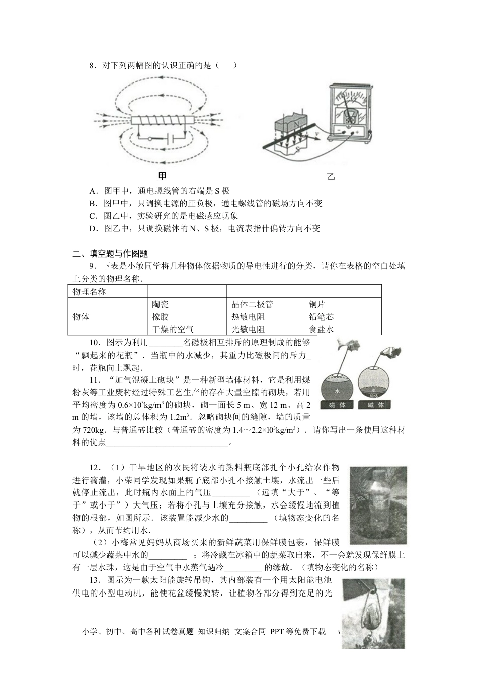 小学、初中、高中各种试卷真题知识归纳文案合同PPT等免费下载www.doc985.com2010年陕西中考物理试题一、选择题1.清晨,小鸟清脆的叫声让我们心情舒畅.关于小鸟的叫声,下列说法正确的是()A.小鸟的叫声是由它的发声器官振动产生的B.小鸟的叫声只能在空气中传播C.口技演员主要模仿的是小鸟叫声的响度D.推开窗户后听到小鸟的叫声变大,是因为音调变高了2.对下列列四幅图解释正确的是()A.树的倒影是水面所成的实像B.通过放大镜看到的是物体正立放大实像C.苹果在视网膜上成倒立缩小实像D.红绿蓝三色光可以混合成白光3.下列关于安全用电做法正确的是()A.在户外遇到雷雨的时候,应到大树下躲避B.更换电灯泡时,应先切断电源C.遇到有人触电,应立即用手将他拉离带电体D.用电器在使用时起火,应立即用水浇灭4.鱼在水中是靠改变自身体积实现上浮和下沉的,下列分析正确的是()A.鱼在上浮过程中,水对它的压强逐渐增大B.鱼往下潜过程中,体积减小浮力不变C.鱼在水中静止时,它受到的浮力和重力的大小不相等D.水面下游动的鱼体积变大时,它受到的浮力也会变大5.下列说法错误的是()A.用筷子夹菜时,筷子是费力杠杆B.扫地时,尘土飞扬,说明分子在做热运动C.太阳、地球、乒乓球、分子、电子是按物体尺度由大到小排序的D.相距较近的两艘船平行向前快速行驶时容易相撞,是因为流体压强与流速有关6.有一款不用充电的新型手机,其核心技术是利用了通话时声波的能量,下列说法错误的是()A.这种手机具有把声能转化为电能的功能B.手机是通过电磁波传递信息的C.电磁波的频率越高,它的波长越长D.电磁波在空气中的传播速度约为3×108m/s7.火箭常用液态氢作燃料,相同质量的氢和汽油完全燃烧,氢放出的热量约为汽油的3倍.下列说法正确的是()A.火箭发动机是一种热机B.氢的热值约为汽油热值的三分之一C.火箭上升时,以发射塔为参照物,火箭是静止的D.火箭加速上升过程中,机械能保持不变小学、初中、高中各种试卷真题知识归纳文案合同PPT等免费下载www.doc985.com8.对下列两幅图的认识正确的是()A.图甲中,通电螺线管的右端是S极B.图甲中,只调换电源的正负极,通电螺线管的磁场方向不变C.图乙中,实验研究的是电磁感应现象D.图乙中,只调换磁体的N、S极,电流表指什偏转方向不变二、填空题与作图题9.下表是小敏同学将几种物体依据物质的导电性进行的分类,请你在表格的空白处填上分类的物理名称.物理名称物体陶瓷橡胶干燥的空气晶体二极管热敏电阻光敏电阻铜片铅笔芯食盐水10.图示为利用________名磁极相互排斥的原理制成的能够“飘起来的花瓶”.当瓶中的水减少,其重力比磁极间的斥力时,花瓶向上飘起.11.“加气混凝土砌块”是一种新型墙体材料,它是利用煤粉灰等工业废树经过特殊工艺生产的存在大量空隙的砌块,若用平均密度为0.6×103kg/m3的砌块,砌一面长5m、宽12m、高2m的墙,该墙的总体积为1.2m3.忽略砌块间的缝隙,墙的质量为720kg.与普通砖比较(普通砖的密度为1.4~2.2×l03kg/m3).请你写出一条使用这种材料的优点_____________________________。12.(1)干旱地区的农民将装水的熟料瓶底部扎个小孔给农作物进行滴灌,小荣同学发现如果瓶子底部小孔不接触土壤,水流出一些后就停止流出,此时瓶内水面上的气压_________(远填“大于”、“等于”或小于”)大气压;若将小孔与土壤充分接触,水会缓慢地流到植物的根部,如图所示.该装置能减少水的_________(填物态变化的名称),从而节约用水.(2)小梅常见妈妈从商场买来的新鲜蔬菜用保鲜膜包裹,保鲜膜可以碱少蔬菜中水的_________;将冷藏在冰箱中的蔬菜取出来,不一会就发现保鲜膜上有一层水珠,这是由于空气中水蒸气遇冷_________的缘故.(填物态变化的名称)13.图示为一款太阳能旋转吊钩,其内部装有一个用太阳能电池供电的小型电动机,能使花盆缓慢旋转,让植物各部分得到充足的光小学、初中、高中各种试卷真题知识归纳文案合同PPT等免费下载www.doc985.com照,太阳能属于_________(选填“可再生”或“不可再生”)能源.太阳能电池可以将太阳能转化为_________...