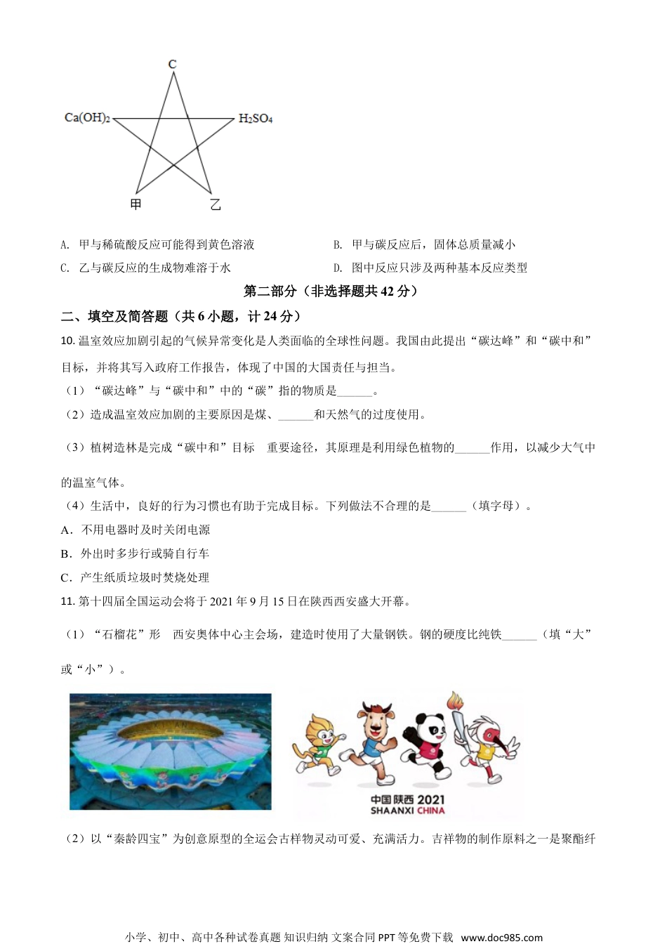 2021年陕西省初中学业水平考试化学学科A卷可能用到的相对原子质量:H-1O-16Ma-23S-32第一部分(选择题共18分)一、选择题(共9小题,每小题2分,计18分。每小题只有一个选项是符合题意的)1.分辨物质是学习化学的基本要求。下列物质属于氧化物的是A.醋B.冰C.土D.银2.下列图示实验中能明显观察到发生化学变化的是A.B.C.D.3.化学为人类作出巨大贡献。下列说法不正确的是A.合理使用加碘食盐,能有效预防甲状腺肿大B.图书档案失火用液态二氧化碳扑灭有利于保护图书资料C.新材料的推广应用,极大改善了人类的生活质量D.加大化石燃料的开发,以满足不断增长的能源需求4.下列物质在氧气中燃烧时,生成黑色固体的是A.木炭B.红磷C.铁丝D.镁带5.规范操作是实验成功的基础。下列操作正确的是A.溶解粗盐B.称烧碱质量小学、初中、高中各种试卷真题知识归纳文案合同PPT等免费下载www.doc985.comC.滴加盐酸D.加热水6.宏观辨识与微观探析是化学学科的核心素养之一。对下列事实的微观解释不正确的是A.金刚石和石墨的物理性质差异大——碳原子的排列方式不同B.夏天汽车轮胎爆炸——轮胎内气体分子变大C.化学反应前后各物质质量总和不变——反应前后原子的种类、数目、质量均不改变D.氯化钠溶液能导电——溶液中存在可自由移动的离子7.下列关于H2、H2O、H2O2三种物质的说法正确的是A.均含有1个氢分子B.均含有2个氢原子C.均含有氢元素D.均含有2个氢离子8.如图,室温下,盛水的烧杯内放置两支分别盛有等质量KNO3溶液和饱和石灰水的试管甲和乙,向烧杯内的水中加入NH4NO3固体后,甲中未观察到明显现象。下列说法正确的是A.乙中溶液一定变浑浊B.甲中溶液一定变成饱和溶液C.乙中溶液溶质的质量分数一定变小D.甲、乙中溶液质量一定相等9.小明利用初中化学常见的五种物质之间的相互反应关系,整理出如下的反应“”图,图中“一”两端的物质相互能反应。下列说法不正确的是小学、初中、高中各种试卷真题知识归纳文案合同PPT等免费下载www.doc985.comA.甲与稀硫酸反应可能得到黄色溶液B.甲与碳反应后,固体总质量减小C.乙与碳反应的生成物难溶于水D.图中反应只涉及两种基本反应类型第二部分(非选择题共42分)二、填空及简答题(共6小题,计24分)10.温室效应加剧引起的气候异常变化是人类面临的全球性问题。我国由此提出“碳达峰”和“碳中和”目标,并将其写入政府工作报告,体现了中国的大国责任与担当。(1)“碳达峰”与“碳中和”中的“碳”指的物质是______。(2)造成温室效应加剧的主要原因是煤、______和天然气的过度使用。(3)植树造林是完成“碳中和”目标的重要途径,其原理是利用绿色植物的______作用,以减少大气中的温室气体。(4)生活中,良好的行为习惯也有助于完成目标。下列做法不合理的是______(填字母)。A.不用电器时及时关闭电源B.外出时多步行或骑自行车C.产生纸质垃圾时焚烧处理11.第十四届全国运动会将于2021年9月15日在陕西西安盛大开幕。(1)“石榴花”形的西安奥体中心主会场,建造时使用了大量钢铁。钢的硬度比纯铁______(填“大”或“小”)。(2)以“秦龄四宝”为创意原型的全运会古样物灵动可爱、充满活力。吉祥物的制作原料之一是聚酯纤小学、初中、高中各种试卷真题知识归纳文案合同PPT等免费下载www.doc985.com维,聚酯纤维属于______(填“合成”或“天然”)纤维。(3)热情好客的陕西人民将会为运动员提供丰富的陕西美食。肉夹馍是美食之一,馍提供的有机营养素主要是______。(4)全运村的绿植养护需要用到营养液,下列营养液的成分中属于复合肥的是______(填序号)。①(NH4)2SO4②KNO3③Ca(H2PO4)212.我国嫦娥五号月球探测成功将月球上的岩石和土壤带回地球。(1)发射探测器使用的推进剂是液氢和液氧,液氢燃烧的化学方程式为______。(2)嫦娥五号的登月着陆器使用的是砷化镓太阳能电池,砷的原子结构示意图为,则x为______。(3)月球岩石中富含钛铁矿,其主要成分是FeTiO3,其中钛(Ti)元素的化合价为+4,则铁元素的化合价为______。13.金属的发现与使用历史体现了人们对其性质的认识和科技发展的水平。(1)2021年3月,三星堆遗址再次出土的文物...