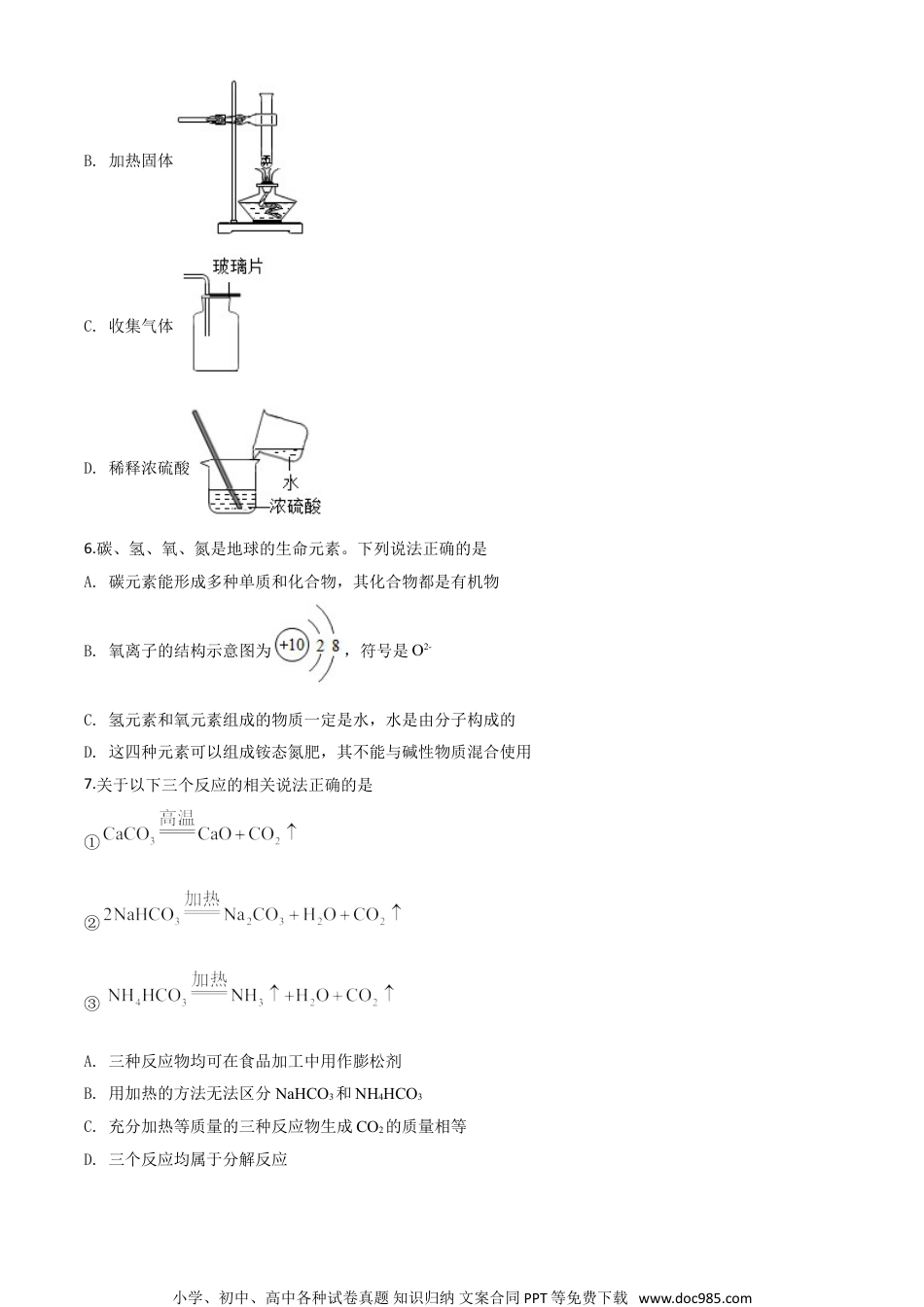 2020年陕西省中考化学试题可能用到的相对原子质量:H-1C-12N-14O-16Na-23Cl-35.5Ca-40Fe-56第一部分(选择题共18分)一、选择題(共9小题,每小题2分,计18分。每小题只有一个选项是符合题意的)1.认识物质是学习化学的基础。下列物质属于单质的是A.空气B.干冰C.液氧D.生铁2.变化无处不在。生活中的下列现象是由化学变化引起的是A.柏油路面曝晒变软B.水放冰箱结成冰块C.铜器锈蚀颜色变绿D.电流过大灯丝熔断3.化学是人类进步的阶梯。下列说法不正确的是A.新能源的推广利用,节约了化石燃料B.新材料应用于航空制造,利用的都是其物理性质C.煤炭的脱硫处理,能有效减少酸雨的形成D.新药品的研发,可为生命健康提供保障4.日常生活中的下列做法不正确的是A.将饮料瓶放入厨余垃圾桶B.用肥皂水区分软水和硬水C.使用煤炉时打开窗户保持空气流通D.用活性炭除去冰箱中的异味5.正确的实验操作是进行科学探究的基本要求。下列操作正确的是A.量液体体积小学、初中、高中各种试卷真题知识归纳文案合同PPT等免费下载www.doc985.comB.加热固体C.收集气体D.稀释浓硫酸6.碳、氢、氧、氮是地球的生命元素。下列说法正确的是A.碳元素能形成多种单质和化合物,其化合物都是有机物B.氧离子的结构示意图为,符号是O2-C.氢元素和氧元素组成的物质一定是水,水是由分子构成的D.这四种元素可以组成铵态氮肥,其不能与碱性物质混合使用7.关于以下三个反应的相关说法正确的是①②③A.三种反应物均可在食品加工中用作膨松剂B.用加热的方法无法区分NaHCO3和NH4HCO3C.充分加热等质量的三种反应物生成CO2的质量相等D.三个反应均属于分解反应小学、初中、高中各种试卷真题知识归纳文案合同PPT等免费下载www.doc985.com8.下列各组实验方法能达到实验目的的是选项实验目的实验方法A验证Mg、Cu、Ag三种金属的活动性顺序向硫酸铜溶液和硝酸银溶液中各放入一根镁条,观察现象B检验黑色固体中含有碳和氧化铜高温加热固体,并将生成的气体通入澄清石灰水中,观察固体颜色及石灰水的变化C除去Na2CO3中的NaCl溶解,加入过量CaCl2溶液,过滤,蒸发D探究铁钉生锈的条件将两根铁钉分别密封在盛有干燥空气和盛满水的试管中观察现象A.AB.BC.CD.D9.某溶液中溶质可能是HCl、Na2CO3、H2SO4、CuC12中的一种或多种,为探究溶质的成分,兴趣小组的同学向盛有一定量样品的烧杯中逐滴加入Ba(OH)2稀溶液,产生沉淀的质量与加入Ba(OH)2溶液质量的变化趋势如下图所示。下列有关说法不正确的是A.原溶液中一定没有Na2CO3和H2SO4B.b点对应烧杯内溶液中只有一种溶质C.c点对应烧杯内溶液中的阴离子只有OH-D.沉淀出现前烧杯内溶液的pH不断增大第二部分(非选择题共42分)二、填空及简答题(共6小题,计24分)10.在抗击“新冠肺炎”疫情的战斗中,人们采取了一系列行之有效的防控措施。(1)口罩是防疫的必备品,其生产原料中用到的聚丙烯属于___(填“无机非金属材料”或“有机合成材料”)。小学、初中、高中各种试卷真题知识归纳文案合同PPT等免费下载www.doc985.com(2)洗手、消毒能有效防止病毒感染。“84”消毒液能迅速杀菌消毒其有效成分NaClO中氯元素的化合价为________。(3)测量体温是防控的重要环节。家庭常备体温计中的液态物质是________。(4)加强营养有利于增强体质合理补充维生素能提高人体免疫力。下列食品中富含维生素的是_______(填字母)。A鸡肉B黄瓜C面包11.文房四宝“笔、墨、纸、砚”承载着优秀的中华传统文化。(1)制作毛笔常用羊毛、兔毛等,检验笔毛是动物毛发的简易方法是_______。(2)用墨汁写绘的字画能从古代保存至今而不褪色,是因为常温下碳的化学性质很_______(填“稳定”或“不稳定”)。(3)宣纸制作过程中有道工序是从纸浆中用竹帘捞纸,该操作相当于_______(填字母)。A蒸发B过滤C结晶(4)砚台产地不同,成分也有差别,但其中的主要成分都_______(填“易溶”或“难溶”)于水。12.含义丰富的化学符号是独特的化学语言。根据以下符号回答:①2N2②A13+③2H④SO⑤CH4(1)能表示宏观物质的是______(填序号)(2)①表示两个______。(3)由②和④构成的物质的化学式为______。(4)⑤中数字“4”...