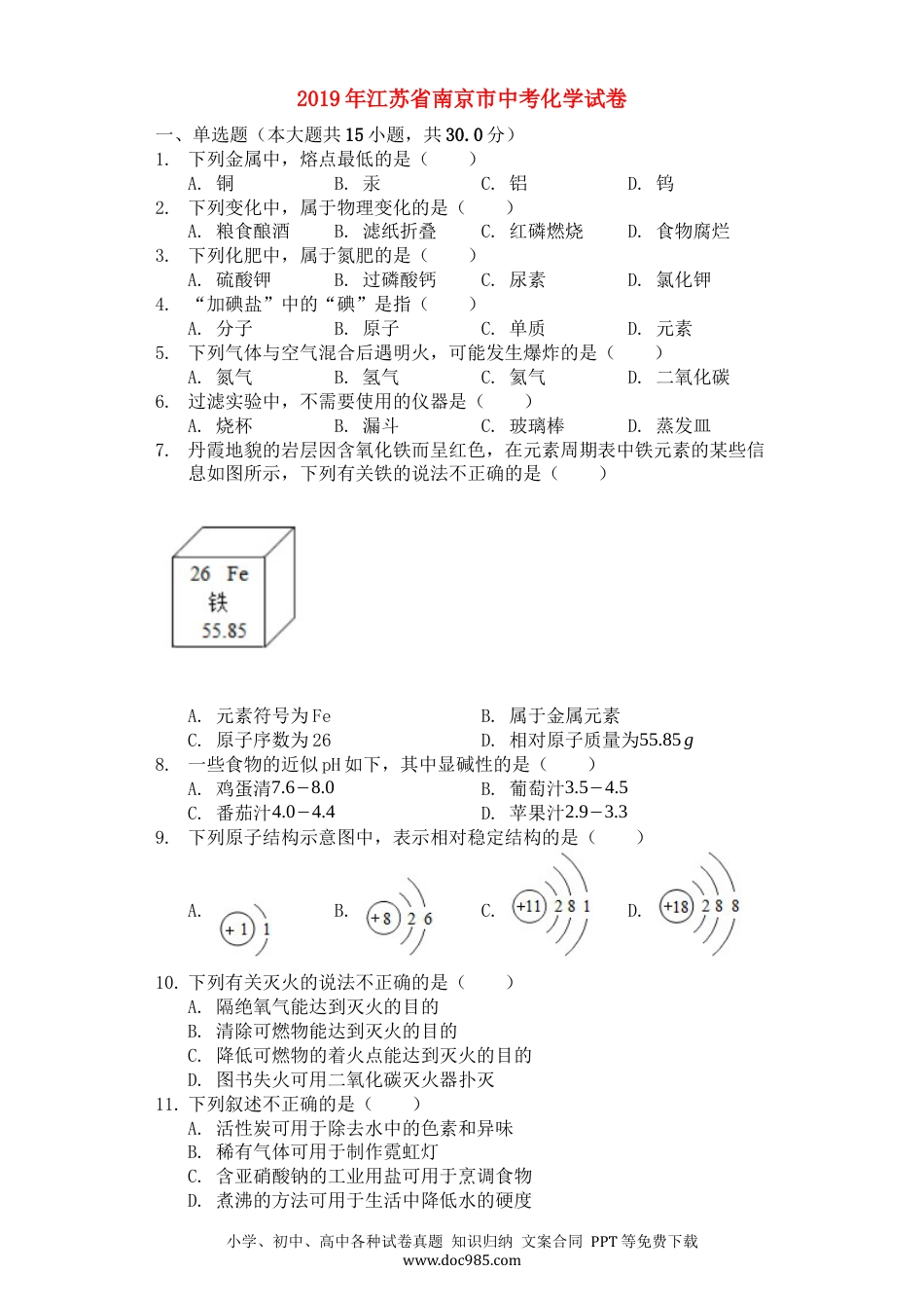 小学、初中、高中各种试卷真题知识归纳文案合同PPT等免费下载www.doc985.com2019年江苏省南京市中考化学试卷一、单选题(本大题共15小题,共30.0分)1.下列金属中,熔点最低的是()A.铜B.汞C.铝D.钨2.下列变化中,属于物理变化的是()A.粮食酿酒B.滤纸折叠C.红磷燃烧D.食物腐烂3.下列化肥中,属于氮肥的是()A.硫酸钾B.过磷酸钙C.尿素D.氯化钾4.“加碘盐”中的“碘”是指()A.分子B.原子C.单质D.元素5.下列气体与空气混合后遇明火,可能发生爆炸的是()A.氮气B.氢气C.氦气D.二氧化碳6.过滤实验中,不需要使用的仪器是()A.烧杯B.漏斗C.玻璃棒D.蒸发皿7.丹霞地貌的岩层因含氧化铁而呈红色,在元素周期表中铁元素的某些信息如图所示,下列有关铁的说法不正确的是()A.元素符号为FeB.属于金属元素C.原子序数为26D.相对原子质量为55.85g8.一些食物的近似pH如下,其中显碱性的是()A.鸡蛋清7.6−8.0B.葡萄汁3.5−4.5C.番茄汁4.0−4.4D.苹果汁2.9−3.39.下列原子结构示意图中,表示相对稳定结构的是()A.B.C.D.10.下列有关灭火的说法不正确的是()A.隔绝氧气能达到灭火的目的B.清除可燃物能达到灭火的目的C.降低可燃物的着火点能达到灭火的目的D.图书失火可用二氧化碳灭火器扑灭11.下列叙述不正确的是()A.活性炭可用于除去水中的色素和异味B.稀有气体可用于制作霓虹灯C.含亚硝酸钠的工业用盐可用于烹调食物D.煮沸的方法可用于生活中降低水的硬度小学、初中、高中各种试卷真题知识归纳文案合同PPT等免费下载www.doc985.com12.下列各组离子在水中能大量共存的是()A.K+¿¿、H+¿¿、CO32−¿¿、Cl−¿¿B.Na+¿¿、NH4+¿¿、Cl−¿¿、NO3−¿¿C.Cu2+¿¿、Na+¿¿、OH−¿¿、SO42−¿¿D.K+¿¿、H+¿¿、OH−¿¿、SO42−¿¿13.下表中的物质、主要成分的化学式及用途三者对应关系不正确的是()选项物质主要化学成分用途A石灰浆CaO可改良酸性土壤B沼气CH4可作燃料C大理石CaCO3可作建筑材料D75%的乙醇溶液C2H5OH可作医用消毒剂A.AB.BC.CD.D14.荧光棒中含有H2O2溶液。下列有关说法中正确的是()A.H2O2溶液是氧化物B.H2O2中氢分子和氧分子的个数比为1:1C.CuSO4溶液对H2O2分解具有催化作用D.5%的H2O2溶液中氢元素的质量分数约为0.3%15.除去下列物质中混有的少量杂质(括号内为杂质),拟定的实验方案不可行的是()A.N2气体(O2)--通过灼热的铜网B.木炭粉(CuO)--在空气中灼烧C.KCl固体(MnO2)--加入足量的水溶解,过滤,蒸发结晶D.FeCl2溶液(CuCl2)--加入过量的铁粉,过滤二、填空题(本大题共2小题,共15.0分)16.化学就在我们身边,人类的生活离不开化学。(1)人类为了维持生命和健康,必须摄取食物。基本营养素包括______六大类。(2)人们穿的衣服通常是由纤维织成的。下列属于天然纤维的是______(填字母)。A.棉花B.尼龙C.蚕丝D.涤纶(3)塑料制品的使用方便了人类的生活,但废弃塑料带来的“白色污染”尤为严重。要解决“白色污染”问题可以采取的措施是______(填字母)。A.减少使用不必要的塑料制品B.重复使用某些塑料制品C.回收各种废弃塑料D.使用一些新型的、可降解的塑料(4)石油是一种重要的化石燃料,人们利用石油可以炼制多种产品,如柴油、煤油、汽油等。请设计实验证明煤油中含有碳元素并完成实验报告。实验步骤实验现象实验结论__________________17.溶液在生活、生产中具有广泛的用途。(1)在20℃时,将20g氯化钾固体加入50g水中,充分搅拌后,仍有小学、初中、高中各种试卷真题知识归纳文案合同PPT等免费下载www.doc985.com3g氯化钾固体未溶解。所得溶液中氯化钾的质量分数为______(计算结果保留一位小数);20℃时氯化钾的溶解度为______。(2)甲、乙两种不含结晶水的固体物质的溶解度曲线如图。t1℃时,甲溶液的溶质质量分数与乙溶液的溶质质量分数相比,前者与后者的关系是______(填字母)。A.大于B.小于C.等于D.无法确定(3)如图是实验室稀释浓硫酸的正确和错误操作,请说明不能将水直接倒入浓硫酸中进行稀释的原因______。三、推断题(本大题共1小题,共6.0分)18.图中A-J是初中化学常见的化合物。A和B物质类别相同,只有C、...