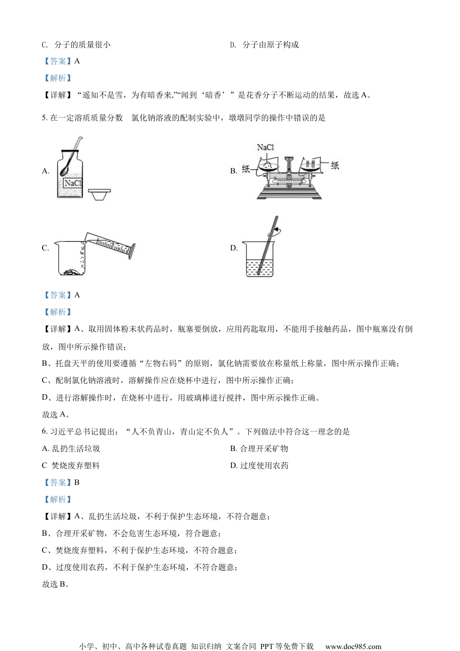 小学、初中、高中各种试卷真题知识归纳文案合同PPT等免费下载www.doc985.com化学可能用到的相对原子质量:C-12O-16一、单项选择题(每小题分,共10分)1.“吉林终有吉临时长春定复往常春”,表达了吉林人民抗击新冠疫情的必胜信念。下列防疫措施中涉及到化学变化的是A.测体温B.戴口罩C.常通风D.勤消毒【答案】D【解析】【详解】A、测量体温的过程中,没有新物质生成,属于物理变化,故选项错误;B、戴口罩,没有新物质生成,属于物理变化,故选项错误;C、通风的过程中,没有新物质生成,属于物理变化,故选项错误;D、消毒的过程中能将细菌杀死,有新物质生成,属于化学变化,故选项正确。故选D。2.下列气体属于空气污染物的是A.二氧化氮B.二氧化碳C.氧气D.氮气【答案】A【解析】【详解】目前计入空气质量评价的主要污染物为:一氧化碳、二氧化氮、二氧化硫、可吸入颗粒物、臭氧等,故选A。3.下列食物富含蛋白质的是A.苹果B.海带C.鸡肉D.米饭【答案】C【解析】【详解】A.苹果富含维生素,此选项不符合题意;B.海带富含维生素,此选项不符合题意;C.鸡肉富含蛋白质,此选项符合题意;D.米饭富含糖类,此选项不符合题意。故选C。4.王安石在《梅花》中写道:“墙角数枝梅,凌寒独自开。遥知不是雪,为有暗香来。”“闻到‘暗香’”说明了A.分子在不断运动B.分子间有间隔小学、初中、高中各种试卷真题知识归纳文案合同PPT等免费下载www.doc985.comC.分子的质量很小D.分子由原子构成【答案】A【解析】【详解】“遥知不是雪,为有暗香来,”“闻到‘暗香’”是花香分子不断运动的结果,故选A。5.在一定溶质质量分数的氯化钠溶液的配制实验中,墩墩同学的操作中错误的是A.B.C.D.【答案】A【解析】【详解】A、取用固体粉末状药品时,瓶塞要倒放,应用药匙取用,不能用手接触药品,图中瓶塞没有倒放,图中所示操作错误;B、托盘天平的使用要遵循“左物右码”的原则,氯化钠需要放在称量纸上称量,图中所示操作正确;C、配制氯化钠溶液时,溶解操作应在烧杯中进行,图中所示操作正确;D、进行溶解操作时,在烧杯中进行,用玻璃棒进行搅拌,图中所示操作正确。故选A。6.习近平总书记提出:“人不负青山,青山定不负人”。下列做法中符合这一理念的是A.乱扔生活垃圾B.合理开采矿物C.焚烧废弃塑料D.过度使用农药【答案】B【解析】【详解】A、乱扔生活垃圾,不利于保护生态环境,不符合题意;B、合理开采矿物,不会危害生态环境,符合题意;C、焚烧废弃塑料,不利于保护生态环境,不符合题意;D、过度使用农药,不利于保护生态环境,不符合题意;故选B。小学、初中、高中各种试卷真题知识归纳文案合同PPT等免费下载www.doc985.com7.碳元素能组成多种单质。下列关于碳单质的说法中正确的是A.硬度都很大B.都可用于制造铅笔芯C.都是黑色固体D.常温下化学性质都不活泼【答案】D【解析】【详解】A、由于碳原子的排列方式不同,金刚石和石墨的性质存在差异,金刚石的硬度很大,石墨的质地软,故A不符合题意;B、金刚石的硬度很大,不能用于制造铅笔芯,石墨的质地软,可用于制造铅笔芯,故B不符合题意;C、纯净的金刚石是无色透明的正八面体形状的固体,故C不符合题意;D、常温下碳单质的化学性质都不活泼,故D符合题意。故选D。8.从不同角度认识下图中的反应,其中错误的是A.宏观现象:氢气在氯气中燃烧B.微观解析:反应前后原子种类不变C.符号描述:D.实践应用:工业上可用于制取盐酸【答案】C【解析】【详解】A、由图知,从宏观的角度说,该反应是氢气和氯气在点燃的条件下反应生成氯化氢,宏观现象是氢气在氯气中燃烧,故A不符合题意;B、由图知,反应前,氢气分子由氢原子构成,氯气分子由氯原子构成,反应后氯化氢分子由氢原子和氯原子构成,反应前后原子种类不变,故B不符合题意;C、由图知,该反应是氢气和氯气在点燃的条件下反应生成氯化氢,反应的化学方程式为:,故C符合题意;小学、初中、高中各种试卷真题知识归纳文案合同PPT等免费下载www.doc985.comD、氢气和氯气在点燃的条件下反应生成氯化氢,该反应在工业上可用于制取盐酸,故D不符合题意。故选C。9.下列关于NaOH和Ca(OH)2的用途中错误...