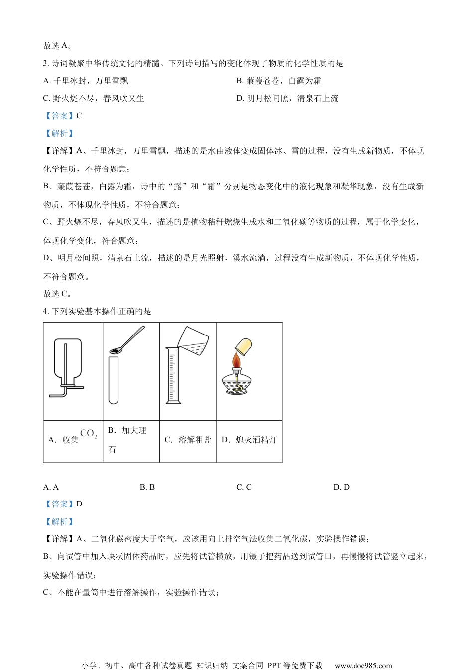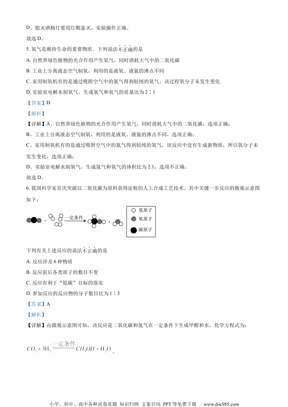 小学、初中、高中各种试卷真题知识归纳文案合同PPT等免费下载www.doc985.com2023年陕西省初中学业水平考试化学试卷(考试时间:90分钟满分:100分)注意事项:1.本试卷分为第一部分(选择题)和第二部分(非选择题)。全卷共6页,总分60分。考试时间60分钟。2.领到试卷和答题卡后。请用0.5毫米黑色墨水签字笔,分别在试卷和答题卡上填写姓名和准考证号,同时用2B铅笔在答题卡上填涂对应的试卷类型信息点(A或B)。3.请在答题卡上各题的指定区域内作答。否则作答无效。4.考试结束,本试卷和答题卡一井交回。可能用到的相对原子质量:H—1O—16S—32Fe—35.5Ba—137第一部分(选择题共18分)一、选择题(共20小题,每小题2分,计18分。每小题只有一个选项是符合题意的)1.碳元素是组成物质种类最多的元素。下列物质只含碳元素的是A.石灰石B.金刚石C.碳酸D.石蜡【答案】B【解析】【详解】A、石灰石的主要成分是碳酸钙,石灰石是混合物,不符合题意;B、金刚石是只由碳元素组成的单质,符合题意;C、碳酸是由碳元素、氧元素、氢元素组成的化合物,不符合题意;D、石蜡是含有多种元素的混合物,不符合题意。故选B。2.下列生活中常见物质的化学式书写正确的是A.冰:B.铁锈:C.黄铜:CuD.食盐:【答案】A【解析】【详解】A、冰是由水分子构成的,水分子的化学式为H2O,故选项表达正确;B、铁锈的主要成分为Fe2O3,铁锈属于混合物,没有固定的化学式,故选项表达错误;C、黄铜是Cu、Zn组成的合金,属于混合物,没有固定的化学式,故选项表达错误;D、食盐是氯化钠的俗称,氯化钠的化学式为NaCl,故选项表达错误。小学、初中、高中各种试卷真题知识归纳文案合同PPT等免费下载www.doc985.com故选A。3.诗词凝聚中华传统文化的精髓。下列诗句描写的变化体现了物质的化学性质的是A.千里冰封,万里雪飘B.蒹葭苍苍,白露为霜C.野火烧不尽,春风吹又生D.明月松间照,清泉石上流【答案】C【解析】【详解】A、千里冰封,万里雪飘,描述的是水由液体变成固体冰、雪的过程,没有生成新物质,不体现化学性质,不符合题意;B、蒹葭苍苍,白露为霜,诗中的“露”和“霜”分别是物态变化中的液化现象和凝华现象,没有生成新物质,不体现化学性质,不符合题意;C、野火烧不尽,春风吹又生,描述的是植物秸秆燃烧生成水和二氧化碳等物质的过程,属于化学变化,体现化学变化,符合题意;D、明月松间照,清泉石上流,描述的是月光照射,溪水流淌,过程没有生成新物质,不体现化学性质,不符合题意。故选C。4.下列实验基本操作正确的是A.收集B.加大理石C.溶解粗盐D.熄灭酒精灯A.AB.BC.CD.D【答案】D【解析】【详解】A、二氧化碳密度大于空气,应该用向上排空气法收集二氧化碳,实验操作错误;B、向试管中加入块状固体药品时,应先将试管横放,用镊子把药品送到试管口,再慢慢将试管竖立起来,实验操作错误;C、不能在量筒中进行溶解操作,实验操作错误;小学、初中、高中各种试卷真题知识归纳文案合同PPT等免费下载www.doc985.comD、熄灭酒精灯要用灯帽盖灭,实验操作正确。故选D。5.氧气是维持生命的重要物质。下列说法不正确的是A.自然界绿色植物的光合作用产生氧气,同时消耗大气中的二氧化碳B.工业上分离液态空气制氧,利用的是液氧、液氮的沸点不同C.家用制氧机有的是通过吸附空气中的氮气得到较纯的氧气,该过程氧分子未发生变化D.实验室电解水制氧气,生成氢气和氧气的质量比为2∶1【答案】D【解析】【详解】A、自然界绿色植物的光合作用产生氧气,同时消耗大气中的二氧化碳,选项正确;B、工业上分离液态空气制氧,利用的是液氧、液氮的沸点不同,选项正确;C、家用制氧机有的是通过吸附空气中的氮气得到较纯的氧气,该反应中没有生成新物质,所以氧分子未发生变化,选项正确;D、实验室电解水制氧气,生成氢气和氧气的体积比为2:1,选项不正确。故选D。6.我国科学家首次突破以二氧化碳为原料获得淀粉的人工合成工艺技术。其中关键一步反应的微观示意图如下:下列有关上述反应的说法不正确的是A.反应涉及6种物质B.反应前后各类原子的数目不变C.反应有利于“低碳”目标的落实D.参加反应的反应物的分子数目比为1∶3...