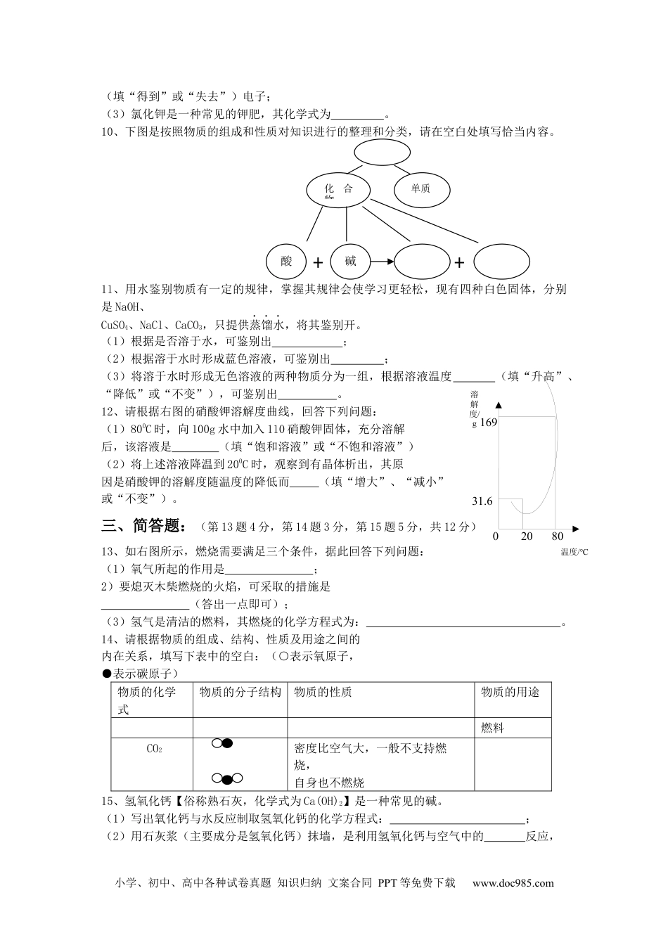 小学、初中、高中各种试卷真题知识归纳文案合同PPT等免费下载www.doc985.com2009年吉林省中考化学试题可能用到的相对原子质量:S—320—16Zn—65H—1一、单项选择题:(每小题1分,共8分)1、下图所示的内容不属于化学研究范围的是()ABCD2、下列常见饮品中,不能为人体补充糖类的是()A.苹果汁B.矿泉水C.梨汁D.橙汁3、人体内液体pH与健康密切相关,以下是人体内液体正常pH范围,呈酸性的是()A.胃液0.9~1.5B.胆汁7.1~7.3C.胰液7.5~8.0D.血浆7.35~7.454、用分子——原子的观点分析下列变化,其中分子本身发生改变的是()A.水蒸发B.石蜡熔化C.水通电分解D.试管破裂5、化学学习使我们对物质的性质有了进一步的认识,下列说法错误的是()A.氮气的化学性质活泼B.铜有良好的导电性C.盐酸能除铁锈D.亚硝酸钠有毒6、碳单质存在形式有多种,用途各不相同。下列各图中体现活性炭用途的是()ABCD7、铁是目前应用最广泛的一种金属,下列说法错误的是()A.常见的铁制品大多由铁合金制成B.铁与稀盐酸反应生成H2和FeCl3C.赤铁矿是常见的铁矿石D.地壳里金属元素的含量铁元素居第二位8、在化学学习中,我们接触到很多含CO32-的物质,下列有关说法正确的是()A.实验室经常用大理石和稀硫酸反应制取CO2B.简易泡沫灭火器中用来产生CO2的物质是大理石和稀盐酸C.实验室制CO2最适合的药品是碳酸钠和稀盐酸D.用足量的Na2CO3既能降低废水的酸性又能除去废水里CuSO4中的Cu2+二、填空题:(每空1分,共12分)9、请结合右图提供的信息,回答下列问题:(1)氯元素的原子序数为;(2)氯原子在化学反应中易17Cl氯35.45小学、初中、高中各种试卷真题知识归纳文案合同PPT等免费下载www.doc985.com(填“得到”或“失去”)电子;(3)氯化钾是一种常见的钾肥,其化学式为。10、下图是按照物质的组成和性质对知识进行的整理和分类,请在空白处填写恰当内容。++11、用水鉴别物质有一定的规律,掌握其规律会使学习更轻松,现有四种白色固体,分别是NaOH、CuSO4、NaCl、CaCO3,只提供蒸馏水,将其鉴别开。(1)根据是否溶于水,可鉴别出;(2)根据溶于水时形成蓝色溶液,可鉴别出;(3)将溶于水时形成无色溶液的两种物质分为一组,根据溶液温度(填“升高”、“降低”或“不变”),可鉴别出。12、请根据右图的硝酸钾溶解度曲线,回答下列问题:(1)800C时,向100g水中加入110硝酸钾固体,充分溶解后,该溶液是(填“饱和溶液”或“不饱和溶液”)(2)将上述溶液降温到200C时,观察到有晶体析出,其原因是硝酸钾的溶解度随温度的降低而(填“增大”、“减小”或“不变”)。三、简答题:(第13题4分,第14题3分,第15题5分,共12分)13、如右图所示,燃烧需要满足三个条件,据此回答下列问题:(1)氧气所起的作用是;2)要熄灭木柴燃烧的火焰,可采取的措施是(答出一点即可);(3)氢气是清洁的燃料,其燃烧的化学方程式为:。14、请根据物质的组成、结构、性质及用途之间的内在关系,填写下表中的空白:(○表示氧原子,●表示碳原子)物质的化学式物质的分子结构物质的性质物质的用途燃料CO2密度比空气大,一般不支持燃烧,自身也不燃烧15、氢氧化钙【俗称熟石灰,化学式为Ca(OH)2】是一种常见的碱。(1)写出氧化钙与水反应制取氢氧化钙的化学方程式:;(2)用石灰浆(主要成分是氢氧化钙)抹墙,是利用氢氧化钙与空气中的反应,单质碱化合物酸溶解度/g温度/℃031.62080169小学、初中、高中各种试卷真题知识归纳文案合同PPT等免费下载www.doc985.com生成坚硬的碳酸钙;(3)用石灰水(氢氧化钙溶液)和溶液反应可制取少量的NaOH;(4)写出熟石灰在农业上的应用:(写出一点即可)。四、实验题:(第16题5分,第17题7分,共12分)16、请你和兴趣小组的同学一起配制50g质量分数为6%的NaOH溶液。(1)我们选择的仪器有:玻璃棒、、托盘天平、量筒、胶头滴管、药匙;小明(2)用托盘天平称量3gNaOH固体时,我们应注意:(答出一点即可);小刚(3)如右图用50mL量筒量取水时,你认为三位同学中能够准确量取47mL水的是同学;小强(4)在NaOH固体溶于水的过程中,用玻璃棒不断搅拌,目的是;(5)配...