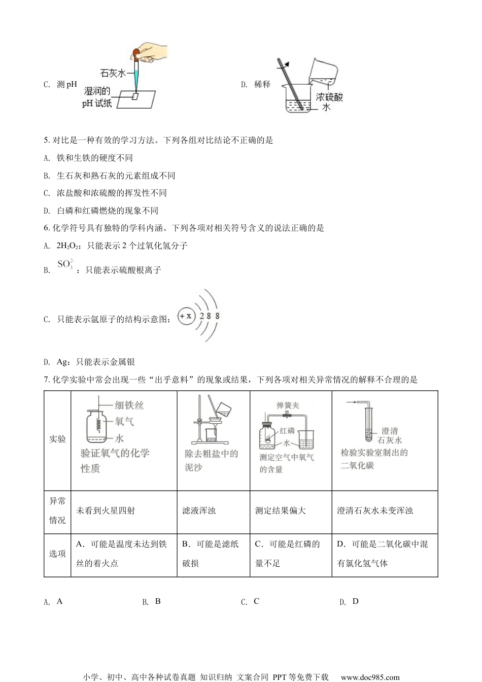 小学、初中、高中各种试卷真题知识归纳文案合同PPT等免费下载www.doc985.com2022年陕西省初中学业水平考试化学试卷注意事项:1.本试卷分为第一部分(选择题)和第二部分(非选择题)。全卷共6页,总分60分。考试时间60分钟。2.领到试卷和答题卡后,请用0.5毫米黑色墨水签字笔,分别在试卷和答题卡上填写姓名和准考证号,同时用2B铅笔在答题卡上填涂对应的试卷类型信息点(A或B)。3.请在答题卡上各题的指定区域内作答,否则作答无效。4.考试结束,本试卷和答题卡一并交回。可能用到的相对原子质量:H一1C一12O一16Ca一40第一部分(选择题共18分)一、选择题(共9小题,每小题2分,计18分。每小题只有一个选项是符合题意的)1.化学物质使世界异彩纷呈。下列物质属于化合物的是A.红色的葡萄酒B.紫色的高锰酸钾C.淡蓝色的液氧D.银白色的不锈钢2.从分子、原子角度认识物质是化学科学的重要特征。下列物质中含有多种分子的是A.甲烷B.空气C.冰水D.黄金3.化学让生活更美好。下列说法正确的是A.制糖工业中用活性炭脱色,利用的是其吸附性B.氦气通电发出粉红色的光,发生的是化学变化C.用干冰营造舞台意境时,看到的白雾是二氧化碳气体D.硬水软化后口感更好,因煮沸时除去了硬水中的所有杂质4.实验操作是实践探究的基础。下列操作正确的是A.溶解B.加热小学、初中、高中各种试卷真题知识归纳文案合同PPT等免费下载www.doc985.comC.测pHD.稀释5.对比是一种有效的学习方法。下列各组对比结论不正确的是A.铁和生铁的硬度不同B.生石灰和熟石灰的元素组成不同C.浓盐酸和浓硫酸的挥发性不同D.白磷和红磷燃烧的现象不同6.化学符号具有独特的学科内涵。下列各项对相关符号含义的说法正确的是A.2H2O2:只能表示2个过氧化氢分子B.:只能表示硫酸根离子C.只能表示氩原子的结构示意图:D.Ag:只能表示金属银7.化学实验中常会出现一些“出乎意料”的现象或结果,下列各项对相关异常情况的解释不合理的是实验异常情况未看到火星四射滤液浑浊测定结果偏大澄清石灰水未变浑浊选项A.可能是温度未达到铁丝的着火点B.可能是滤纸破损C.可能是红磷的量不足D.可能是二氧化碳中混有氯化氢气体A.AB.BC.CD.D小学、初中、高中各种试卷真题知识归纳文案合同PPT等免费下载www.doc985.com8.如图所示,将两枚光亮的铁钉分别用细线吊置于甲、乙中,并使部分铁钉露出液面。放置一段时间,出现了锈蚀。下列说法不正确的是A.甲、乙中,气体含氧气的体积分数不相等B.甲中,铁钉在植物油内的部分没有锈蚀C.乙中,铁钉在水面下的部分锈蚀最严重D.丙中,导管内上升一段水柱9.某工业尾气中可能含有H2、CO和CO2中的一种或几种,为检验其成分,小明同学按下图装置进行实验时,观察到黑色固体变红,澄清石灰水变浑浊,由此实验现象得出尾气的组成情况可能有A.2种B.3种C.4种D.5种第二部分(非选择题共42分)二、填空及简答题(共6小题,计24分)10.洋溢着绿色与科技元素的2022北京冬奥会以中国式的传奇与浪漫惊艳了世界。(1)衣:运动服中高科技材料石墨烯的使用,解决了超低温户外环境下运动员的取暖难题。石墨烯是由___________元素组成的单质。(2)食:人工智能带来的特色餐饮及服务使运动员们大饱口福。豆沙包受到很多人的喜爱,制作包子的面粉中富含的有机营养素是___________。(3)住:奥运村实现了5G网络的全覆盖。制造5G芯片的氮化镓(GaN)材料可由氯化镓(GaCl3)制取,氯化镓中镓元素的化合价为___________。(4)行:冬奥会会务用车均使用氢能源汽车,基本实现了碳的零排放。相比于化石燃料,氢气作为燃料小学、初中、高中各种试卷真题知识归纳文案合同PPT等免费下载www.doc985.com的优点是___________(只写一点)。11.化学在新冠疫情防控中发挥了重要作用,例如防疫关键环节中的灭菌与消毒。(1)免洗手凝胶消毒剂携带方便,使用时会闻到酒精的气味,说明分子在不停地___________。(2)公共场所佩戴口罩已成为防疫常态。生产医用口罩的过程中常用环氧乙烷(C2H4O)灭菌,环氧乙烷中碳、氢、氧三种元素的质量比为___________。(3)日常消杀也是必需的防疫措施。二氧化氯(C1O2)是一种常用消毒剂,其制取的一种原理...