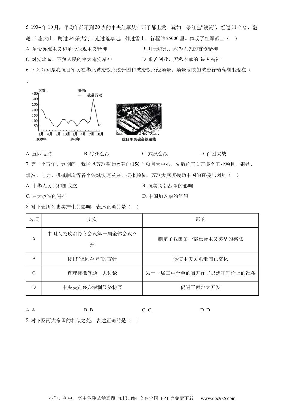 小学、初中、高中各种试卷真题知识归纳文案合同PPT等免费下载www.doc985.com机密★启用前试卷类型:A2024年陕西省初中学业水平考试历史试卷注意事项:1.本试卷分为第一部分(选择题)和第二部分(非选择题)。全卷共6页,总分60分。考试时间60分钟。2.领到试卷和答题卡后,请用0.5毫米黑色墨水签字笔,分别在试卷和答题卡上填写姓名和准考证号,同时用2B铅笔在答题卡上填涂对应的试卷类型信息点(A或B)。3.请在答题卡上各题的指定区域内作答,否则作答无效。4.考试结束,本试卷和答题卡一并交回。第一部分(选择题共24分)一、选择题(本部分共12道试题,每题2分,计24分。每道题只有一个选项符合题意)1.周王根据血缘关系远近和功劳大小,授予宗亲和功臣管理土地和人民的权力,建立诸侯国。该制度是()A.分封制B.郡县制C.刺史制度D.行省制度2.秦始皇为了适应新的社会发展,加强对全国的统治,推行的经济措施是()A.盐铁专卖B.设市舶司C.统一货币D.推行垦荒3.对下图所反映历史事件产生的影响,下列表述正确的是()郑和下西洋路线图A.开辟了沟通欧亚的陆上交通道路B.政府外贸所得在财政收入中占有重要地位C.火药、指南针等先进科技开始输往西方D.增进了与亚非国家地区的友好往来4.“致远(舰)药弹尽,管带邓世昌遂鼓快车,向吉野冲突,吉野即驶避,而致远中其鱼雷,顷刻沉没,世昌死之,船众尽殉。”材料描述的战况发生于()A.鸦片战争B.第二次鸦片战争C.甲午中日战争D.八国联军侵华小学、初中、高中各种试卷真题知识归纳文案合同PPT等免费下载www.doc985.com5.1934年10月,平均年龄不到30岁的中央红军从江西于都出发,犹如一条红色“铁流”,经过11个省,翻越18座大山,跨过24条大河,走过荒草地,翻过雪山,行程约25000里。体现了红军战士()A.革命英雄主义和革命乐观主义精神B.开天辟地、敢为人先的首创精神C.对党忠诚、不负人民的伟大建党精神D.艰苦创业、无私奉献的“铁人精神”6.下列分别是我抗日军民在华北破袭铁路统计图和破袭铁路线场景。场景反映的破袭行动高潮出现在()A.五四运动B.徐州会战C.武汉会战D.百团大战7.第一个五年计划期间,我国以苏联帮助兴建的156个项目为中心,先后施工1万多个工业项目,钢铁、煤炭、电力、机械制造等各个领域快速发展,捷报频传。苏联大规模援助中国的直接原因是()A.中华人民共和国成立B.抗美援朝战争的影响C.三大改造的进行D.中国加入华约组织8.对下表所列史实产生的影响,表述正确的是()选项史实影响A中国人民政治协商会议第一届全体会议召开制定了我国第一部社会主义类型的宪法B提出“求同存异”的方针促使中美关系走向正常化C真理标准问题的大讨论为十一届三中全会的召开作了思想和理论上的准备D中央决定兴办深圳经济特区促进了西部大开发A.AB.BC.CD.D9.对下图两大帝国的相似之处,表述正确的是()小学、初中、高中各种试卷真题知识归纳文案合同PPT等免费下载www.doc985.com图一古代罗马的扩张示意图图二阿拉伯帝国示意图A.疆域都横跨亚、非、欧三洲B.都实行哈里发中央集权统治C.都实行封君封臣制D.都是奴隶制帝国10.《受雇于曼彻斯特棉纺工厂的操作人员的精神和身体状况》中写到:“发动机一开始,人们就必须工作——男人、女人和孩子们都一起被套在钢铁和蒸汽的轭具下。动物机器……被紧紧地拴在不知痛苦和不知疲劳的钢铁机器上。”这一状况最早出现于()A.集中的手工工场B.第一次工业革命C.第二次工业革命D.第三次科技革命11.苏联从1928年实施第一个五年计划开始到1940年,短短12年间,苏联整个工业增长了5.5倍,年平均增长率达到16.9%,其中重工业增长9倍,年平均增长率达到21.2%,工业产值在工农业总产值中比重占70%以上。出现这一结果的原因是()A.同美国开展军备竞赛B.取消农产品义务交售制C.实施新经济政策D.优先发展重工业12.对当今世界格局的理解,正确的是()①两极格局不再存在②新的世界格局已经形成③新的世界格局尚未形成④出现了多极化的发展趋势A.①②③B.①②④C.①③④D.②③④第二部分(非选择题共36分)二、非选择题(共3道试题,计36分)13.阅读材料,回答问题。材料一小学、初中、高中各...