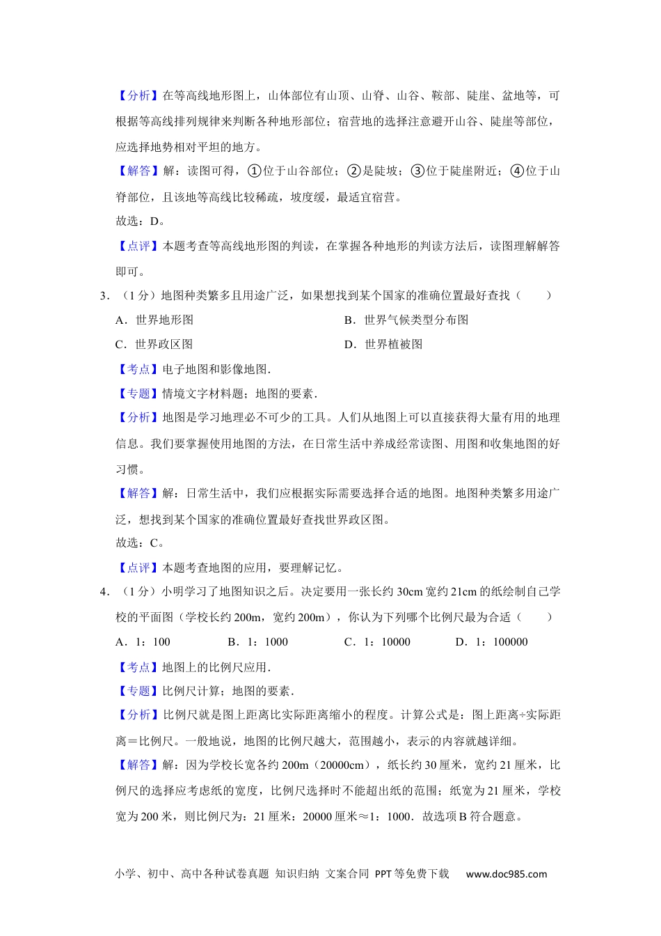 小学、初中、高中各种试卷真题知识归纳文案合同PPT等免费下载www.doc985.com2017年陕西省咸阳市中考地理试卷参考答案与试题解析一、选择题(每小题1分,共20分.每小题只有一项符合要求,请将答案字母填写在题前表格内)1.(1分)人类对地球形状的认识经历了漫长的探索过程。下列能够说明地球形状为球体的是()A.人造卫星拍摄的地球照片B.哥伦布发现新大陆C.春夏秋冬四季轮回D.流星现象【考点】地球形状的认识过程及球形证据.【专题】地理探究类开放题;地球仪与经纬网.【分析】科学家经过长期的精密测量,发现地球并不是一个规则球体,而是一个两极稍扁、赤道略鼓的不规则球体。【解答】解:能证明地球形状是球体的例子很多,如离岸的船总是船身先消失,桅杆后消失、站得高,才能看得远、麦哲伦环球航行、月食、人造卫星拍摄的地球照片等;哥伦布发现新大陆、春夏秋冬四季轮回、流星现象不能证明地球的形状;故选项A正确,符合题意。故选:A。【点评】本题考查了证明地球是球体的事例,理解解答即可。2.(1分)如图是我国某区域等高线地形图,在该区域进行地理野外实习的大学生。准备在图示区域宿营,下列四地中最适宜宿营的是()A.①B.②C.③D.④【考点】等高线地形图的判读.【专题】地形图;地形与等高线地形图.小学、初中、高中各种试卷真题知识归纳文案合同PPT等免费下载www.doc985.com【分析】在等高线地形图上,山体部位有山顶、山脊、山谷、鞍部、陡崖、盆地等,可根据等高线排列规律来判断各种地形部位;宿营地的选择注意避开山谷、陡崖等部位,应选择地势相对平坦的地方。【解答】解:读图可得,①位于山谷部位;②是陡坡;③位于陡崖附近;④位于山脊部位,且该地等高线比较稀疏,坡度缓,最适宜宿营。故选:D。【点评】本题考查等高线地形图的判读,在掌握各种地形的判读方法后,读图理解解答即可。3.(1分)地图种类繁多且用途广泛,如果想找到某个国家的准确位置最好查找()A.世界地形图B.世界气候类型分布图C.世界政区图D.世界植被图【考点】电子地图和影像地图.【专题】情境文字材料题;地图的要素.【分析】地图是学习地理必不可少的工具。人们从地图上可以直接获得大量有用的地理信息。我们要掌握使用地图的方法,在日常生活中养成经常读图、用图和收集地图的好习惯。【解答】解:日常生活中,我们应根据实际需要选择合适的地图。地图种类繁多用途广泛,想找到某个国家的准确位置最好查找世界政区图。故选:C。【点评】本题考查地图的应用,要理解记忆。4.(1分)小明学习了地图知识之后。决定要用一张长约30cm宽约21cm的纸绘制自己学校的平面图(学校长约200m,宽约200m),你认为下列哪个比例尺最为合适()A.1:100B.1:1000C.1:10000D.1:100000【考点】地图上的比例尺应用.【专题】比例尺计算;地图的要素.【分析】比例尺就是图上距离比实际距离缩小的程度。计算公式是:图上距离÷实际距离=比例尺。一般地说,地图的比例尺越大,范围越小,表示的内容就越详细。【解答】解:因为学校长宽各约200m(20000cm),纸长约30厘米,宽约21厘米,比例尺的选择应考虑纸的宽度,比例尺选择时不能超出纸的范围;纸宽为21厘米,学校宽为200米,则比例尺为:21厘米:20000厘米≈1:1000.故选项B符合题意。小学、初中、高中各种试卷真题知识归纳文案合同PPT等免费下载www.doc985.com故选:B。【点评】本题考查了比例尺的计算,在把握比例尺的计算,单位换算的基础上,理解解答即可。5.(1分)读咸阳某日的天气预报图,下列叙述正确的是()A.该日可能会出现霜冻现象B.该日的风力大小为8级C.该日适合组织登山活动D.该日天气阴转大雨【考点】常用天气符号与天气图.【专题】示意图;天气与气候.【分析】在天气预报图上,我们常看到一些符号,这些符号都有特定的含义,表示某种天气状况的。【解答】解:读图可知,咸阳今天阴转大雨,东南风四级,气温在18℃23℃﹣之间,该日不可能会出现霜冻现象,不适合组织登山活动。根据题意。故选:D。【点评】该题考查的是常用的天气符号,属于基础性知识点,结合教材熟练记忆即可。6.(1分)...