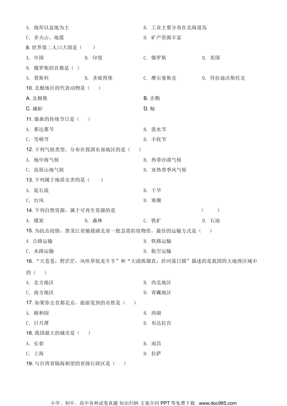 2020年齐齐哈尔市初中学业考试地理试卷考生注意:1.全卷共两道大题,总分100分2.使用答题卡的考生,请将答案填写在答题卡的指定位置一、选择题(每小题只有一个正确选项,每小题2分,共40分)1.地球的表面积约为()A.2.2万千米B.4万千米C.6371千米D.5.1亿平方千米2.地球公转一周用的时间是()A.一天B.一星期C.一个月D.一年3.现代测量表明,地中海的面积在不断缩小,其原因是()A.地中海位于亚欧板块和非洲板块碰撞挤压地带B.地中海位于亚欧板块和印度洋板块张裂地带C.人类活动D.全球气候变暖4.下列天气符号表示沙尘暴的是()A.B.C.D.5.一天中,最高气温出现在()A.2时左右B.8时左右C.14时左右D.20时左右6.下列河流注入太平洋的是()A.长江B.伏尔加河C.尼罗河D.叶尼塞河7.下列关于日本的叙述正确的一项是()小学、初中、高中各种试卷真题知识归纳文案合同PPT等免费下载www.doc985.comA.地形以盆地为主B.工业主要分布在北海道岛C.多火山、地震D.矿产资源丰富8.世界第二人口大国是()A.中国B.印度C.俄罗斯D.美国9.俄罗斯的首都是()A.莫斯科B.圣彼得堡C.摩尔曼斯克D.符拉迪沃斯托克10.北极地区的代表动物是()A.北极熊B.企鹅C.磷虾D.鲸11.傣族的传统节日是()A.那达慕节B.泼水节C.雪顿节D.丰收节12.下列气候类型,分布在我国东部地区的是()A.地中海气候B.热带沙漠气候C.高原山地气候D.亚热带季风气候13.下列属于地质灾害的是()A.泥石流B.干旱C.台风D.寒潮14.下列自然资源,属于可再生资源的是()A.煤炭B.森林C.铁矿D.石油15.为抗击疫情,黑龙江省驰援湖北省一批急需防疫物资,最佳的运输方式是()A.公路运输B.铁路运输C.水路运输D.航空运输16.“天苍苍,野茫茫,风吹草低见牛羊”和“大漠孤烟直,於河落日圆”描述的是我国四大地理区域中的()A.北方地区B.西北地区C.南方地区D.青藏地区17.如果你去首都北京,能游览到的名胜是()A.颐和园B.西湖C.日月潭D.布达拉宫18.我国最大的城市是()A.长春B.南昌C.上海D.拉萨19.与台湾省隔海相望的省级行政区是()小学、初中、高中各种试卷真题知识归纳文案合同PPT等免费下载www.doc985.comA.黑龙江省B.青海省C.甘肃省D.福建省20.目前世界上最大的发展中国家是()A.巴西B.南非C.中国D.印度二、非选择题(共60分)21.读经纬网图,回答问题。(1)A点的经度是______________,C点的纬度是______________。(2)从南、北半球看,A点位于___________半球;从东、西半球看,D点位于__________半球。(3)A、B两点中位于热带的是_____________点。(4)A点位于B点的_________________方向。22.读世界海陆分布图,冋答问题。(1)A是____________洲,B是____________洲。(2)我国位于_____________洲(填字母)。(3)图中表示印度洋的是______________,表示北冰洋的是_________________(均填序号)。小学、初中、高中各种试卷真题知识归纳文案合同PPT等免费下载www.doc985.com(4)主要分布在西半球的大洲是D洲和___________洲(填字母)。(5)A洲和C洲的分界线是___________运河。(6)唯一无人定居的大洲是_________洲(填A或B)。23.读东南亚简图和中东简图,回答问题。(1)写出图中字母所代表地理事物的名称:国家:A____________,B____________;海域:C___________海。(2)D____________群岛是世界最大的群岛。(3)东南亚主要的粮食作物是_____________(填水稻或小麦)。(4)E___________湾及其沿岸地区___________资源丰富,F___________海峡是该资源运往东亚的重要通道。24.读美国简图和巴西简图,回答问题。(1)两国都濒临A__________洋。(2)B湖是世界上面积最大的__________水湖(或淡或咸);C是_________河,该河流域分布着地球上面小学、初中、高中各种试卷真题知识归纳文案合同PPT等免费下载www.doc985.com积最大的__________(填热带雨林或热带草原);D是____________高原。(3)E是美国的邻国_____________(填墨西哥或加拿大)。(4)图示的两个国家中,__________是世界上最发达的工业国家。(5)巴西产量居世界首位的农产品有()A.玉米B.水稻C.小麦D.咖啡25.读中国简图,回答问题。(1)A_______...