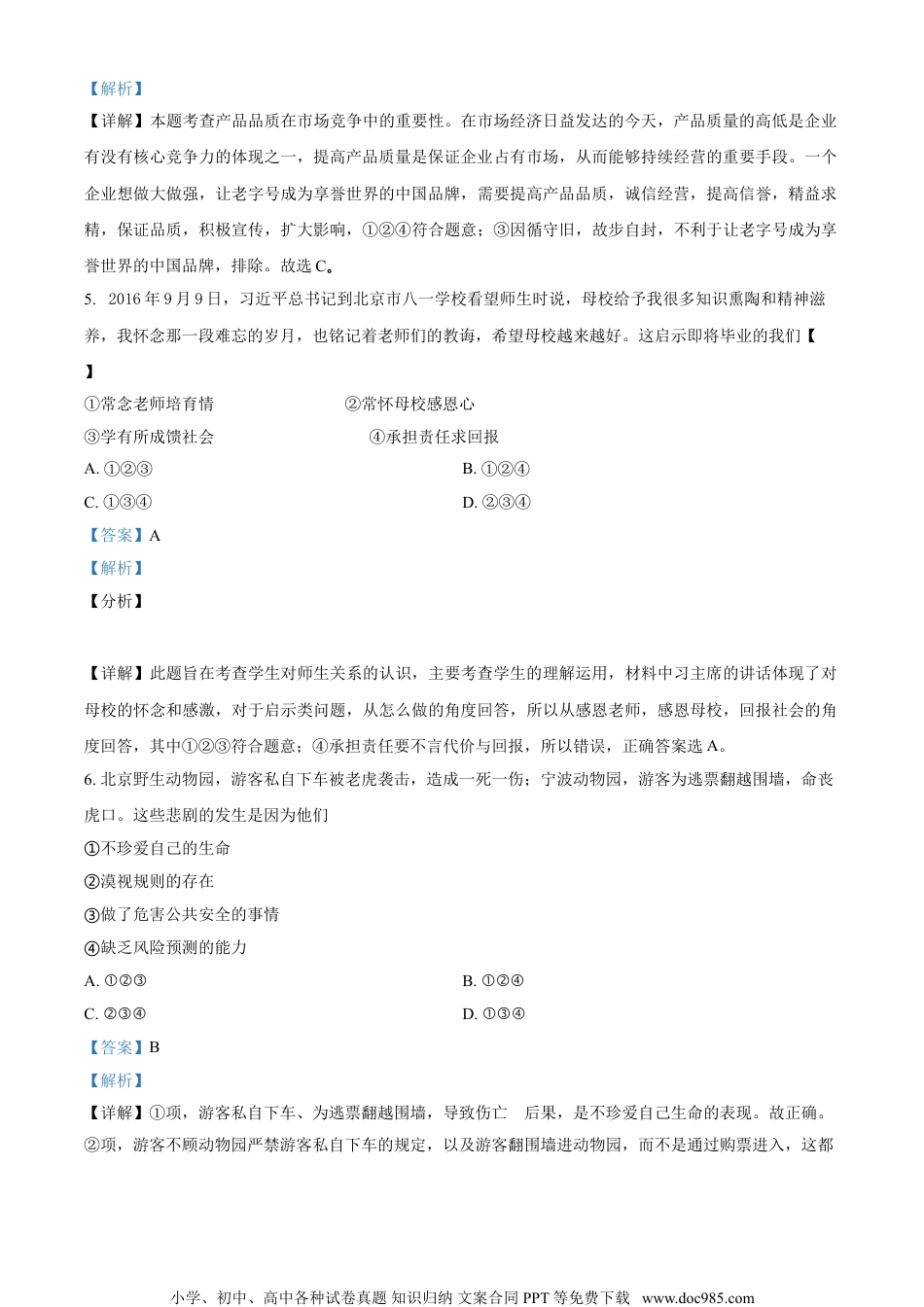2017年陕西省思想品德中考试卷第一卷(选择题)A卷1.2016年9月4日至5日,二十国集团领导人第_____次峰会在中国杭州举行。会议就推进世界经济强劲、可持续、平衡和包容增长的一揽子政策和措施达成“_____”.()A.十一全球共识B.十二高速C.十一杭州共识D.十二全球共识【答案】C【解析】【详解】时事解析略2.2017年1月20日,国家统计局公布,2016年我国国内生产总值___突破70亿元,为744127亿元,按可比价格计算,比上年增长6.7%。这仍属于______增长A.首次中高速B.第二次高速C.首次高速D.第二次中高速【答案】A【解析】【详解】时事解析略3.2017年4月1日,新华社北京电,中共中央、国务院决定设立河北雄安新区。这对于集中疏解北京_____功能,调节优化_____城市布局和空间结构等,具有重大现实意义和深远历史意义。A.非首都京津晋B.非首都京津冀C.非行政京津晋D.非行政京津冀【答案】B【解析】【详解】时事解析略4.2018年5月10日是第二个“中国品牌日”。中华老字号是优秀民族品牌的代表,让“老字号”成为享誉世界的中国品牌,应该①诚信经营,提高信誉②精益求精,保证品质③固守传统,一成不变④积极宣传,扩大影响A.①②③B.②③④C.①②④D.①③④【答案】C小学、初中、高中各种试卷真题知识归纳文案合同PPT等免费下载www.doc985.com【解析】【详解】本题考查产品品质在市场竞争中的重要性。在市场经济日益发达的今天,产品质量的高低是企业有没有核心竞争力的体现之一,提高产品质量是保证企业占有市场,从而能够持续经营的重要手段。一个企业想做大做强,让老字号成为享誉世界的中国品牌,需要提高产品品质,诚信经营,提高信誉,精益求精,保证品质,积极宣传,扩大影响,①②④符合题意;③因循守旧,故步自封,不利于让老字号成为享誉世界的中国品牌,排除。故选C。5.2016年9月9日,习近平总书记到北京市八一学校看望师生时说,母校给予我很多知识熏陶和精神滋养,我怀念那一段难忘的岁月,也铭记着老师们的教诲,希望母校越来越好。这启示即将毕业的我们【】①常念老师培育情②常怀母校感恩心③学有所成馈社会④承担责任求回报A.①②③B.①②④C.①③④D.②③④【答案】A【解析】【分析】【详解】此题旨在考查学生对师生关系的认识,主要考查学生的理解运用,材料中习主席的讲话体现了对母校的怀念和感激,对于启示类问题,从怎么做的角度回答,所以从感恩老师,感恩母校,回报社会的角度回答,其中①②③符合题意;④承担责任要不言代价与回报,所以错误,正确答案选A。6.北京野生动物园,游客私自下车被老虎袭击,造成一死一伤;宁波动物园,游客为逃票翻越围墙,命丧虎口。这些悲剧的发生是因为他们①不珍爱自己的生命②漠视规则的存在③做了危害公共安全的事情④缺乏风险预测的能力A.①②③B.①②④C.②③④D.①③④【答案】B【解析】【详解】①项,游客私自下车、为逃票翻越围墙,导致伤亡的后果,是不珍爱自己生命的表现。故正确。②项,游客不顾动物园严禁游客私自下车的规定,以及游客翻围墙进动物园,而不是通过购票进入,这都小学、初中、高中各种试卷真题知识归纳文案合同PPT等免费下载www.doc985.com是对规则的漠视。故正确。③项,游客私自下车、翻墙进动物园危害了自己的生命安全,并没有危害公共安全。故错误。④项,游客私自下车、翻墙时忽略了可能被老虎伤害的风险,缺乏一定的风险预测能力。故正确。综上所述,因为①②④正确,③错误,所以,本题正确答案为B。7.新修订的《最高人民法院关于公布被执行人名单信息的若干规定》中指出,“被执行人为未成年人的,人民法院不得将其纳入失信被执行人名单”。这一规定①增强了未成年人自我保护意识②有利于未成年人的健康成长③体现了对未成年人的司法保护④体现了教育为主、惩罚为辅的原则A.①②③④B.①②④C.①③④D.②③④【答案】D【解析】【详解】题干表述了如果失信人为未成年人的,人民法院不得将其纳入失信被执行人名单,这体现着对未成年人的特殊保护,属于司法保护,体现了教育为主、惩罚为辅的原则,也有利于未成年人的健康成长,所以②③④是正确的,①与题意不符,排除,故选D。【点睛】未成...