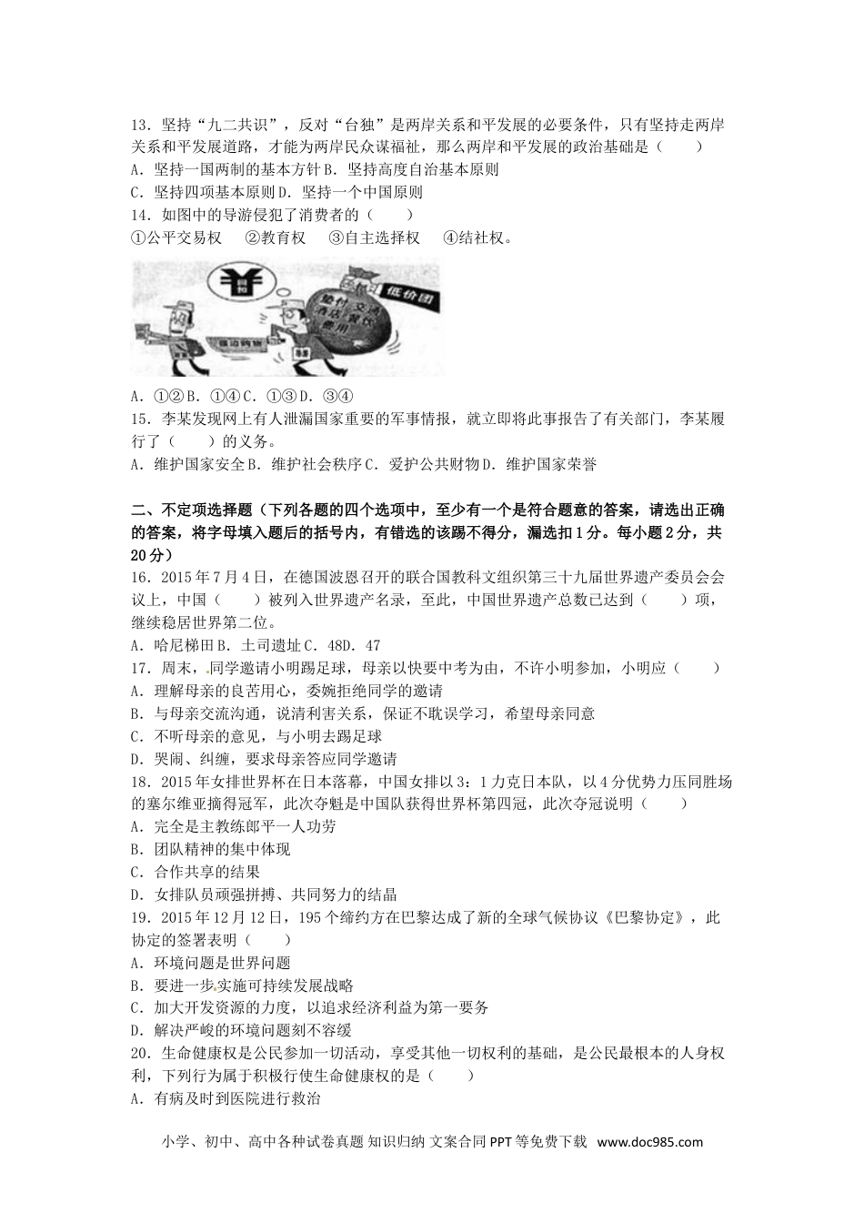 2016年黑龙江龙东地区中考思想品德真题一、单项选择题(共15小题,每小题1分,满分20分,第1-10小题,每小题1分,第11-15小题,每小题1分)1.2015年8月17日,我国最北高寒高铁()高铁正式开通运营。A.哈尔滨到佳木斯B.哈尔滨到黑河C.哈尔滨到齐齐哈尔D.哈尔滨到漠河2.2015年7月31日下午,国际奥委会第128次全会在马来西亚吉隆坡投票决定,将2022年冬奥会举办权交给()A.北京B.南京C.日本D.韩国3.2015年11月7日下午,中共中央总书记、国家主席习近平同台湾方面领导人()在新加坡会面,这是1949年以来两岸领导人的首次会面。A.陈建仁B.朱立伦C.蔡英文D.马英九4.2015年11月20日上午,中共中央在人民大会堂举行座谈会,纪念()同志诞辰100周年。A.李大钊B.习仲勋C.周恩来D.胡耀邦5.2016年4月24日是首个“()”。载人航天工程实施20多年来,取得了载人航天“十全十美”的成绩。A.中国航空日B.中国飞天日C.中国航天日D.中国太空日6.2015年9月8日,西藏各族各界干部群众约2万人欢聚拉萨布达拉宫广场,热烈庆祝西藏自治区成立()周年。A.40周年B.45周年C.50周年D.55周年7.2015年10月19日至23日,国家主席习近平对()进行国事访问,全面推动两国关系的发展,为中欧合作注入新动力。A.法国B.美国C.英国D.德国8.2015年12月25日,()在中国正式成立,它是由中国倡议设立的一个政府间性质的亚洲区域开发机构。A.亚洲商业银行B.亚洲基础设施投资银行C.亚洲开发银行D.亚洲金融银行9.2015年6月5日是第44个世界环境日,主题为“可持续消费和生产”,口号为“七十亿人的梦想,一个星球关爱型社会”,中国主题为“()”,该主题旨在增强全民环境意识、生态意识。选择低碳、节俭的绿色生活方式和消费模式。A.践行绿色生活B.低碳生活我参与C.珍爱环境D.绿色出行10.2015年5月19日,经李克强总理签批,国务院印发《()》,这是我国实施制造强国战略第一个十年的行动纲领。A.中国制造2024B.中国制造2025C.中国制造2026D.中国制造202711.某中学为了解决学校留守儿童的安全、教育问题,开通学校“心连心”校园广播,密切关注留守儿童的健康成长,体现()A.学校保护B.家庭保护C.司法保护D.社会保护12.小明看到同学柔弱矮小,于是给他起外号“豆芽菜”这侵犯了同学的()A.姓名权B.名誉权C.荣誉权D.隐私权小学、初中、高中各种试卷真题知识归纳文案合同PPT等免费下载www.doc985.com13.坚持“九二共识”,反对“台独”是两岸关系和平发展的必要条件,只有坚持走两岸关系和平发展道路,才能为两岸民众谋福祉,那么两岸和平发展的政治基础是()A.坚持一国两制的基本方针B.坚持高度自治基本原则C.坚持四项基本原则D.坚持一个中国原则14.如图中的导游侵犯了消费者的()①公平交易权②教育权③自主选择权④结社权。A.①②B.①④C.①③D.③④15.李某发现网上有人泄漏国家重要的军事情报,就立即将此事报告了有关部门,李某履行了()的义务。A.维护国家安全B.维护社会秩序C.爱护公共财物D.维护国家荣誉二、不定项选择题(下列各题的四个选项中,至少有一个是符合题意的答案,请选出正确的答案,将字母填入题后的括号内,有错选的该踢不得分,漏选扣1分。每小题2分,共20分)16.2015年7月4日,在德国波恩召开的联合国教科文组织第三十九届世界遗产委员会会议上,中国()被列入世界遗产名录,至此,中国世界遗产总数已达到()项,继续稳居世界第二位。A.哈尼梯田B.土司遗址C.48D.4717.周末,同学邀请小明踢足球,母亲以快要中考为由,不许小明参加,小明应()A.理解母亲的良苦用心,委婉拒绝同学的邀请B.与母亲交流沟通,说清利害关系,保证不耽误学习,希望母亲同意C.不听母亲的意见,与小明去踢足球D.哭闹、纠缠,要求母亲答应同学邀请18.2015年女排世界杯在日本落幕,中国女排以3:1力克日本队,以4分优势力压同胜场的塞尔维亚摘得冠军,此次夺魁是中国队获得世界杯第四冠,此次夺冠说明()A.完全是主教练郎平一人功劳B.团队精神的集中体现C.合作共享的结果D.女排队员顽强拼搏、共同努力的结晶19.2015...