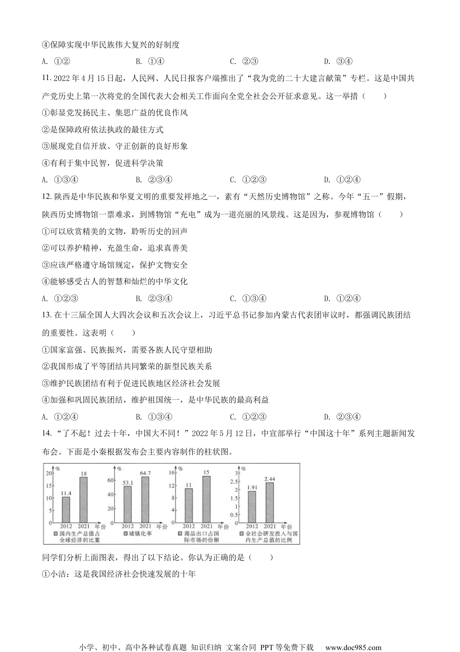 小学、初中、高中各种试卷真题知识归纳文案合同PPT等免费下载www.doc985.com2022年陕西省中考道德与法治试卷(B卷)一、选择题(共30分)本部分共15题,每题2分,计30分。每题只有一个选项是符合题意的。1.2021年11月8日至11日,中国共产党第十九届中央委员会第______次全体会议在北京举行。全会审议通过了《中共中央关于党的百年奋斗重大成就和______的决议》,这是我们党的历史上第三个历史决议。()A.五历史经验B.五历史问题C.六历史经验D.六历史问题2.2022年4月8日,北京冬奥会、冬残奥会总结表彰大会在人民大会堂隆重举行。中共中央总书记、国家主席、中央军委主席习近平发表重要讲话时强调,北京冬奥精神就是______、自信开放、迎难而上、______、共创未来。()A.胸怀大局追求卓越B.胸怀天下追赶超越C.胸怀大局追赶超越D.胸怀天下追求卓越3.2021年10月25日,国家主席习近平在北京出席中华人民共和国恢复______合法席位50周年纪念会议并发表重要讲话时指出,中国愿同各国秉持______理念,为实现世界永续和平发展、为推动构建人类命运共同体而不懈奋斗。()A.联合国合作互利共赢B.安理会合作互利共赢C.联合国共商共建共享D.安理会共商共建共享4.设计的服装,新颖时尚;手中的焊枪,焊花飞溅;娴熟的护理,规范专业……这是某职业学校学生技能展示活动的场景。这些学生走进社会后,就业前景光明。这启示我们()①职业没有贵与贱,都是光荣劳动者②成才道路有多条,苦练本领很重要③各种人才都是宝,社会发展少不了④职业选择有多种,生涯规划父母定A.①②④B.①②③C.①③④D.①②③④5.2022年5月20日是第33个中国学生营养日,其主题是“知营养、会运动、防肥胖、促健康”。下列做法与主题不相符的是()A.吃饭不挑食,果蔬蛋奶都要吃B.运动不偷懒,养成锻炼好习惯C.熬夜不睡觉,休闲娱乐最重要D.饮料不多喝,适量饮水要做到小学、初中、高中各种试卷真题知识归纳文案合同PPT等免费下载www.doc985.com6.以下是小秦和同学们为下边漫画设计的标题。你认为不恰当的是()A.小秦:和谐家庭我出力B.小新:家中亲情我呵护C.小洁:家庭美德我传承D.小茵:爱的碰撞我逃避7.“积力之所举,则无不胜也;众智之所为,则无不成也。”习近平总书记以此激励全国上下齐心协力,团结一致,共创新辉煌。下列古语与习近平总书记这一用典蕴含的思想一致的是()A.单则易折,众则难摧B.千里之行,始于足下C.志之所向,无坚不入D.天下兴亡,匹夫有责近年来,以“养老”为名的电信诈骗行为时有发生,给老年人造成了财产损失和精神打击。2022年5月10日,中宣部、公安部联合启动“全民反诈在行动”集中宣传月活动。据此,完成下列小题。8.开展这一活动的意义在于()①营造全民反诈、全社会反诈的氛围②提高公民保护合法私有财产的能力③杜绝了侵害老年人权益的诈骗行为④帮助人民群众增强识骗防骗的意识A.①②③B.①②④C.①③④D.②③④9.为帮助爷爷奶奶安全使用手机,谨防被骗,小秦提出以下建议。你认为可行的是()①在手机上安装国家反诈中心APP②不要轻信陌生人电话的花言巧语③不要轻易点击陌生短信上的链接④不用手机去上网,彻底远离互联网A.②③④B.①②④C.①③④D.①②③10.2021年10月13日至14日,中央人大工作会议在北京召开。习近平总书记强调,60多年来,人民代表大会制度为党领导人民创造经济快速发展奇迹和社会长期稳定奇迹,提供了重要制度保障。这表明,人民代表大会制度是()①符合中国国情和实际的好制度②群众自我管理、自我监督的好制度③肝胆相照、荣辱与共的好制度小学、初中、高中各种试卷真题知识归纳文案合同PPT等免费下载www.doc985.com④保障实现中华民族伟大复兴的好制度A.①②B.①④C.②③D.③④11.2022年4月15日起,人民网、人民日报客户端推出了“我为党的二十大建言献策”专栏。这是中国共产党历史上第一次将党的全国代表大会相关工作面向全党全社会公开征求意见。这一举措()①彰显党发扬民主、集思广益的优良作风②是保障政府依法执政的最佳方式③展现党自信开放、守正创新的良好形象④有利于集中民智,促进科学决策A.①③④B.②③④C.①②③D.①②④12.陕...
