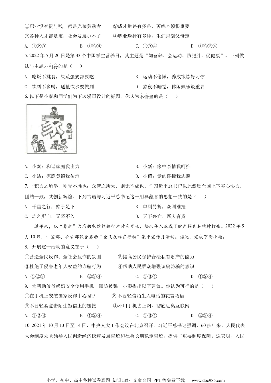 小学、初中、高中各种试卷真题知识归纳文案合同PPT等免费下载www.doc985.com机密★启用前试卷类型:A2022年陕西省初中学业水平考试道德与法治试卷注意事项:1.本试卷分为第一部分(选择题)和第二部分(非选择题)。全卷共6页,总分80分。考试时间80分钟。2.考试形式为开卷。你可以参考自带的课本和相关资料,但不能互换。3.领到试卷和答题卡后,请用0.5毫米黑色墨水签字笔,分别在试卷和答题卡上填写姓名和准考证号,同时用2B铅笔在答题卡上填涂对应的试卷类型信息点(A或B)。4.请在答题卡上各题的指定区域内作答,否则作答无效。5.考试结束,本试卷和答题卡一并交回。第一部分(选择题共30分)本部分共15题,每题2分,计30分。每题只有一个选项是符合题意的。1.2021年11月8日至11日,中国共产党第十九届中央委员会第_________次全体会议在北京举行。全会审议通过了《中共中央关于党的百年奋斗重大成就和_________的决议》,这是我们党的历史上第三个历史决议。()A.五历史经验B.六历史经验C.五历史问题D.六历史问题2.2022年4月8日,北京冬奥会、冬残奥会总结表彰大会在人民大会堂隆重举行。中共中央总书记、国家主席、中央军委主席习近平发表重要讲话时强调,北京冬奥精神就是_________、自信开放、迎难而上、_________、共创未来。()A.胸怀大局追赶超越B.胸怀天下追赶超越C.胸怀大局追求卓越D.胸怀天下追求卓越3.2021年10月25日,国家主席习近平在北京出席中华人民共和国恢复_________合法席位50周年纪念会议并发表重要讲话时指出,中国愿同各国秉持_________理念,为实现世界永续和平发展、为推动构建人类命运共同体而不懈奋斗。()A.联合国合作互利共赢B.联合国共商共建共享C.安理会合作互利共赢D.安理会共商共建共享4.设计的服装,新颖时尚;手中的焊枪,焊花飞溅;娴熟的护理,规范专业……这是某职业学校学生技能展示活动的场景。这些学生走进社会后,就业前景光明。这启示我们()小学、初中、高中各种试卷真题知识归纳文案合同PPT等免费下载www.doc985.com①职业没有贵与贱,都是光荣劳动者②成才道路有多条,苦练本领很重要③各种人才都是宝,社会发展少不了④职业选择有多种,生涯规划父母定A.①②③B.①②④C.①③④D.①②③④5.2022年5月20日是第33个中国学生营养日,其主题是“知营养、会运动、防肥胖、促健康”。下列做法与主题不相符的是()A.吃饭不挑食,果蔬蛋奶都要吃B.运动不偷懒,养成锻炼好习惯C.饮料不多喝,适量饮水要做到D.熬夜不睡觉,休闲娱乐最重要6.以下是小秦和同学们为下边漫画设计的标题。你认为不恰当的是()A.小秦:和谐家庭我出力B.小新:家中亲情我呵护C.小洁:家庭美德我传承D.小茵:爱的碰撞我逃避7.“积力之所举,则无不胜也;众智之所为,则无不成也。”习近平总书记以此激励全国上下齐心协力,团结一致,共创新辉煌。下列古语与习近平总书记这一用典蕴含的思想一致的是()A.千里之行,始于足下B.单则易折,众则难摧C.志之所向,无坚不入D.天下兴亡,匹夫有责近年来,以“养老”为名的电信诈骗行为时有发生,给老年人造成了财产损失和精神打击。2022年5月10日,中宣部、公安部联合启动“全民反诈在行动”集中宣传月活动。据此,完成下面小题。8.开展这一活动的意义在于()①营造全民反诈、全社会反诈的氛围②提高公民保护合法私有财产的能力③杜绝了侵害老年人权益的诈骗行为④帮助人民群众增强识骗防骗的意识A.①②③B.②③④C.①③④D.①②④9.为帮助爷爷奶奶安全使用手机,谨防被骗,小秦提出以下建议。你认为可行的是()①在手机上安装国家反诈中心APP②不要轻信陌生人电话的花言巧语③不要轻易点击陌生短信上的链接④不用手机去上网,彻底远离互联网A.①②③B.①②④C.①③④D.②③④10.2021年10月13日至14日,中央人大工作会议在北京召开。习近平总书记强调,60多年来,人民代表大会制度为党领导人民创造经济快速发展奇迹和社会长期稳定奇迹,提供了重要制度保障。这表明,人民小学、初中、高中各种试卷真题知识归纳文案合同PPT等免费下载www.doc985.com代表大会制度是()①符合中国国情和实际的好制度②群众自我管理、...
