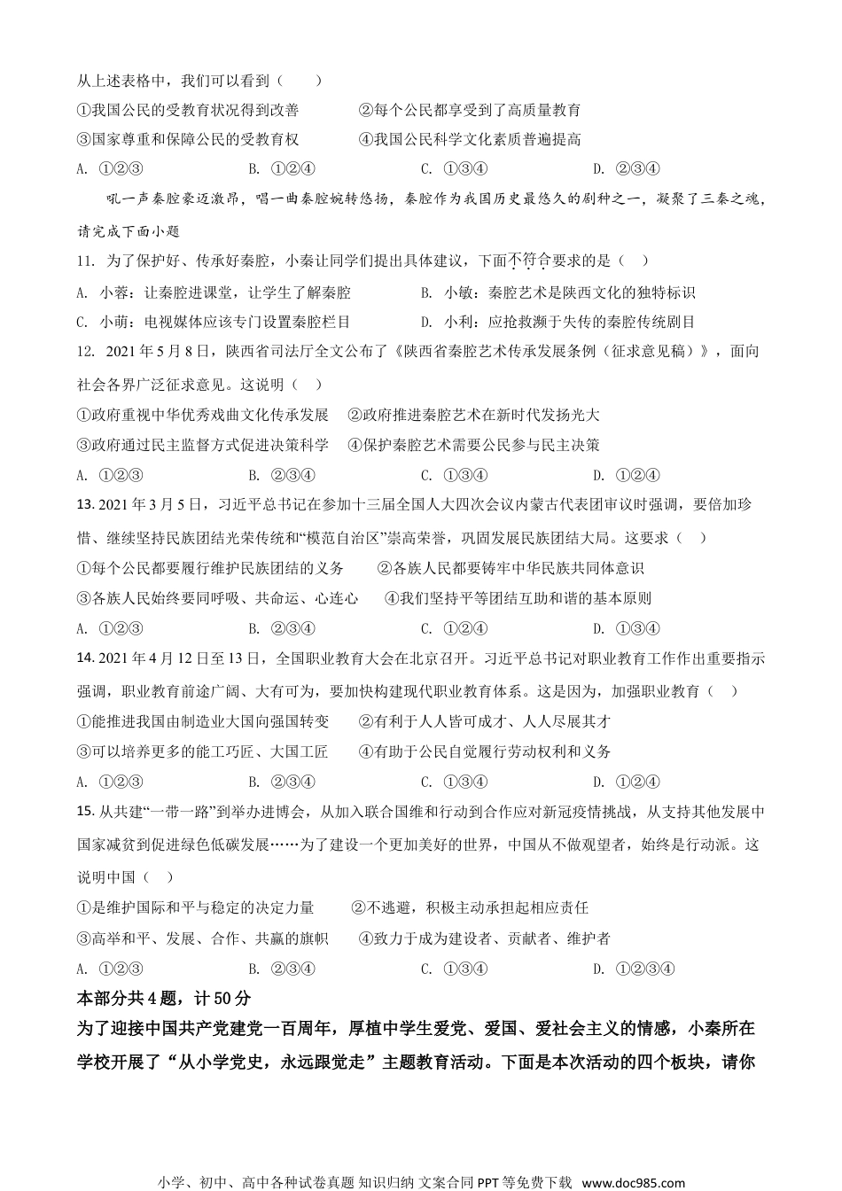 2021年陕西省初中学业水平考试道德与法治学科第一部分(选择题共30分)一、本部分共15题,每题2分,计30分。每题只有一个选项是符合题意的。1.2020年10月26日至29日,中国共产党第十九届中央委员会第五次全体会议在北京召开。全会强调,全党全国各族人民要再接再厉,一鼓作气,确保如期全面建成小康社会、实现第_________个百年奋斗目标,为开启全面建设_____________现代化国家新征程奠定坚实基础。()A.一中国特色社会主义B.一社会主义C.二中国特色社会主义D.二社会主义2.2021年2月28日,国家统计局发布的2020年国民经济和社会发展统计公报显示,初步核算,全年国内生产总值1015986亿元,比上年增长2.3%,在全球主要经济体中___________实现经济正增长;我国人均GDP连续两年超过___________美元()A.唯一12000B.第二个12000C.唯一10000D.第二个100003.2021年4月22日,国家主席习近平在北京以视频方式出席领导人气候峰会,发表题为《共同构建___________共同体》的重要讲话。中方宣布力争___________年前实现碳达峰、2060年前实现碳中和,是基于推动构建人类命运共同体和实现可持续发展作出的重大战略决策。()A.人与自然生命2030B.人类卫生健康2035C.人类卫生健康2030D.人与自然生命20354.“立志而圣则圣矣,立志而贤则贤矣。”青年只有心怀“国之大者”,才能担当民族复兴重任这说明()①理想是人生的航标,指引人生的方向②理想的确定要与时代的脉搏紧密相连③实现人生理想须付诸行动,努力坚持④青年理想远大,国家和民族就有希望A.①②③B.②③④C.①③④D.①②④5.“我不在家就在试验田,不在试验田就在去试验田的路上。”“我一直有两个梦,一个是禾下乘凉梦,一个是杂交水稻覆盖全球梦。”这就是中国“杂交水稻之父”“共和国勋章”获得者袁隆平的生动写照和毕生追求。下面诗句与材料表现出的袁隆平优秀品质相符的是()①纸上得来终觉浅,绝知此事要躬行②历览前贤国与家,成由勤俭破由智③咬定青山不放松,立根原在破岩中④千淘万漉虽辛苦,吹尽狂沙始到金A.①②③B.②③④C.①③④D.①②④6.古人对秋天的描写多以“悲秋”的意境呈现,但毛泽东《采桑子·重阳》中的秋天却充满了生机和活力:“一年度秋风劲,不似春光。胜似春光,寥廓江天万里霜。”毛泽东对秋天的描述()小学、初中、高中各种试卷真题知识归纳文案合同PPT等免费下载www.doc985.com①体现了他积极向上的人生态度②抒发了他气势磅礴的豪迈情怀③启示我们要尊重和保护大自然④表达了他乐观豁达的心理品质A.①②③B.②③①C.①②④D.①③④根据材料,请完成下面小题。习近平总书记提出,没有全民健康,就没有全面小康;健康是1,其他是后面的0没有1,再多的0也没有意义。教育部印发《关于进一步加强中小学生睡眠管理工作的通知》强调,要保障学生充足睡眠时间。7.教育部印发此通知,是因为()①生命是来之不易的,也是独特的②健康是我们享受幸福生活的前提③全民健康是全面小康的重要表现④学生的健康关乎中华民族的未来A.①②③B.②③④C.①③④D.①②④8.为解决漫画中的问题,小秦和同学们提出了以下建议,其中不正确的是()A.学生应增强自制力,学会“信息节食”,不沉迷游戏B.家长应履行家庭保护责任,严控学生使用手机时间C.学校应该科学合理布置作业,不要布置重复性作业D.教育行政部门应制定相关法律,管好校外培训机构9.2021年4月19日,习近平总书记在清华大学考察时,察看了脑科学与人工智能交叉科学实验研究、开发新科技应用场景情况,听取了关于增强自主创新能力等情况介绍,对取得的成绩给予肯定。这表明()①党和国家高度重视新科技发展②我国坚持走中国特色自主创新道路③创新无处不在,创新改变生活④我国大力提倡大众创业、万众创新A.①②B.③④C.②④D.①③10.我国人口受教育情况统计表项目项目年份每10万人中拥有大学文化程度(人)15岁及以上人口平均受教育年限(年)文盲率(%)201089309.084.082020154679.912.67注:数据来源子全国第七次人口普查公报小学、初中、高中各种试卷真题知识归纳文案合同PPT等免费下载www.doc985.com从上述表格中,我们可以看到()①我国公民的...