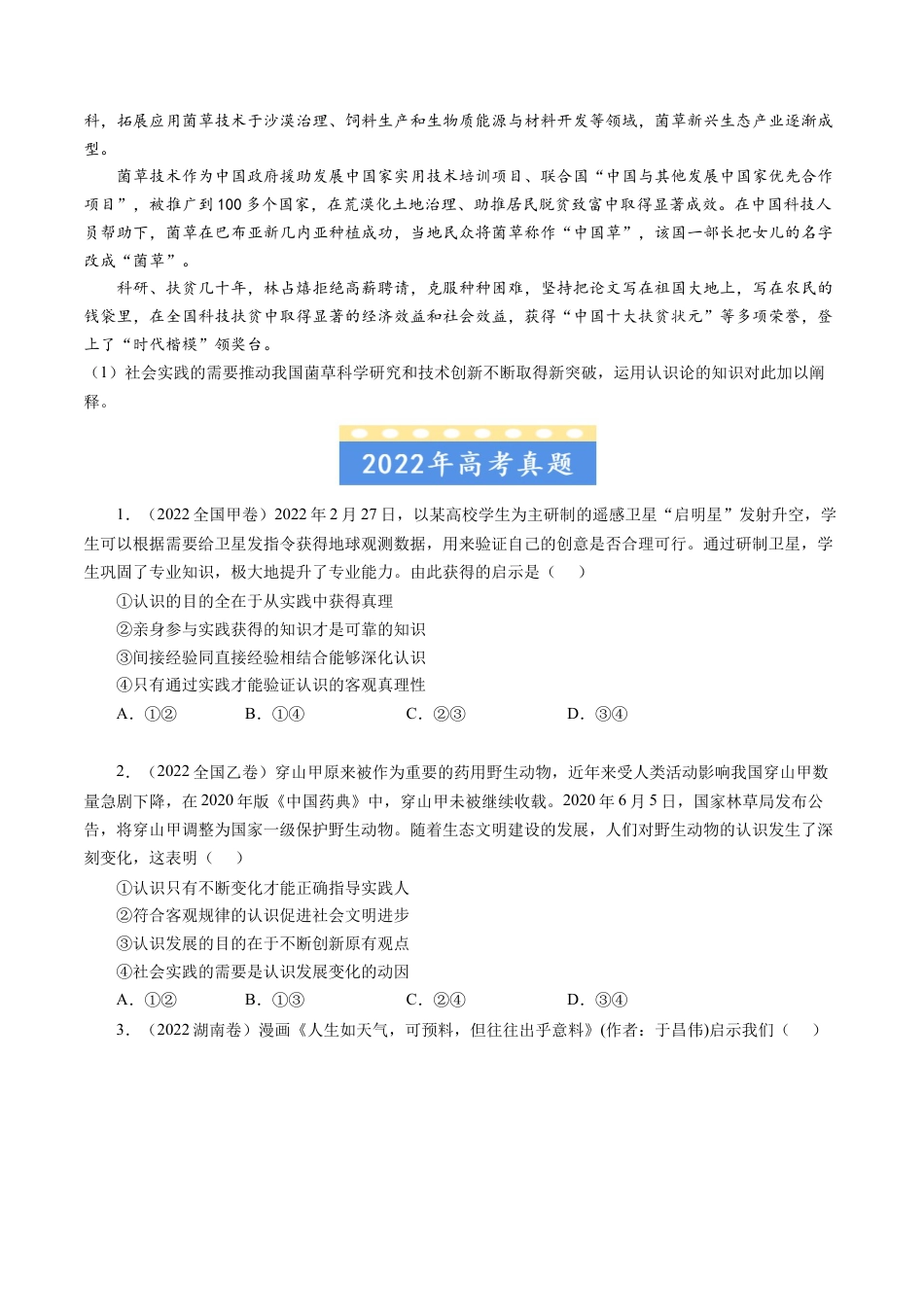 五年(2019-2023)年高考政治真题分项汇编专题13哲学与唯物论、认识论1.(2023·全国乙卷)每当鲜花盛开的季节,赏花者纷至沓来。某公园用“你欣赏花的美丽,花欣赏你的高度”“把花朵留在枝头,让美丽留在心灵”等宣传语,代替“禁止折花”“摘花可耻”等警示语,营造人与自然和谐相处的环境,违规摘花的游客明显减少。该现象反映的哲学道理是()①改变人的思想观念就能变革客观现实②人的思想观念对人的行为具有导向作用③思想观念具有能动性,不受制于客观现实④客观现实的变化会引起人的思想观念的改变A.①②B.①③C.②④D.③④2.(2023·全国乙卷)党的二十大报告指出,问题是时代的声音,回答并指导解决问题是理论的根本任务。今天我们所面临问题的复杂程度、解决问题的艰巨程度明显加大,给理论创新提出了全新要求。这一论述的认识论根据是()①发展着的社会实践不断向认识提出新的课题②社会实践为认识发展创造了越来越优越的条件③满足社会实践的需要是认识的根本目的和归宿④社会实践为验证认识正确与否提供了客观标准A.①②B.①③C.②④D.③④3.(2023·全国·新课标卷)据中国科学院发布的嫦娥五号月球科研样品研究成果,月球最“年轻”玄武岩年龄为20亿年,表明月球在20亿年前仍存在岩浆活动,比以往月球样品限定的岩浆活动时间延长了约8亿年。该成果深化了人类对月球演化历史的认识,可见()①科学研究是推动认识发展的强大动力②认识的发展是一个不断推翻前人认识的过程③在继承基础上不断超越是真理发展的客观规律④科学理论在一定条件下也能够检验认识的真理性A.①②B.①③C.②④D.③④4.(2023·浙江·高考真题)党的二十大报告指出:“实践告诉我们,中国共产党为什么能,中国特色社会主义为什么好,归根到底是马克思主义行,是中国化时代化的马克思主义行。”中国化时代化的马克思主义行,是因为她()①做到了马克思主义与中国实际相结合②构建了涵盖所有领域的理论体系③立足时代之基、回答时代之问④完成了对当代中国新情况新问题的探索A.①②B.①③C.②④D.③④5.(2023·浙江·高考真题)《尔雅》是由汉初学者编纂的一部术语词典,阐释了4300余个术语的内涵,涉及天文、地理、日常、社会、人事、学习和习俗等,依据其所释名物可以推求古代生活的风貌。由此可知()①时代的进步推动术语研究发展②意识活动具有能动创造性③生产方式制约着社会生活面貌④术语学也是对社会存在的反映A.①③B.①④C.②③D.②④6.(2023·湖北·统考高考真题)“十三五”期间,水产育种人聚焦渔业种苗问题,突破水产育种的“卡脖子”难题,填补多项技术空白,写好“蓝色种业”大文章,使得渔业的科技进步贡献率由2015年的58%提高到2020年的63%。上述事例说明()①科研意识转变程度决定科研水平达到的高度②实践提出的问题引导科学研究的发展方向③实践主体的能动性是检验科技进步的标准④创新能力的提高推动实践发展和认识深化A.①③B.①④C.②③D.②④7.(2023·浙江·高考真题)漫画《你是咋当上千里马的》(作者:李肖飏)讽刺了一种社会现象。下列选项符合漫画寓意的是()①注重实效,以行证知②求实于名,未必得实③非知之艰,行之惟艰④不采华名,不兴伪事A.①②B.①③C.②④D.③④8.(2023·全国甲卷)阅读材料,完成下列要求。为解决传统菌业生产中日益突出的“菌林矛盾”这一世界难题,1983年,林占熺团队引进某原产于北非多年生禾本科植物,经过不断改良,培育出耐旱抗寒、适应范围广的优质草种;1986年,该团队“以草代木”栽培食、药用菌新技术的菌草研究取得突破,创造性地实现了菌与草的结合;1996年,林占熺正式将菌草的汉语拼音确定为菌草的英文名称。随着研究的深入,林占熺团队创立了“菌草学”这门新兴学科,拓展应用菌草技术于沙漠治理、饲料生产和生物质能源与材料开发等领域,菌草新兴生态产业逐渐成型。菌草技术作为中国政府援助发展中国家实用技术培训项目、联合国“中国与其他发展中国家优先合作项目”,被推广到100多个国家,在荒漠化土地治理、助推居民脱贫致富中取得显著成效。在中国科技人员帮助下,菌...