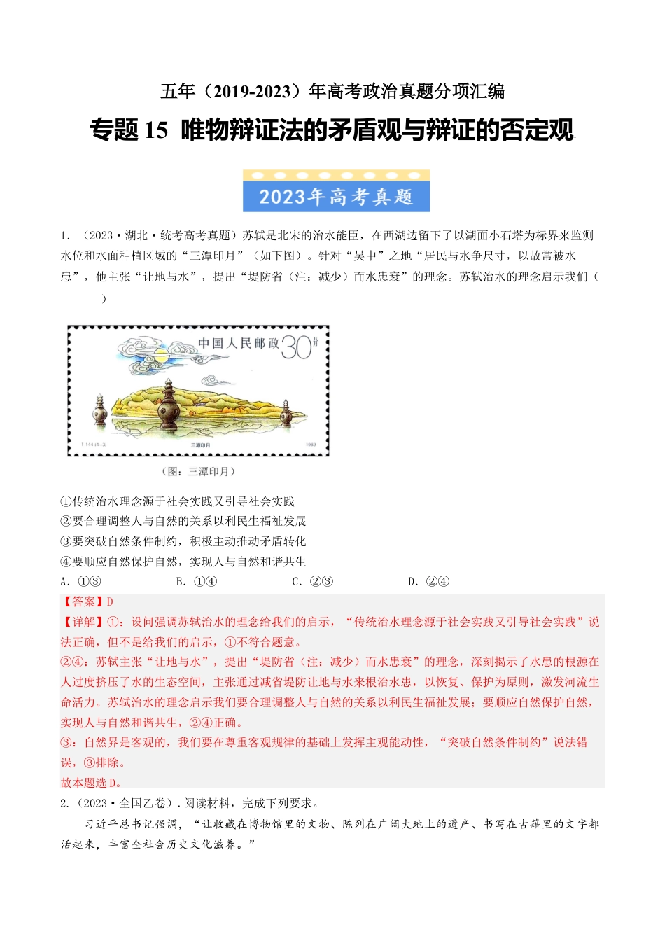 五年(2019-2023)年高考政治真题分项汇编专题15唯物辩证法的矛盾观与辩证的否定观1.(2023·湖北·统考高考真题)苏轼是北宋的治水能臣,在西湖边留下了以湖面小石塔为标界来监测水位和水面种植区域的“三潭印月”(如下图)。针对“吴中”之地“居民与水争尺寸,以故常被水患”,他主张“让地与水”,提出“堤防省(注:减少)而水患衰”的理念。苏轼治水的理念启示我们()①传统治水理念源于社会实践又引导社会实践②要合理调整人与自然的关系以利民生福祉发展③要突破自然条件制约,积极主动推动矛盾转化④要顺应自然保护自然,实现人与自然和谐共生A.①③B.①④C.②③D.②④【答案】D【详解】①:设问强调苏轼治水的理念给我们的启示,“传统治水理念源于社会实践又引导社会实践”说法正确,但不是给我们的启示,①不符合题意。②④:苏轼主张“让地与水”,提出“堤防省(注:减少)而水患衰”的理念,深刻揭示了水患的根源在人过度挤压了水的生态空间,主张通过减省堤防让地与水来根治水患,以恢复、保护为原则,激发河流生命活力。苏轼治水的理念启示我们要合理调整人与自然的关系以利民生福祉发展;要顺应自然保护自然,实现人与自然和谐共生,②④正确。③:自然界是客观的,我们要在尊重客观规律的基础上发挥主观能动性,“突破自然条件制约”说法错误,③排除。故本题选D。2.(2023·全国乙卷).阅读材料,完成下列要求。习近平总书记强调,“让收藏在博物馆里的文物、陈列在广阔大地上的遗产、书写在古籍里的文字都活起来,丰富全社会历史文化滋养。”近年来,传统文化类节目成为电视荧屏上的一大亮点,从《经典咏流传》和诗以歌、咏唱中国经典名篇,到《中国诗词大会》以选手积极竞答、观众广泛参与、专家深度阐释的方式展示中国诗词之美;从《典籍里的中国》以影视化、戏剧化、故事化的方式展现典籍中蕴含的家国情怀,中国价值,到《中国成语大会》讲述成语所承载的历史文化内涵及其背后的中国智慧;从《上新了·故宫》寻觅故宫的历史脉络与文化元素,到《如果国宝会说话》解读国宝背后的中国精神、中国审美……经过创作者的深入发掘、精心编制、精彩演绎,沉淀着历史烟云,凝结着先贤智慧的文字、故事、典籍、文物、建筑遗产“活起来”,为观众带来一场场精彩纷呈的文化盛宴,形成持续不断的传统文化热。(2)创新是传统文化富有生机与活力的重要保证,运用辩证否定观并结合材料加以说明。(3)请就新时代青年如何为传承中华优秀传统文化作贡献提出两点建议。【答案】(2)①辩证否定,是事物自身的否定,是联系的环节和发展的环节,不是肯定一切和否定一切,而是既肯定又否定,既克服又保留,实质是扬弃。要求我们树立创新意识,坚持辩证法的革命批判精神与创新意识,要密切关注变化发展的实际,敢于突破与实际不相符合的成规陈说,注重研究新情况,善于提出新问题,敢于寻找新思路。②电视荧屏上的传统文化类系列节目,都是经过创作者的深入发掘、精心编制、精彩演绎,都是对中华传统文化进行扬弃的过程,保留着优秀传统文化的精华,又融入了时代精神,持续展现了中华优秀传统文化的恒久魅力,保证了中华优秀传统文化富有生机与活力。(3)①深入挖掘中华优秀传统文化的思想精髓,积极主动传承中华优秀传统文化,使其焕发恒久魅力。②创新发展中华优秀传统文化,与中国式现代化的当代实践紧密结合,使其永葆生机活力。【详解】(2)第一步:审设问。明确题型、作答范围、问题限定和作答角度。本题为说明类主观题,要求运用辩证否定观的知识说明创新是传统文化富有生机与活力的重要保证。从理论逻辑和材料逻辑两个角度来进行分析作答。第二步:审材料,通过标点符号、段落等,提取材料有效信息。有效信息①:《典籍里的中国》以影视化、戏剧化、故事化的方式展现典籍中蕴含的家国情怀,中国价值......经过创作者的深入发掘、精心编制、精彩演绎→可联系辩证否定观的原理与方法论。(理论逻辑)有效信息②:经过创作者的深入发掘、精心编制、精彩演绎,沉淀着历史烟云,凝结着先贤智慧的文字、故事、典籍、文物、建筑遗产“活起来”,为观众带来一场场精彩纷呈...