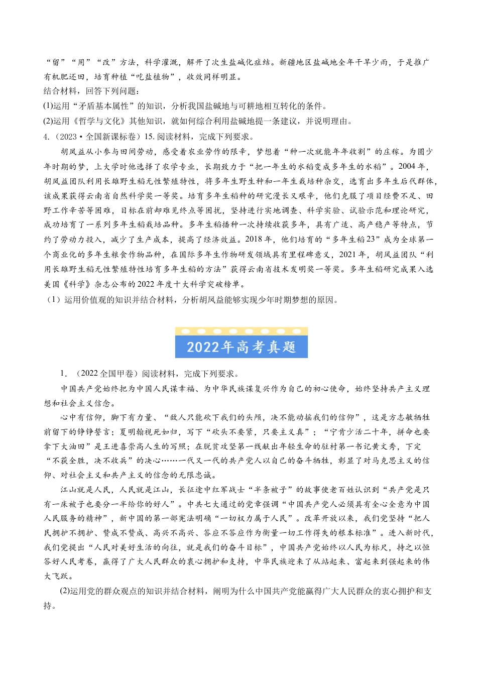 五年(2019-2023)年高考政治真题分项汇编专题20生活与哲学综合主观题1.(2023·全国甲卷)阅读材料,完成下列要求。为解决传统菌业生产中日益突出的“菌林矛盾”这一世界难题,1983年,林占熺团队引进某原产于北非多年生禾本科植物,经过不断改良,培育出耐旱抗寒、适应范围广的优质草种;1986年,该团队“以草代木”栽培食、药用菌新技术的菌草研究取得突破,创造性地实现了菌与草的结合;1996年,林占熺正式将菌草的汉语拼音确定为菌草的英文名称。随着研究的深入,林占熺团队创立了“菌草学”这门新兴学科,拓展应用菌草技术于沙漠治理、饲料生产和生物质能源与材料开发等领域,菌草新兴生态产业逐渐成型。菌草技术作为中国政府援助发展中国家实用技术培训项目、联合国“中国与其他发展中国家优先合作项目”,被推广到100多个国家,在荒漠化土地治理、助推居民脱贫致富中取得显著成效。在中国科技人员帮助下,菌草在巴布亚新几内亚种植成功,当地民众将菌草称作“中国草”,该国一部长把女儿的名字改成“菌草”。科研、扶贫几十年,林占熺拒绝高薪聘请,克服种种困难,坚持把论文写在祖国大地上,写在农民的钱袋里,在全国科技扶贫中取得显著的经济效益和社会效益,获得“中国十大扶贫状元”等多项荣誉,登上了“时代楷模”领奖台。(1)社会实践的需要推动我国菌草科学研究和技术创新不断取得新突破,运用认识论的知识对此加以阐释。2.(2023·全国乙卷).阅读材料,完成下列要求。习近平总书记强调,“让收藏在博物馆里的文物、陈列在广阔大地上的遗产、书写在古籍里的文字都活起来,丰富全社会历史文化滋养。”近年来,传统文化类节目成为电视荧屏上的一大亮点,从《经典咏流传》和诗以歌、咏唱中国经典名篇,到《中国诗词大会》以选手积极竞答、观众广泛参与、专家深度阐释的方式展示中国诗词之美;从《典籍里的中国》以影视化、戏剧化、故事化的方式展现典籍中蕴含的家国情怀,中国价值,到《中国成语大会》讲述成语所承载的历史文化内涵及其背后的中国智慧;从《上新了·故宫》寻觅故宫的历史脉络与文化元素,到《如果国宝会说话》解读国宝背后的中国精神、中国审美……经过创作者的深入发掘、精心编制、精彩演绎,沉淀着历史烟云,凝结着先贤智慧的文字、故事、典籍、文物、建筑遗产“活起来”,为观众带来一场场精彩纷呈的文化盛宴,形成持续不断的传统文化热。(2)创新是传统文化富有生机与活力的重要保证,运用辩证否定观并结合材料加以说明。(3)请就新时代青年如何为传承中华优秀传统文化作贡献提出两点建议。3.(2023·浙江·高考真题)近年来,我国各大盐碱地集中区遵循“盐随水来,盐随水去”的水盐运动规律,从自身的水盐条件出发,进行分类改造,唤醒“沉睡”的耕地资源。松嫩平原因季节性降雨不均,土地盐碱化严重,故采用培育耕层、以稻治碱、连通河湖的方法,涵养生态,沃土好水种出了优质稻。内蒙古河套灌区因大水漫灌,只灌不排,耕地出现次生盐碱化问题,但不同地块的盐碱化程度不同,故分别采用“留”“用”“改”方法,科学灌溉,解开了次生盐碱化症结。新疆地区盐碱地全年干旱少雨,于是推广有机肥还田,培育种植“吃盐植物”,收效同样明显。结合材料,回答下列问题:(1)运用“矛盾基本属性”的知识,分析我国盐碱地与可耕地相互转化的条件。(2)运用《哲学与文化》其他知识,就如何综合利用盐碱地提一条建议,并说明理由。4.(2023·全国新课标卷)15.阅读材料,完成下列要求。胡凤益从小参与田间劳动,感受着农业劳作的限辛,梦想着“种一次就能年年收割”的庄稼。为圆少年时期的梦,上大学时他选择了农学专业,长期致力于“把一年生的水稻变成多年生的水稻”。2004年,胡凤益团队利用长雄野生稻无性繁殖特性,将多年生野生种和一年生栽培种杂交,选育出多年生后代群体,该成果获得云南省自然科学奖一等奖。培育多年生稻种的研究漫长又艰辛,他们克服了项目经费不足、田野工作辛苦等困难,目标在前却难见终点等困扰,坚持进行实地调查、科学实验、试验示范和理论研究,成功培育了一系列多年生稻栽培品种。多年生稻播种一次持续收获多年,具有广...