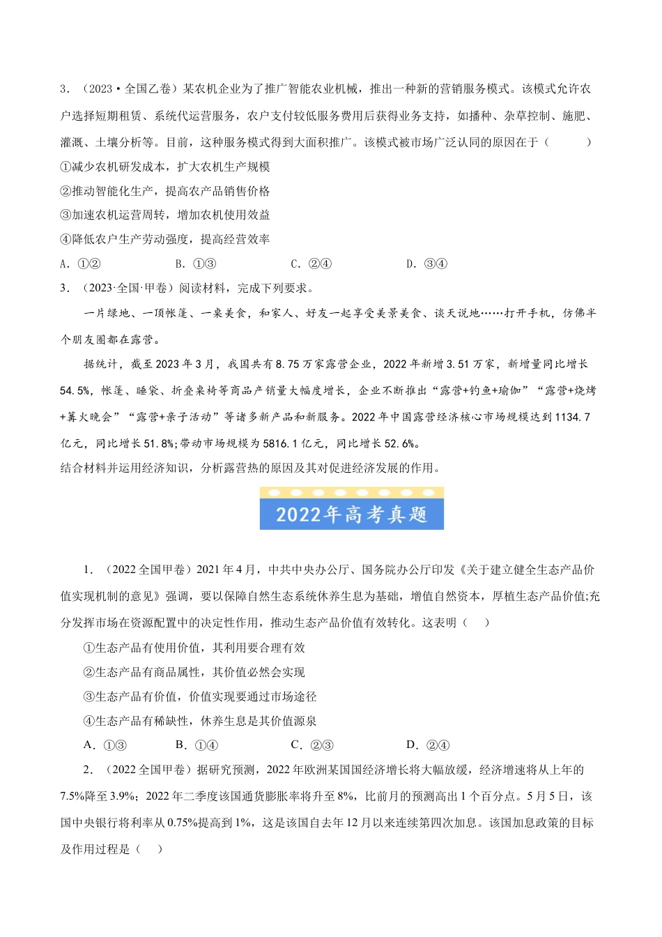 五年(2019-2023)年高考真题分项汇编专题01生活与消费1.(2023·全国甲卷)马克思劳动价值论认为,劳动是劳动者的体力和脑力的支出;劳动者通过就业取得报酬,从而获得生活来源,使社会劳动力能够不断地再生产。下列属于劳动力再生产所需费用的是()①房租②教育培训费③旅游支出④娱乐平台会员费A.①②B.①③C.②④D.③④2.(2023·全国乙卷)为刺激消费增加生产,政府出台了一系列政策,对购买甲种产品发放消费补贴,对生产乙种产品的企业减税降费,由此引起这两种产品的供需变化,如下图所示。注:①是指曲线S1到S₂的移动;②是指点E1到E₂的变动;③是指曲线D1到D₂的移动;④是指点M1到M₂的变动。图中,正确反映两种产品政策效应的是()A.甲产品:①—②;乙产品:③—④B.甲产品:③—④;乙产品:①—②C.甲产品:④—③;乙产品:②—①D.甲产品:②—①;乙产品:④—③3.(2023·全国乙卷)某农机企业为了推广智能农业机械,推出一种新的营销服务模式。该模式允许农户选择短期租赁、系统代运营服务,农户支付较低服务费用后获得业务支持,如播种、杂草控制、施肥、灌溉、土壤分析等。目前,这种服务模式得到大面积推广。该模式被市场广泛认同的原因在于()①减少农机研发成本,扩大农机生产规模②推动智能化生产,提高农产品销售价格③加速农机运营周转,增加农机使用效益④降低农户生产劳动强度,提高经营效率A.①②B.①③C.②④D.③④3.(2023·全国·甲卷)阅读材料,完成下列要求。一片绿地、一顶帐篷、一桌美食,和家人、好友一起享受美景美食、谈天说地……打开手机,仿佛半个朋友圈都在露营。据统计,截至2023年3月,我国共有8.75万家露营企业,2022年新增3.51万家,新增量同比增长54.5%,帐篷、睡袋、折叠桌椅等商品产销量大幅度增长,企业不断推出“露营+钓鱼+瑜伽”“露营+烧烤+篝火晚会”“露营+亲子活动”等诸多新产品和新服务。2022年中国露营经济核心市场规模达到1134.7亿元,同比增长51.8%;带动市场规模为5816.1亿元,同比增长52.6%。结合材料并运用经济知识,分析露营热的原因及其对促进经济发展的作用。1.(2022全国甲卷)2021年4月,中共中央办公厅、国务院办公厅印发《关于建立健全生态产品价值实现机制的意见》强调,要以保障自然生态系统休养生息为基础,增值自然资本,厚植生态产品价值;充分发挥市场在资源配置中的决定性作用,推动生态产品价值有效转化。这表明()①生态产品有使用价值,其利用要合理有效②生态产品有商品属性,其价值必然会实现③生态产品有价值,价值实现要通过市场途径④生态产品有稀缺性,休养生息是其价值源泉A.①③B.①④C.②③D.②④2.(2022全国甲卷)据研究预测,2022年欧洲某国国经济增长将大幅放缓,经济增速将从上年的7.5%降至3.9%;2022年二季度该国通货膨胀率将升至8%,比前月的预测高出1个百分点。5月5日,该国中央银行将利率从0.75%提高到1%,这是该国自去年12月以来连续第四次加息。该国加息政策的目标及作用过程是()A.提高利率——流通中的货币量增加——促进消费——刺激经济增长B.提高利率——流通中的货币量减少——物价下降——抑制通货膨胀C.提高利率——储蓄增加——投资规模扩大——商品供给增加——抑制通货膨胀D.提高利率——境外资金流入——本币贬值——促进商品出口——刺激经济增长3.(2022浙江卷)2022年4月,国际原油价格相较于2021年每桶上涨了几十美元。此时,生产者将会()A.扩大生产规模B.压缩生产规模C.维持原有生产规模D.视获利情况而定生产规模4.(2022浙江卷)近两年我国居民人均可支配收入平均实际增长5.1%,增速比疫情前的2019年放缓0.7%,居民的消费能力、消费意愿有所减弱。为了防止消费增速持续放缓,国家应()①进一步鼓励企业扩大投资②鼓励居民将线上消费作为主要消费方式③出台更多刺激消费的政策④多渠道增加居民收入A.①②B.①③C.②④D.③④5.(2022全国乙卷)2022年中央一号文件明确要求:适当提高稻谷、小麦最低收购价,健全农民种粮收益保障机制;在黄淮海、西北、西南地区推广玉米大豆带状复合种植,在东北地区开展...