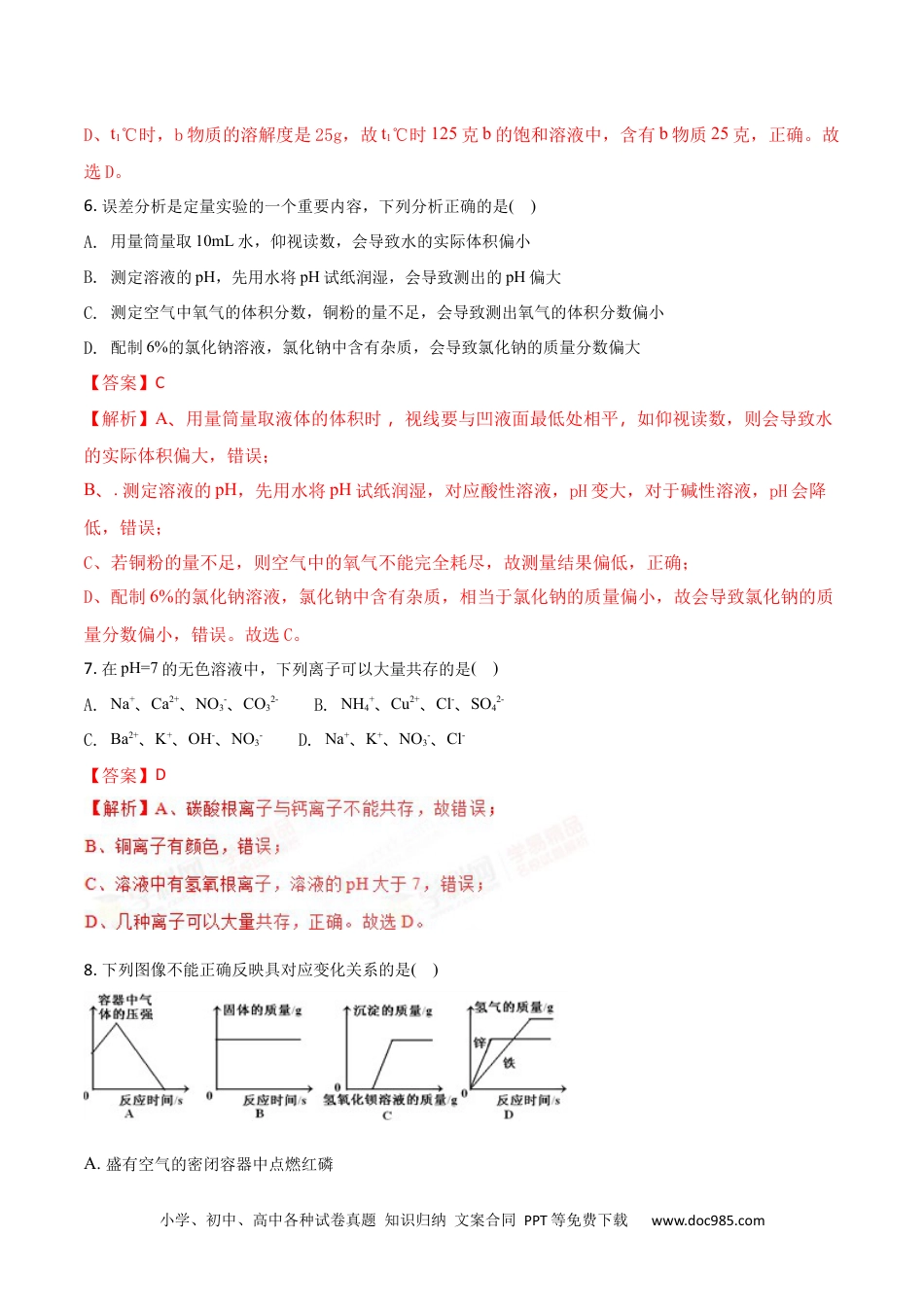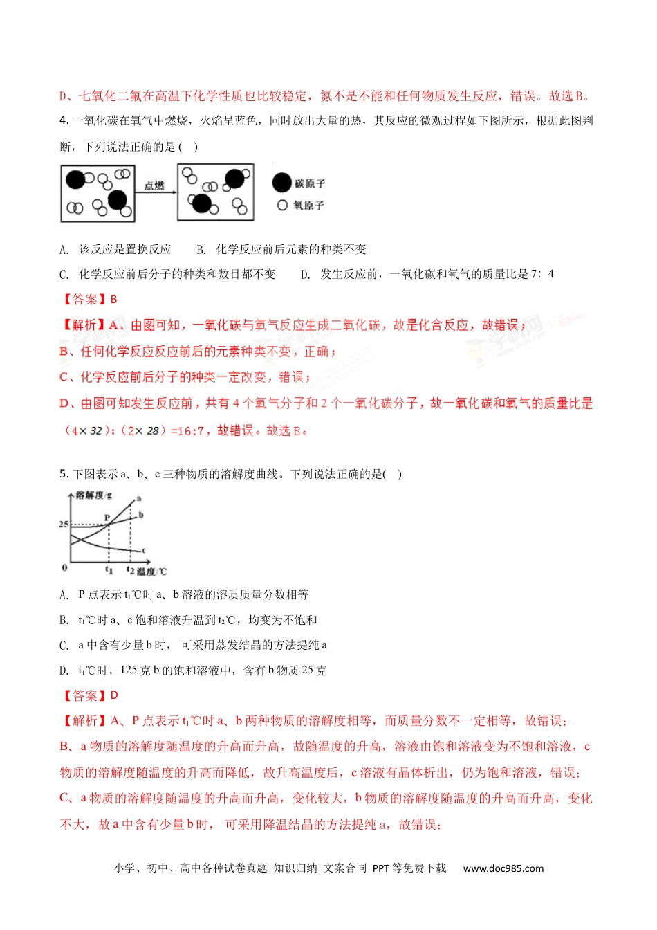 小学、初中、高中各种试卷真题知识归纳文案合同PPT等免费下载www.doc985.com2018年四川省达州市中考化学试题相对原子质量:H-1C-12O-16F-19Cl-35.5Ca-40Fe-56Zn-65一、选择题1.日常生活中的下列现象,没有发生化学变化的是()A.食物腐败B.绿色植物光合作用C.矿石粉碎D.铵态氮肥与熟石灰混合施用【答案】C【解析】A、食物腐败是食物发生的缓慢氧化的过程,故发生了化学变化,故错误;B、植物的光合作用吸收二氧化碳和水生成葡萄糖和氧气,发生了化学变化,错误;C、矿石粉碎是矿石发生形状的变化,没有新物质的生成,是物理变化,正确;D、铵态氮肥与熟石灰混合施用有氨气放出,发生了化学变化,错误。故选C。2.化学与我们的生活息息相关,下列说法错误的是()A.人体的需的热量主要来自糖类B.新能源包括核能、风能和太阳能等C.有机高分子合成材料包括塑料、合成纤维和合成橡胶等D.钙是人体所需要的一种微量元素,缺钙会导致贫血病【答案】D【解析】A.人体的热量主要来自糖类,正确;B.新能源包括核能、风能和太阳能等,正确;C.有机高分子合成材料包括塑料、合成纤维和合成橡胶等,正确;D.缺铁会导致贫血病,缺钙会导致骨质疏松,错误。故选D。3.近年,科学家在较低的温度下,第一次制得了七氧化二氟,它在高温下化学性质也比较稳定。下列有关七氧化二氟的说法正确的是()A.氟氧元素的质量比为2:7B.七氧化二氟属于氧化物C.氟元素的化合价为-1价D.一定不能和其他物质发生化学反应【答案】B【解析】A、七氧化二氟的原子个数比为7:2,故元素质量比不可能是7:2,故错误;B、七氧化二氟是由两种元素组成,其中一种元素是氧元素,故是氧化物,正确;C、七氧化二氟中氟元素的化合价为+7价,故错误;小学、初中、高中各种试卷真题知识归纳文案合同PPT等免费下载www.doc985.comD、七氧化二氟在高温下化学性质也比较稳定,氮不是不能和任何物质发生反应,错误。故选B。4.一氧化碳在氧气中燃烧,火焰呈蓝色,同时放出大量的热,其反应的微观过程如下图所示,根据此图判断,下列说法正确的是()A.该反应是置换反应B.化学反应前后元素的种类不变C.化学反应前后分子的种类和数目都不变D.发生反应前,一氧化碳和氧气的质量比是7:4【答案】B5.下图表示a、b、c三种物质的溶解度曲线。下列说法正确的是()A.P点表示t1℃时a、b溶液的溶质质量分数相等B.t1℃时a、c饱和溶液升温到t2℃,均变为不饱和C.a中含有少量b时,可采用蒸发结晶的方法提纯aD.t1℃时,125克b的饱和溶液中,含有b物质25克【答案】D【解析】A、P点表示t1℃时a、b两种物质的溶解度相等,而质量分数不一定相等,故错误;B、a物质的溶解度随温度的升高而升高,故随温度的升高,溶液由饱和溶液变为不饱和溶液,c物质的溶解度随温度的升高而降低,故升高温度后,c溶液有晶体析出,仍为饱和溶液,错误;C、a物质的溶解度随温度的升高而升高,变化较大,b物质的溶解度随温度的升高而升高,变化不大,故a中含有少量b时,可采用降温结晶的方法提纯a,故错误;小学、初中、高中各种试卷真题知识归纳文案合同PPT等免费下载www.doc985.comD、t1℃时,b物质的溶解度是25g,故t1℃时125克b的饱和溶液中,含有b物质25克,正确。故选D。6.误差分析是定量实验的一个重要内容,下列分析正确的是()A.用量筒量取10mL水,仰视读数,会导致水的实际体积偏小B.测定溶液的pH,先用水将pH试纸润湿,会导致测出的pH偏大C.测定空气中氧气的体积分数,铜粉的量不足,会导致测出氧气的体积分数偏小D.配制6%的氯化钠溶液,氯化钠中含有杂质,会导致氯化钠的质量分数偏大【答案】C【解析】A、用量筒量取液体的体积时,视线要与凹液面最低处相平,如仰视读数,则会导致水的实际体积偏大,错误;B、.测定溶液的pH,先用水将pH试纸润湿,对应酸性溶液,pH变大,对于碱性溶液,pH会降低,错误;C、若铜粉的量不足,则空气中的氧气不能完全耗尽,故测量结果偏低,正确;D、配制6%的氯化钠溶液,氯化钠中含有杂质,相当于氯化钠的质量偏小,故会导致氯化钠的质量分数偏小,错误。故选C。7.在pH=7的无色溶液中,下列离子可以大量共存的是()A.Na+、Ca2+、NO3-、CO32-B.NH4+、Cu2+...