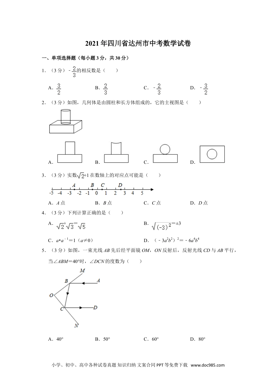 2021年四川省达州市中考数学试卷一、单项选择题(每小题3分,共30分)1.(3分)﹣的相反数是()A.B.C.﹣D.﹣2.(3分)如图,几何体是由圆柱和长方体组成的,它的主视图是()A.B.C.D.3.(3分)实数+1在数轴上的对应点可能是()A.A点B.B点C.C点D.D点4.(3分)下列计算正确的是()A.+=B.=±3C.a•a﹣1=1(a≠0)D.(﹣3a2b2)2=﹣6a4b45.(3分)如图,一束光线AB先后经平面镜OM,ON反射后,反射光线CD与AB平行,当∠ABM=40°时,∠DCN的度数为()A.40°B.50°C.60°D.80°小学、初中、高中各种试卷真题知识归纳文案合同PPT等免费下载www.doc985.com6.(3分)在反比例函数y=(k为常数)上有三点A(x1,y1),B(x2,y2),C(x3,y3),若x1<0<x2<x3,则y1,y2,y3的大小关系为()A.y1<y2<y3B.y2<y1<y3C.y1<y3<y2D.y3<y2<y17.(3分)以下命题是假命题的是()A.的算术平方根是2B.有两边相等的三角形是等腰三角形C.一组数据:3,﹣1,1,1,2,4的中位数是1.5D.过直线外一点有且只有一条直线与已知直线平行8.(3分)生活中常用的十进制是用0~9这十个数字来表示数,满十进一,例:12=1×10+2,212=2×10×10+1×10+2;计算机也常用十六进制来表示字符代码,它是用0~F来表示0~15,满十六进一,它与十进制对应的数如表:十进制012…891011121314151617…十六进制012…89ABCDEF1011…例:十六进制2B对应十进制的数为2×16+11=43,10C对应十进制的数为1×16×16+0×16+12=268,那么十六进制中14E对应十进制的数为()A.28B.62C.238D.3349.(3分)在平面直角坐标系中,等边△AOB如图放置,点A的坐标为(1,0),每一次将△AOB绕着点O逆时针方向旋转60°,同时每边扩大为原来的2倍,第一次旋转后得到△A1OB1,第二次旋转后得到△A2OB2,…,依次类推,则点A2021的坐标为()小学、初中、高中各种试卷真题知识归纳文案合同PPT等免费下载www.doc985.comA.(﹣22020,﹣×22020)B.(22021,﹣×22021)C.(22020,﹣×22020)D.(﹣22021,﹣×22021)10.(3分)如图,已知抛物线y=ax2+bx+c(a,b,c为常数,a≠0)经过点(2,0),且对称轴为直线x=,有下列结论:①abc>0;②a+b>0;③4a+2b+3c<0;④无论a,b,c取何值,抛物线一定经过(,0);⑤4am2+4bm﹣b≥0.其中正确结论有()A.1个B.2个C.3个D.4个二、填空题(每小题3分,共18分)11.(3分)截至2020年末,达州市金融精准扶贫共计392.5亿元,居全省第2,惠及建档立卡贫困户8.96万人,将392.5亿元用科学记数法表示应为元.12.(3分)如图是一个运算程序示意图,若开始输入x的值为3,则输出y值为.13.(3分)已知a,b满足等式a2+6a+9+=0,则a2021b2020=.14.(3分)如图,将一把矩形直尺ABCD和一块等腰直角三角板EFG摆放在平面直角坐标系中,AB在x轴上,点G与点A重合,点F在AD上,EF交BC于点M,反比例函数y=(x<0)的图象恰好经过点F,M,若直尺的宽CD=1,三角板的斜边FG=4,则k=.小学、初中、高中各种试卷真题知识归纳文案合同PPT等免费下载www.doc985.com15.(3分)若分式方程﹣4=的解为整数,则整数a=.16.(3分)如图,在边长为6的等边△ABC中,点E,F分别是边AC,BC上的动点,且AE=CF,连接BE,AF交于点P,连接CP,则CP的最小值为.三、解答题:解答时应写出必要的文字说明、证明过程或演算步骤(共72分)17.(5分)计算:﹣12+(π﹣2021)0+2sin60°﹣|1﹣|.18.(7分)化简求值:(1﹣)÷(),其中a与2,3构成三角形的三边,且a为整数.19.(7分)为庆祝中国共产党成立100周年,在中小学生心中厚植爱党情怀,我市开展“童心向党”教育实践活动,某校准备组织学生参加唱歌,舞蹈,书法,国学诵读活动,为了解学生的参与情况,该校随机抽取了部分学生进行“你愿意参加哪一项活动”(必选且只选一种)的问卷调查.根据调查结果绘制了条形统计图和扇形统计图,部分信息如下:(1)这次抽样调查的总人数为人,扇形统计图中“舞蹈”对应的圆心角度数为;(2)若该校有1400名学生,估计选择参加书法的有多少人?(3)学校准备从推...