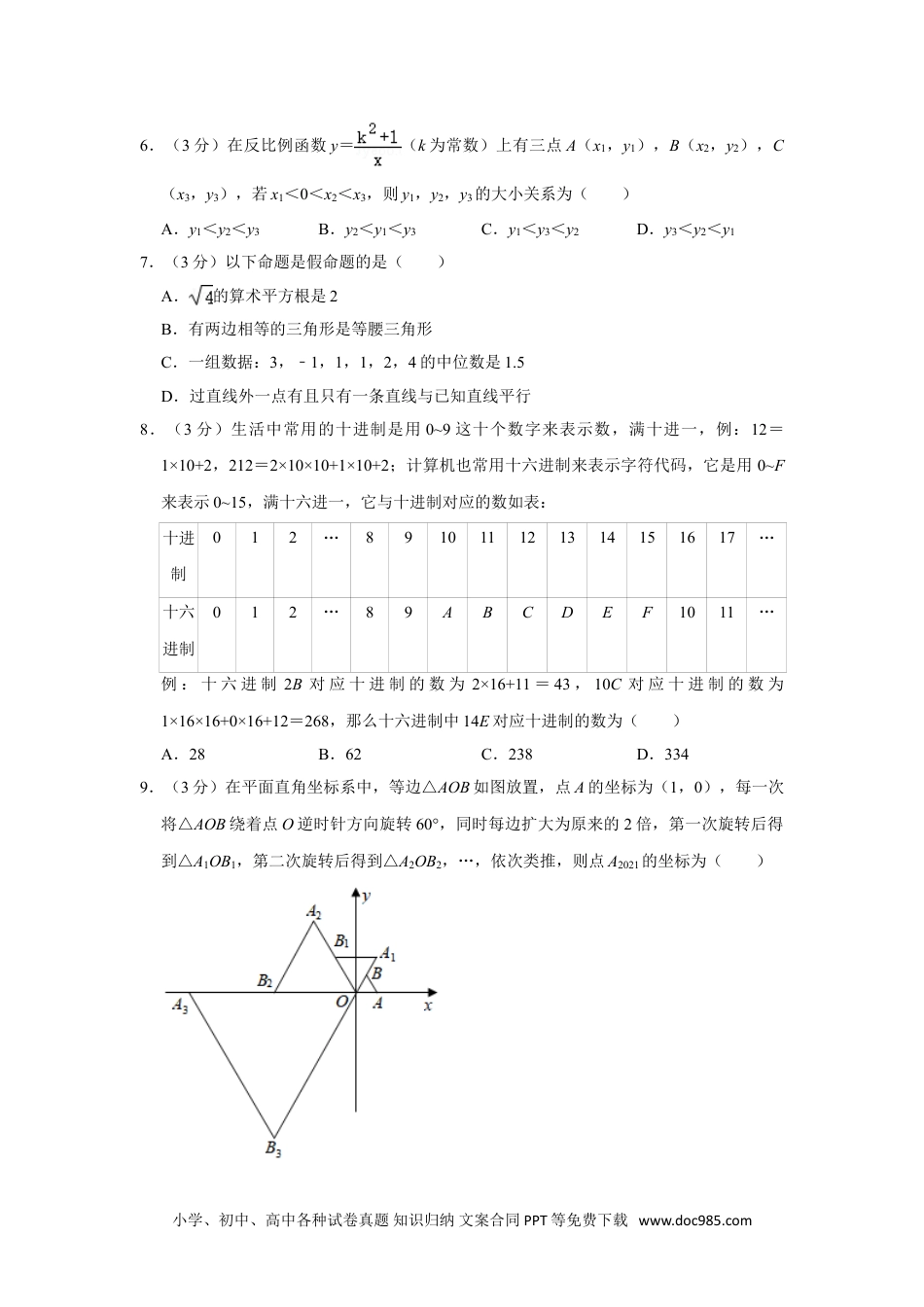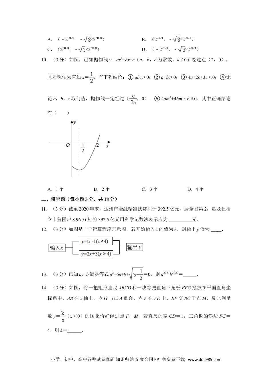 2021年四川省达州市中考数学试卷一、单项选择题(每小题3分,共30分)1.(3分)﹣的相反数是()A.B.C.﹣D.﹣2.(3分)如图,几何体是由圆柱和长方体组成的,它的主视图是()A.B.C.D.3.(3分)实数+1在数轴上的对应点可能是()A.A点B.B点C.C点D.D点4.(3分)下列计算正确的是()A.+=B.=±3C.a•a﹣1=1(a≠0)D.(﹣3a2b2)2=﹣6a4b45.(3分)如图,一束光线AB先后经平面镜OM,ON反射后,反射光线CD与AB平行,当∠ABM=40°时,∠DCN的度数为()A.40°B.50°C.60°D.80°小学、初中、高中各种试卷真题知识归纳文案合同PPT等免费下载www.doc985.com6.(3分)在反比例函数y=(k为常数)上有三点A(x1,y1),B(x2,y2),C(x3,y3),若x1<0<x2<x3,则y1,y2,y3的大小关系为()A.y1<y2<y3B.y2<y1<y3C.y1<y3<y2D.y3<y2<y17.(3分)以下命题是假命题的是()A.的算术平方根是2B.有两边相等的三角形是等腰三角形C.一组数据:3,﹣1,1,1,2,4的中位数是1.5D.过直线外一点有且只有一条直线与已知直线平行8.(3分)生活中常用的十进制是用0~9这十个数字来表示数,满十进一,例:12=1×10+2,212=2×10×10+1×10+2;计算机也常用十六进制来表示字符代码,它是用0~F来表示0~15,满十六进一,它与十进制对应的数如表:十进制012…891011121314151617…十六进制012…89ABCDEF1011…例:十六进制2B对应十进制的数为2×16+11=43,10C对应十进制的数为1×16×16+0×16+12=268,那么十六进制中14E对应十进制的数为()A.28B.62C.238D.3349.(3分)在平面直角坐标系中,等边△AOB如图放置,点A的坐标为(1,0),每一次将△AOB绕着点O逆时针方向旋转60°,同时每边扩大为原来的2倍,第一次旋转后得到△A1OB1,第二次旋转后得到△A2OB2,…,依次类推,则点A2021的坐标为()小学、初中、高中各种试卷真题知识归纳文案合同PPT等免费下载www.doc985.comA.(﹣22020,﹣×22020)B.(22021,﹣×22021)C.(22020,﹣×22020)D.(﹣22021,﹣×22021)10.(3分)如图,已知抛物线y=ax2+bx+c(a,b,c为常数,a≠0)经过点(2,0),且对称轴为直线x=,有下列结论:①abc>0;②a+b>0;③4a+2b+3c<0;④无论a,b,c取何值,抛物线一定经过(,0);⑤4am2+4bm﹣b≥0.其中正确结论有()A.1个B.2个C.3个D.4个二、填空题(每小题3分,共18分)11.(3分)截至2020年末,达州市金融精准扶贫共计392.5亿元,居全省第2,惠及建档立卡贫困户8.96万人,将392.5亿元用科学记数法表示应为元.12.(3分)如图是一个运算程序示意图,若开始输入x的值为3,则输出y值为.13.(3分)已知a,b满足等式a2+6a+9+=0,则a2021b2020=.14.(3分)如图,将一把矩形直尺ABCD和一块等腰直角三角板EFG摆放在平面直角坐标系中,AB在x轴上,点G与点A重合,点F在AD上,EF交BC于点M,反比例函数y=(x<0)的图象恰好经过点F,M,若直尺的宽CD=1,三角板的斜边FG=4,则k=.小学、初中、高中各种试卷真题知识归纳文案合同PPT等免费下载www.doc985.com15.(3分)若分式方程﹣4=的解为整数,则整数a=.16.(3分)如图,在边长为6的等边△ABC中,点E,F分别是边AC,BC上的动点,且AE=CF,连接BE,AF交于点P,连接CP,则CP的最小值为.三、解答题:解答时应写出必要的文字说明、证明过程或演算步骤(共72分)17.(5分)计算:﹣12+(π﹣2021)0+2sin60°﹣|1﹣|.18.(7分)化简求值:(1﹣)÷(),其中a与2,3构成三角形的三边,且a为整数.19.(7分)为庆祝中国共产党成立100周年,在中小学生心中厚植爱党情怀,我市开展“童心向党”教育实践活动,某校准备组织学生参加唱歌,舞蹈,书法,国学诵读活动,为了解学生的参与情况,该校随机抽取了部分学生进行“你愿意参加哪一项活动”(必选且只选一种)的问卷调查.根据调查结果绘制了条形统计图和扇形统计图,部分信息如下:(1)这次抽样调查的总人数为人,扇形统计图中“舞蹈”对应的圆心角度数为;(2)若该校有1400名学生,估计选择参加书法的有多少人?(3)学校准备从推...