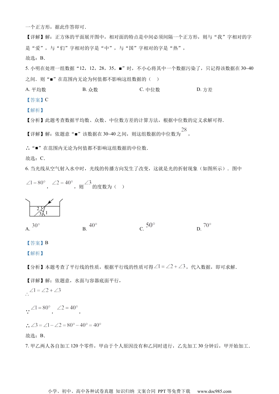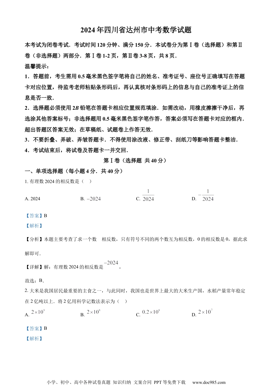 小学、初中、高中各种试卷真题知识归纳文案合同PPT等免费下载www.doc985.com2024年四川省达州市中考数学试题本考试为闭卷考试.考试时间120分钟、满分150分.本试卷分为第Ⅰ卷(选择题)和第Ⅱ卷(非选择题)两部分.第Ⅰ卷1-2页,第Ⅱ卷3-8页,共8页.温馨提示:1.答题前,考生需用0.5毫米黑色签字笔将自己的姓名、准考证号、座位号正确填写在答题卡对应位置,待监考老师粘贴条形码后,再认真核对条形码上的信息与自己的准考证上的信息是否一致.2.选择题必须使用2B铅笔在答题卡相应位置规范填涂.如需改动,用橡皮擦擦干净后,再选涂其他答案标号;非选择题用0.5毫米黑色签字笔作答,答案必须写在答题卡对应的框内.超出答题区答案无效;在草稿纸、试题卷上作答无效.3.不要折叠、弄破、弄皱答题卡.不得使用涂改液、修正带、刮纸刀等影响答题卡整洁.4.考试结束后,将试卷及答题卡一并交回.第Ⅰ卷(选择题共40分)一、单项选择题(每小题4分.共40分)1.有理数2024的相反数是()A.2024B.C.D.【答案】B【解析】【分析】本题主要考查了求一个数的相反数,只有符号不同的两个数互为相反数,0的相反数是0,据此求解即可.【详解】解:有理数2024的相反数是,故选:B.2.大米是我国居民最重要的主食之一,与此同时,我国也是世界上最大的大米生产国,水稻产量常年稳定在2亿吨以上.将2亿用科学记数法表示为()A.B.C.D.【答案】B【解析】小学、初中、高中各种试卷真题知识归纳文案合同PPT等免费下载www.doc985.com【分析】本题考查了科学记数法.科学记数法的表示形式为的形式,其中,为整数.确定的值时,要看把原数变成时,小数点移动了多少位,的绝对值大于与小数点移动的位数相同.【详解】解:2亿,故选:B.3.下列计算正确的是()A.B.C.D.【答案】C【解析】【分析】本题主要考查了完全平方公式,积的乘方计算,同底数幂除法计算,合并同类项,熟知相关计算法则是解题的关键.【详解】解:A、与不是同类项,不能合并,原式计算错误,不符合题意;B、,原式计算错误,不符合题意;C、,原式计算正确,符合题意;D、,原式计算错误,不符合题意;故选:C.4.如图,正方体的表面展开图上写有“我们热爱中国”六个字,还原成正方体后“我”的对面的字是()A.热B.爱C.中D.国【答案】B【解析】【分析】本题考查了正方体相对两个面上的文字,正方体的平面展开图中,相对面的特点是中间必须间隔小学、初中、高中各种试卷真题知识归纳文案合同PPT等免费下载www.doc985.com一个正方形,据此作答即可.【详解】解:正方体的平面展开图中,相对面的特点是中间必须间隔一个正方形,则与“我”字相对的字是“爱”,与“们”字相对的字是“中”,与“国”字相对的字是“热”,故选:B.5.小明在处理一组数据“12,12,28,35,■”时,不小心将其中一个数据污染了,只记得该数据在30~40之间.则“■”在范围内无论为何值都不影响这组数据的()A.平均数B.众数C.中位数D.方差【答案】C【解析】【分析】此题考查数据平均数、众数、中位数方差的计算方法,根据中位数的定义求解可得.【详解】解:依题意“■”该数据在30~40之间,则这组数据的中位数为,∴“■”在范围内无论为何值都不影响这组数据的中位数.故选:C.6.当光线从空气射入水中时,光线的传播方向发生了改变,这就是光的折射现象(如图所示).图中,,则的度数为()A.B.C.D.【答案】B【解析】【分析】本题考查了平行线的性质,根据平行线的性质可得,代入数据,即可求解.【详解】解:依题意,水面与容器底面平行,∴ ,,∴故选:B.7.甲乙两人各自加工120个零件,甲由于个人原因没有和乙同时进行,乙先加工30分钟后,甲开始加工.小学、初中、高中各种试卷真题知识归纳文案合同PPT等免费下载www.doc985.com甲为了追赶上乙的进度,加工的速度是乙的倍,最后两人同时完成.求乙每小时加工零件多少个?设乙每小时加工个零件.可列方程为()A.B.C.D.【答案】D【解析】【分析】本题主要考查了分式方程的实际应用,设乙每小时加工个零件,则甲每小时加工个零件,再根据时间工作总量工作效率结合甲的工作时间比乙的工作时间...
