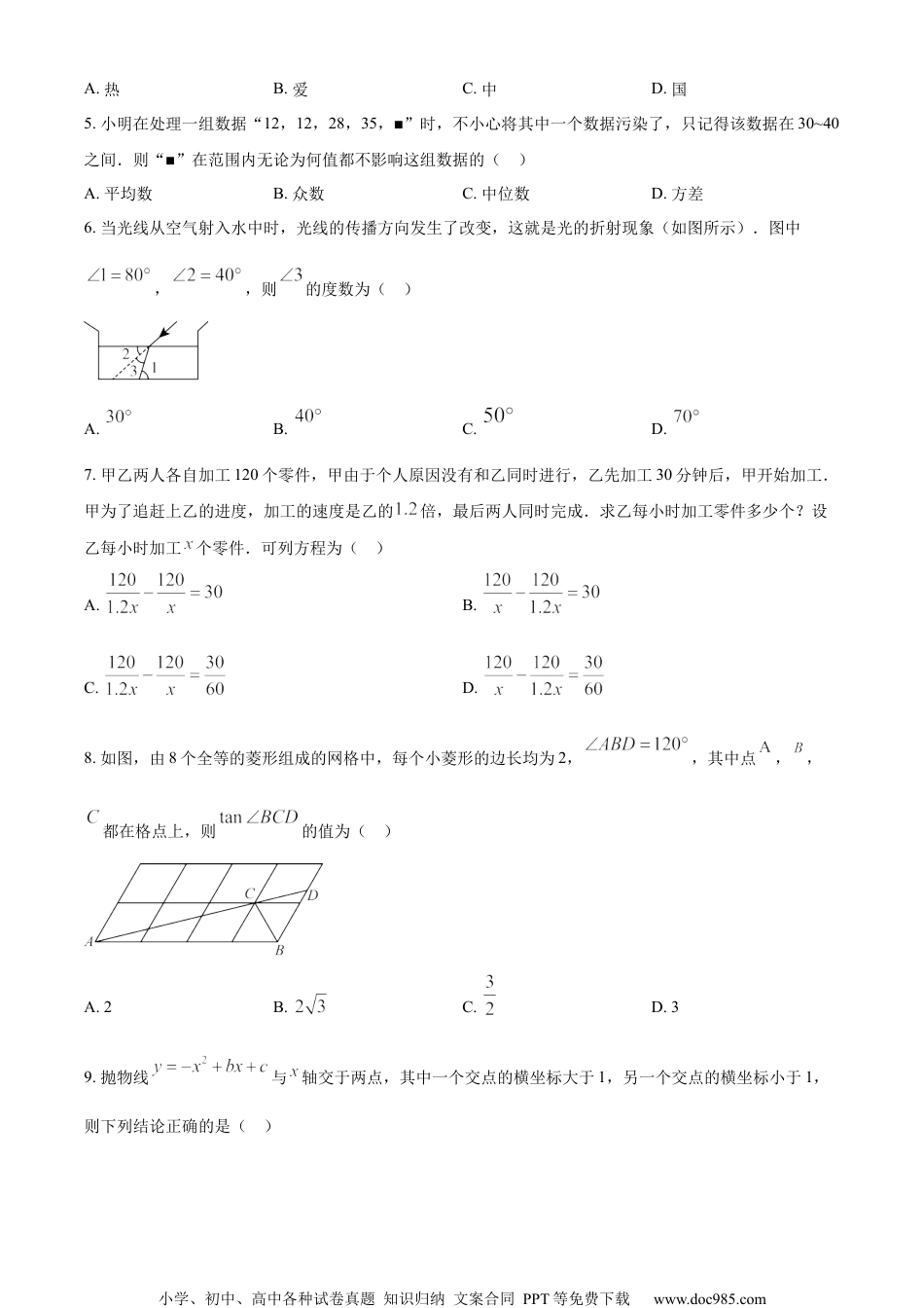 小学、初中、高中各种试卷真题知识归纳文案合同PPT等免费下载www.doc985.com2024年四川省达州市中考数学试题本考试为闭卷考试.考试时间120分钟、满分150分.本试卷分为第Ⅰ卷(选择题)和第Ⅱ卷(非选择题)两部分.第Ⅰ卷1-2页,第Ⅱ卷3-8页,共8页.温馨提示:1.答题前,考生需用0.5毫米黑色签字笔将自己的姓名、准考证号、座位号正确填写在答题卡对应位置,待监考老师粘贴条形码后,再认真核对条形码上的信息与自己的准考证上的信息是否一致.2.选择题必须使用2B铅笔在答题卡相应位置规范填涂.如需改动,用橡皮擦擦干净后,再选涂其他答案标号;非选择题用0.5毫米黑色签字笔作答,答案必须写在答题卡对应的框内.超出答题区答案无效;在草稿纸、试题卷上作答无效.3.不要折叠、弄破、弄皱答题卡.不得使用涂改液、修正带、刮纸刀等影响答题卡整洁.4.考试结束后,将试卷及答题卡一并交回.第Ⅰ卷(选择题共40分)一、单项选择题(每小题4分.共40分)1.有理数2024的相反数是()A.2024B.C.D.2.大米是我国居民最重要的主食之一,与此同时,我国也是世界上最大的大米生产国,水稻产量常年稳定在2亿吨以上.将2亿用科学记数法表示为()A.B.C.D.3.下列计算正确的是()A.B.C.D.4.如图,正方体的表面展开图上写有“我们热爱中国”六个字,还原成正方体后“我”的对面的字是()小学、初中、高中各种试卷真题知识归纳文案合同PPT等免费下载www.doc985.comA.热B.爱C.中D.国5.小明在处理一组数据“12,12,28,35,■”时,不小心将其中一个数据污染了,只记得该数据在30~40之间.则“■”在范围内无论为何值都不影响这组数据的()A.平均数B.众数C.中位数D.方差6.当光线从空气射入水中时,光线的传播方向发生了改变,这就是光的折射现象(如图所示).图中,,则的度数为()A.B.C.D.7.甲乙两人各自加工120个零件,甲由于个人原因没有和乙同时进行,乙先加工30分钟后,甲开始加工.甲为了追赶上乙的进度,加工的速度是乙的倍,最后两人同时完成.求乙每小时加工零件多少个?设乙每小时加工个零件.可列方程为()A.B.C.D.8.如图,由8个全等的菱形组成的网格中,每个小菱形的边长均为2,,其中点,,都在格点上,则的值为()A.2B.C.D.39.抛物线与轴交于两点,其中一个交点的横坐标大于1,另一个交点的横坐标小于1,则下列结论正确的是()小学、初中、高中各种试卷真题知识归纳文案合同PPT等免费下载www.doc985.comA.B.C.D.10.如图,是等腰直角三角形,,,点,分别在,边上运动,连结,交于点,且始终满足,则下列结论:①;②;③面积的最大值是;④的最小值是.其中正确的是()A.①③B.①②④C.②③④D.①②③④第II卷(非选择题共110分)二、填空题(每小题4分,共20分)11.分解因式:3x218x+27=﹣________.12.“四大名著”《红楼梦》《水浒传》《三国演义》《西游记》是中国优秀文化的重要组成部分.某校七年级准备从这四部名著中随机抽取两本(先随机抽取一本,不放回,再随机抽取另一本)开展“名著共读”活动,则该年级的学生恰好抽取到《三国演义》和《西游记》的概率是______.13.若关于的方程无解,则的值为______.14.如图,在中,,分别是内角、外角的三等分线,且,,在中,,分别是内角,外角的三等分线.且,,…,以此规律作下去.若小学、初中、高中各种试卷真题知识归纳文案合同PPT等免费下载www.doc985.com.则______度.15.如图,在中,.点在线段上,.若,,则的面积是______.三、解答题:解答时应写出必要的文字说明、证明过程或演算步骤(共90分)16.(1)计算:;(2)解不等式组17.先化简:,再从,,0,1,2之中选择一个合适的数作为的值代入求值.18.2024年4月21日,达州马拉松暨“跑遍四川”达州站马拉松赛鸣枪开跑.本次赛事以“相约巴人故里,乐跑红色达州”为主题.旨在增强全市民众科学健身意识.推动全民健身活动,本届赛事共设置马拉松,半程马拉松和欢乐跑三个项目赛后随机抽样了部分参赛选手对本次赛事组织进行满意度评分调查,整理后得到下列不完整的图表:小学、初中、高中各种试卷真题知识归纳文案合同PPT等免费下载www.doc985.com...