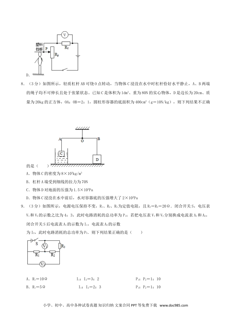2019年四川省达州市中考物理真题及答案一、选择题(1-10小题为物理题,每题3分;在每小题给出的四个选项中,只有一项符合题目要求)1.(3分)下列关于声现象的说法中正确的是()A.只要物体振动,我们就一定能听到声音B.“隔墙有耳”说明固体可以传声C.汽车的“倒车雷达”是利用次声传递能量D.声源的振幅越大,听到声音的响度就一定越大2.(3分)下列关于光现象的说法中正确的是()A.站在岸边看见水中的白云是光的折射形成的B.我们能看清物体是因为眼睛能发出光线C.近视眼应配戴凹透镜矫正D.用放大镜看物体时物体一定被放大3.(3分)下列关于热现象的说法中正确的是()A.物体的温度越高所含的热量越多B.内燃机的做功冲程将机械能转化成内能C.打扫卫生时灰尘飞扬说明分子在永不停息地做无规则运动D.物质的比热容越大反映了物质吸收或放出热量的能力越强4.(3分)下列关于力的说法中正确的是()A.两个物体不接触就一定不产生力B.摩擦力的方向一定与物体的运动方向相反C.浸没在水中向上运动的物体浮力可能小于重力D.随着生产力的提高人类将会制造出既省力又省距离的机械5.(3分)如图所示,甲、乙均为理想电表,当开关S闭合后灯L1、L2都能发光,下列说法中正确的是()A.灯L1、L2是串联在电路中的B.甲一定是电流表,乙一定是电压表小学、初中、高中各种试卷真题知识归纳文案合同PPT等免费下载www.doc985.comC.当L2短路时L1仍能发光D.乙、甲两电表示数的比值与L1的阻值相等6.(3分)如图所示,甲、乙两个底面积不同的圆柱形容器中分别盛有两种不同的液体A、B,液体对两个容器底的压强相等。现将两个质量相等的物体分别放入两个容器中,静止时个漂浮、一个悬浮(液体均无溢出,则液体密度ρA、ρB和液体对容器底部的压强p甲、p乙的大小关系正确的是()A.ρA<ρBp甲<p乙B.ρA>ρBp甲>p乙C.ρA>ρBp甲<p乙D.ρA<ρBp甲>p乙7.(3分)如图是物理兴趣小组设计的四个测量身高的电路图,身高仪都由电压表改装而成。能实现身高越高身高仪示数越大且刻度均匀的电路是()A.B.C.小学、初中、高中各种试卷真题知识归纳文案合同PPT等免费下载www.doc985.comD.8.(3分)如图所示,轻质杠杆AB可绕O点转动,当物体C浸没在水中时杠杆恰好水平静止,A、B两端的绳子均不可伸长且处于张紧状态。已知C是体积为1dm3、重为80N的实心物体,D是边长为20cm、质量为20kg的正方体,OA:OB=2:1,圆柱形容器的底面积为400cm2(g=10N/kg),则下列结果不正确的是()A.物体C的密度为8×103kg/m3B.杠杆A端受到细线的拉力为70NC.物体D对地面的压强为1.5×103PaD.物体C浸没在水中前后,水对容器底的压强增大了2×103Pa9.(3分)如图所示,电源电压保持不变,R1、R2、R3为定值电阻,且R2=R3=20Ω.闭合开关S,电压表V1和V2的示数之比为4:3,此时电路消耗的总功率为P1;若把电压表V1和V2分别换成电流表A1和A2,闭合开关S后电流表A1的示数为I1,电流表A2的示数为I2,此时电路消耗的总功率为P2.则下列结果正确的是()A.R1=10ΩI1:I2=3:2P1:P2=1:10B.R1=5ΩI1:I2=2:3P1:P2=1:10小学、初中、高中各种试卷真题知识归纳文案合同PPT等免费下载www.doc985.comC.R1=10ΩI1:I2=3:2P1:P2=10:1D.R1=5ΩI1:I2=2:3P1:P2=10:110.(3分)如图甲所示,电源电压保持不变,R1为定值电阻,滑动变阻器R2的最大阻值为30Ω,电压表的量程为0~15V.电压表的示数与滑动变阻器R2的关系如图乙所示。则下列结果正确的是()A.电源电压为20VB.R1的阻值为5ΩC.为了保证电压表不被烧坏,滑动变阻器的阻值变化范围为4~30ΩD.开关S闭合后电路消耗的最小功率为14.4W二、填空题(本大题9小题,每空1分,共22分)11.(3分)牵引车将停放在机库的战斗机拖出的过程中,说明力可以改变物体的;战斗机机翼下平上凸,目的是使战机飞行时机翼下方空气的流速小于机翼上方空气的流速,从而使机翼下方空气的压强机翼上方空气的压强(选填“大于”、“等于”或“小于”);战斗机在进入战斗前抛掉副油箱的目的是战斗机的惯性(选填“增大”或“减小”),从而增强战...