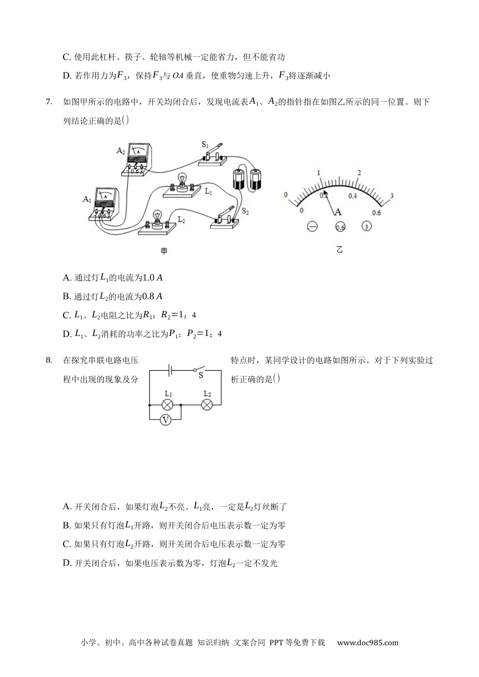 小学、初中、高中各种试卷真题知识归纳文案合同PPT等免费下载www.doc985.com2021年四川省达州市中考物理试卷一、单选题(本大题共10小题,共30.0分)1.2021年春晚,岳云鹏和孙越的相声《年三十的歌》:“日出嵩山坳,晨钟惊飞鸟”、“雾里看花,水中望月”……把我们带回那些难忘的春晚时光。下列说法正确的是()A.表演者发出的声音是由空气振动产生的B.“日出嵩山坳,晨钟惊飞鸟”中的钟声是通过空气传入鸟耳中的C.电视机前的听众能根据音调来分辨不同歌手的声音D.晚会现场的观众能够听到声音的频率范围为0Hz~20000Hz2.小聪学完初中物理,在复习阶段他把两年的物理内容按现象、概念、规律、实验、探究方法、知识应用等进行系统分类总结,以便加深对知识的理解,下列知识总结错误的是()A.托里拆利实验精确地测出了大气压强的值B.通过比较吸引大头针多少来判断电磁铁磁性强弱运用了转换法C.家用台灯正常工作时通过灯丝的电流约为2AD.煤、石油、天然气属于不可再生能源3.习总书记指出“绿水青山就是金山银山”,彰显出我国对生态环境保护的重视,水是生命之源,节约用水是我们每个达州人应尽的义务。关于水的物态变化,下列说法正确的是()A.初春,万物复苏、冰雪消融,这是熔化现象,需要吸热B.夏天,小明将糖水放入冰箱制成了冰棍,这是凝固现象,需要吸热C.秋天的早晨,花草上出现晶莹的露珠,这是汽化现象,需要放热D.冬天,房屋上出现白色的霜,这是凝华现象,需要吸热4.因为有了光,自然界才绚丽多彩;因为有了光,世界才生机勃勃;因为有了光,我们的生活才充满温暖……,下列四幅图所涉及的物理知识,说法正确的是()小学、初中、高中各种试卷真题知识归纳文案合同PPT等免费下载www.doc985.comA.图中小孔成像表明光一定沿直线传播B.图中的漫画表明,在反射时,光路是可逆的C.图中小猫没有叉到鱼是因为鱼在水中的像比实际位置深一些D.图是教室里的投影仪,若想使光屏上的像更大一些,应将凸透镜向上移动5.物理学中的许多概念来自于生产、生活。人们对力的认识也是从日常生活中开始的,细心观察,理性分析,我们就会慢慢探索出自然界的许多秘密。根据你所学的物理知识,对下列生活现象分析错误的是()A.运动员跑得越快越难停下来,因此速度越大惯性越大B.踢足球时脚会痛是因为力的作用是相互的C.放在桌面上的茶杯受到了向上的弹力,是由于桌面发生了形变D.草原犬鼠的多个洞口不都是平的,是为了利用流体压强与流速的关系改善洞内通风6.如图所示,AOB为轻质杠杆,B端用细线挂一重物G,在A端分别施加作用力F1、F2、F3时,杠杆都能在图示位置平衡。则下列说法正确的是()A.F1最小B.F2最大小学、初中、高中各种试卷真题知识归纳文案合同PPT等免费下载www.doc985.comC.使用此杠杆、筷子、轮轴等机械一定能省力,但不能省功D.若作用力为F3,保持F3与OA垂直,使重物匀速上升,F3将逐渐减小7.如图甲所示的电路中,开关均闭合后,发现电流表A1、A2的指针指在如图乙所示的同一位置。则下列结论正确的是()A.通过灯L1的电流为1.0AB.通过灯L2的电流为0.8AC.L1、L2电阻之比为R1:R2=1:4D.L1、L2消耗的功率之比为P1:P2=1:48.在探究串联电路电压特点时,某同学设计的电路如图所示。对于下列实验过程中出现的现象及分析正确的是()A.开关闭合后,如果灯泡L2不亮、L1亮,一定是L2灯丝断了B.如果只有灯泡L1开路,则开关闭合后电压表示数一定为零C.如果只有灯泡L2开路,则开关闭合后电压表示数一定为零D.开关闭合后,如果电压表示数为零,灯泡L2一定不发光小学、初中、高中各种试卷真题知识归纳文案合同PPT等免费下载www.doc985.com9.如图所示,底面积为100cm2的圆柱形容器置于水平桌面上,柱形物体被细线拉住静止在水中,该物体下表面受到的压力为22N,上表面受到的压力为10N;剪断细线物体静止后,液体对容器底部的压强比剪断细线前减少了300Pa。g取10N/kg,下列判断正确的是()A.剪断细线后,容器对水平桌面的压强变小B.该物体的密度为0.75×103kg/m3C.剪断细线后,物体静止时所受浮力大小为3ND.物体的质量为1kg10.如图所示,电源电压恒定,R是0~20Ω的滑动变阻器,a、b是其两个端点。当S1闭合,S2...