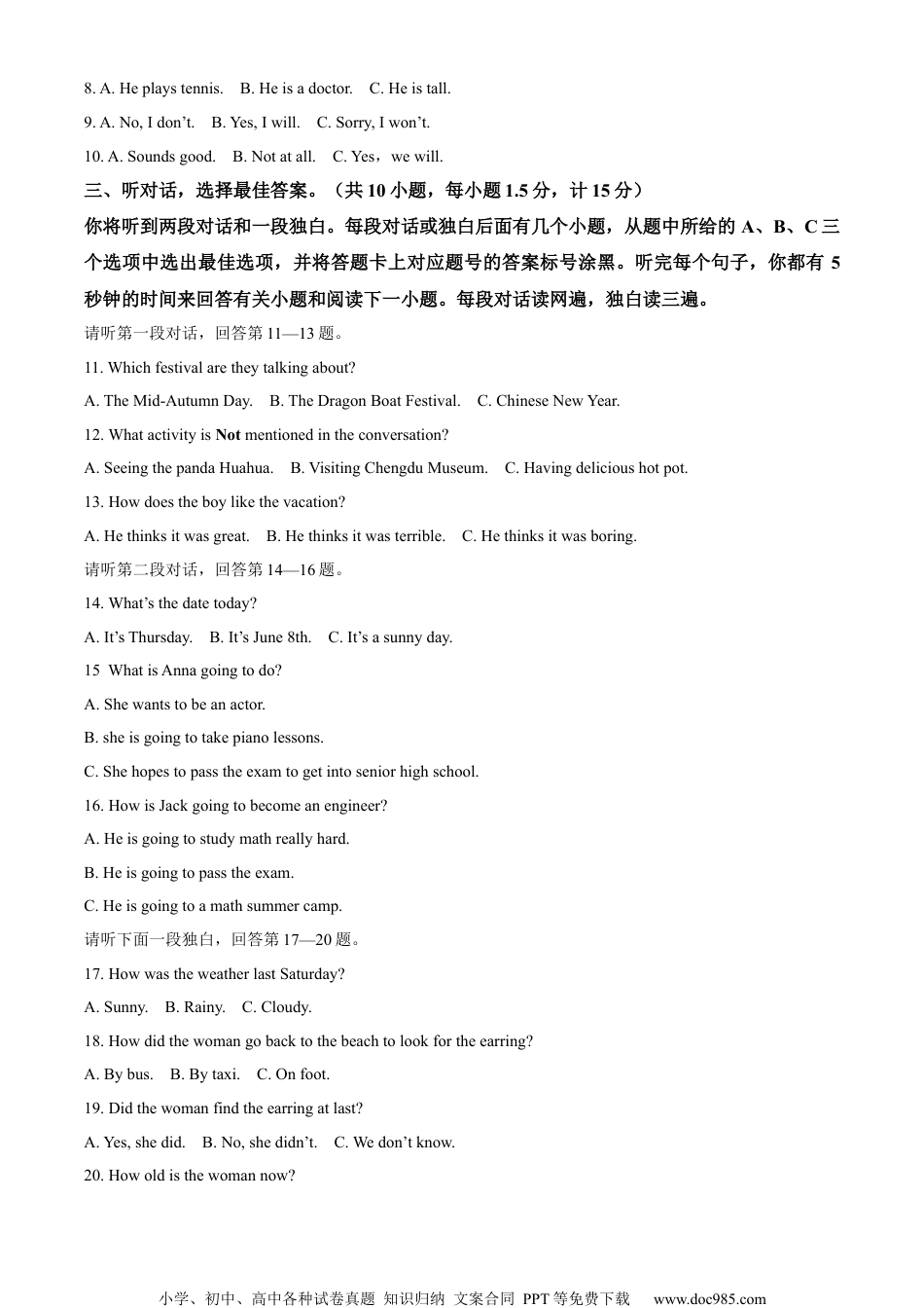 小学、初中、高中各种试卷真题知识归纳文案合同PPT等免费下载www.doc985.com达州市2023年高中阶段学校招生统一考试暨初中学业水平考试英语本考试为闭卷考试,考试时间120分钟,满分150分本试卷分为第Ⅰ卷和第Ⅱ卷两部分,共14页。温馨提示:1.答题前,考生需用0.5毫来黑色签字笔将自己的姓名、准考证号、应位号正确填写在答题卡对应位置。待监考老师粘贴条形码后,再认真核对条形码上的信息与自己的准考证上的信息是否一致。2.选择题必须使用2B铅笔在答题卡相应位置规范填涂。如需改动,用橡皮擦擦干净后,再选涂其他答案标号;非选择题用0.5毫米黑色签字笔作答,答案必须写在答题卡对应的框内,超出答题区答案无效;在草稿纸、试题卷上作答无效。3.保持答题卡整洁,不要折叠、弄破、弄皱,不得使用涂改液、修正带、刮纸刀。4.考试结束后,将试卷及答题卡一并交回。第Ⅰ卷(选择题共100分)第一部分听力(共三节满分30分)一、听句子,选图片。(共5小题,每小题1.5分,计7.5分)你将听到五个句子,请在下列五幅图中,选出与所听句子内容相符的图片.并将答题卡上对应题号的答案标号涂黑。听完每个句子,你都有5秒钟的时间来回答有关小题和阅读下一小题。每个句子读两遍。1.________2.________3.________4.________5.________二、听句子,选答语。(共5小题,每小题1.5分,计7.5分)你将听到五个句子,请根据所听内容,从题中所给的A、B、C三个选项中选出最佳答语,并将答题卡上对应题号的答案标号涂黑。听完每个句子,你都有5秒钟的时间来回答有关小题和阅读下一小题。每个句子读两遍。6.A.Allright.B.It’sgreat.C.You’rewelcome.7.A.InEngland.B.In1876.C.AlexanderGrahamBell.小学、初中、高中各种试卷真题知识归纳文案合同PPT等免费下载www.doc985.com8.A.Heplaystennis.B.Heisadoctor.C.Heistall.9.A.No,Idon’t.B.Yes,Iwill.C.Sorry,Iwon’t.10.A.Soundsgood.B.Notatall.C.Yes,wewill.三、听对话,选择最佳答案。(共10小题,每小题1.5分,计15分)你将听到两段对话和一段独白。每段对话或独白后面有几个小题,从题中所给的A、B、C三个选项中选出最佳选项,并将答题卡上对应题号的答案标号涂黑。听完每个句子,你都有5秒钟的时间来回答有关小题和阅读下一小题。每段对话读网遍,独白读三遍。请听第一段对话,回答第11—13题。11.Whichfestivalaretheytalkingabout?A.TheMid-AutumnDay.B.TheDragonBoatFestival.C.ChineseNewYear.12.WhatactivityisNotmentionedintheconversation?A.SeeingthepandaHuahua.B.VisitingChengduMuseum.C.Havingdelicioushotpot.13.Howdoestheboylikethevacation?A.Hethinksitwasgreat.B.Hethinksitwasterrible.C.Hethinksitwasboring.请听第二段对话,回答第14—16题。14.What’sthedatetoday?A.It’sThursday.B.It’sJune8th.C.It’sasunnyday.15.WhatisAnnagoingtodo?A.Shewantstobeanactor.B.sheisgoingtotakepianolessons.C.Shehopestopasstheexamtogetintoseniorhighschool.16.HowisJackgoingtobecomeanengineer?A.Heisgoingtostudymathreallyhard.B.Heisgoingtopasstheexam.C.Heisgoingtoamathsummercamp.请听下面一段独白,回答第17—20题。17.HowwastheweatherlastSaturday?A.Sunny.B.Rainy.C.Cloudy.18.Howdidthewomangobacktothebeachtolookfortheearring?A.Bybus.B.Bytaxi.C.Onfoot.19.Didthewomanfindtheearringatlast?A.Yes,shedid.B.No,shedidn’t.C.Wedon’tknow.20.Howoldisthewomannow?小学、初中、高中各种试卷真题知识归纳文案合同PPT等免费下载www.doc985.comA.26yearsold.B.27yearsold.C.28yearsold.第二部分基础知识运用(共三节满分30分)第一节单项选择(本题共10小题,每小题1分,计10分)从每小题所给的A、B、C三个选项中选出可以填入空白处的最佳答案。1.—Hi,Lily,haveyoueverheardofZibo,________cityin________centerofShandongprovince,isknownforitsbarbecuethesedays?—Sure.Iexpecttovisititandhaveatasteofthespecialfood.A.a,aB.a,theC.the,the【答案】B【解析】【详解】句意:——嗨,莉莉,你听说过淄博...
