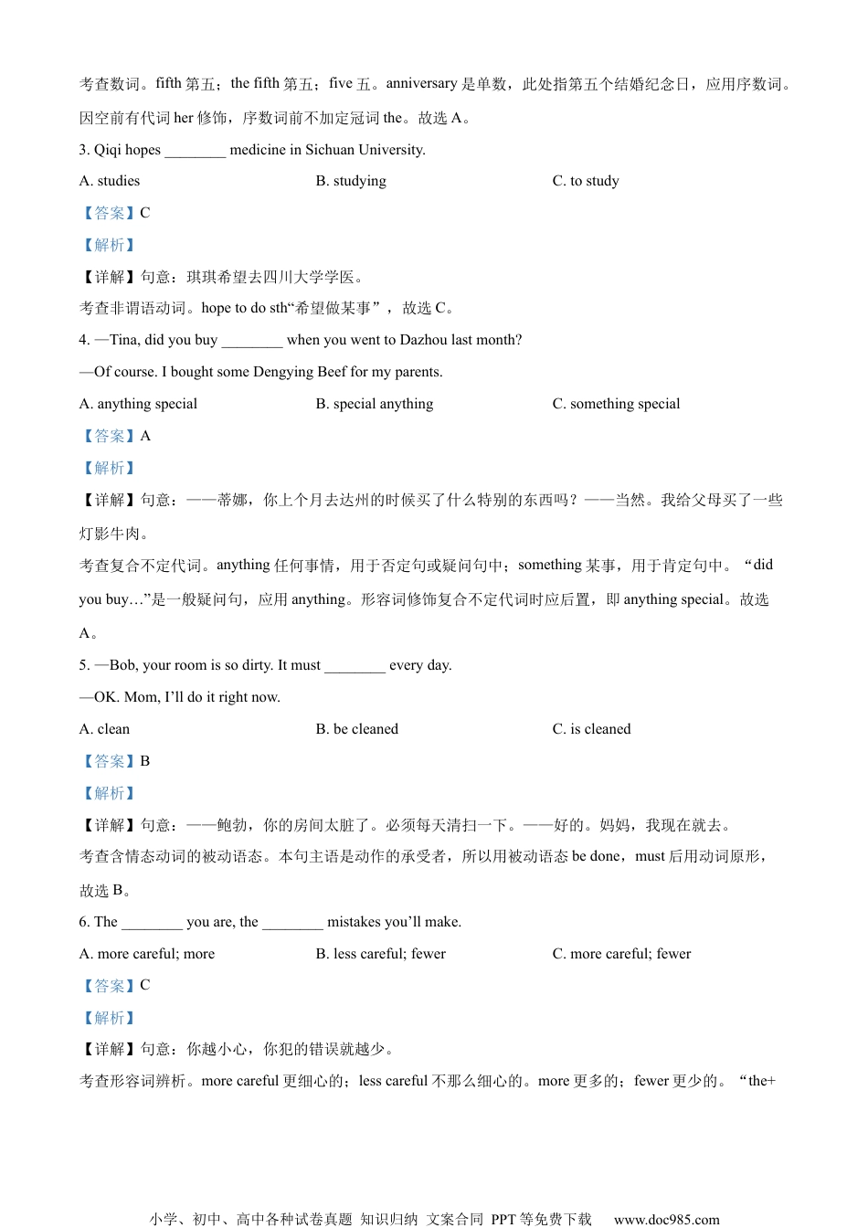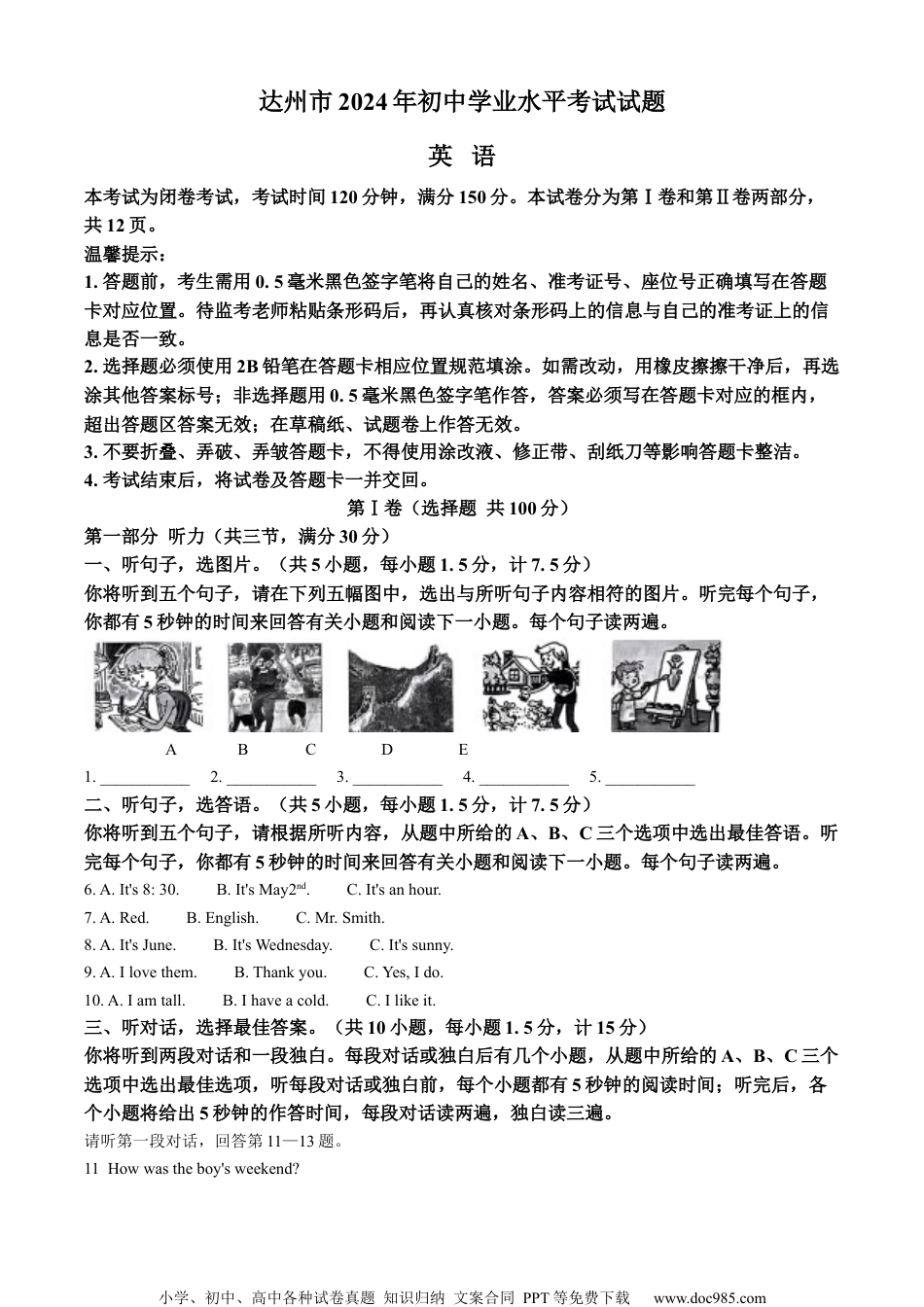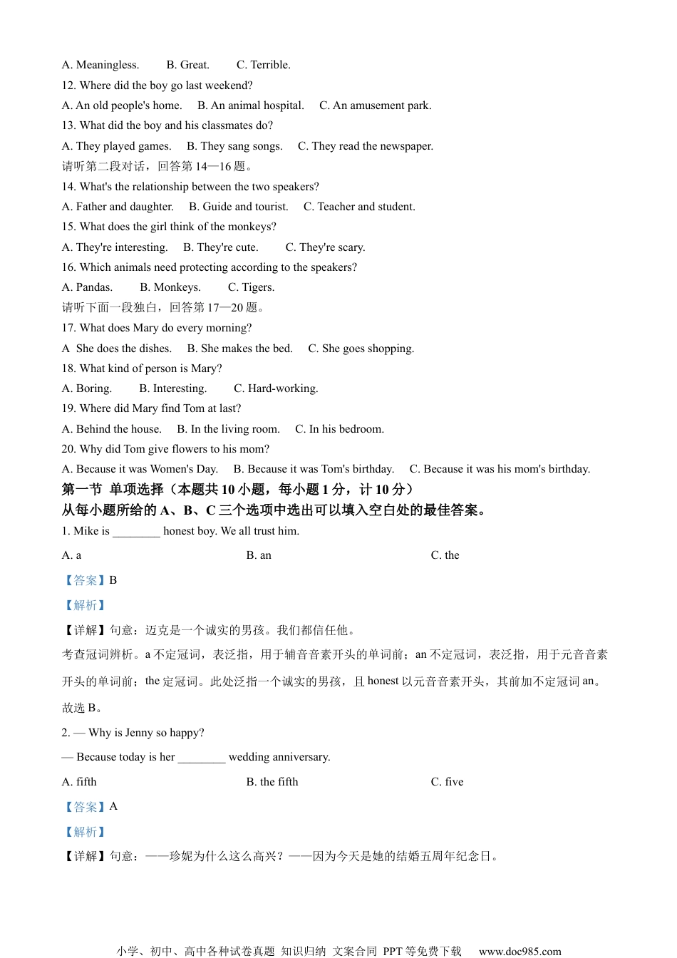 小学、初中、高中各种试卷真题知识归纳文案合同PPT等免费下载www.doc985.com达州市2024年初中学业水平考试试题英语本考试为闭卷考试,考试时间120分钟,满分150分。本试卷分为第Ⅰ卷和第Ⅱ卷两部分,共12页。温馨提示:1.答题前,考生需用0.5毫米黑色签字笔将自己的姓名、准考证号、座位号正确填写在答题卡对应位置。待监考老师粘贴条形码后,再认真核对条形码上的信息与自己的准考证上的信息是否一致。2.选择题必须使用2B铅笔在答题卡相应位置规范填涂。如需改动,用橡皮擦擦干净后,再选涂其他答案标号;非选择题用0.5毫米黑色签字笔作答,答案必须写在答题卡对应的框内,超出答题区答案无效;在草稿纸、试题卷上作答无效。3.不要折叠、弄破、弄皱答题卡,不得使用涂改液、修正带、刮纸刀等影响答题卡整洁。4.考试结束后,将试卷及答题卡一并交回。第Ⅰ卷(选择题共100分)第一部分听力(共三节,满分30分)一、听句子,选图片。(共5小题,每小题1.5分,计7.5分)你将听到五个句子,请在下列五幅图中,选出与所听句子内容相符的图片。听完每个句子,你都有5秒钟的时间来回答有关小题和阅读下一小题。每个句子读两遍。ABCDE1.___________2.___________3.___________4.___________5.___________二、听句子,选答语。(共5小题,每小题1.5分,计7.5分)你将听到五个句子,请根据所听内容,从题中所给的A、B、C三个选项中选出最佳答语。听完每个句子,你都有5秒钟的时间来回答有关小题和阅读下一小题。每个句子读两遍。6.A.It's8:30.B.It'sMay2nd.C.It'sanhour.7.A.Red.B.English.C.Mr.Smith.8.A.It'sJune.B.It'sWednesday.C.It'ssunny.9.A.Ilovethem.B.Thankyou.C.Yes,Ido.10.A.Iamtall.B.Ihaveacold.C.Ilikeit.三、听对话,选择最佳答案。(共10小题,每小题1.5分,计15分)你将听到两段对话和一段独白。每段对话或独白后有几个小题,从题中所给的A、B、C三个选项中选出最佳选项,听每段对话或独白前,每个小题都有5秒钟的阅读时间;听完后,各个小题将给出5秒钟的作答时间,每段对话读两遍,独白读三遍。请听第一段对话,回答第11—13题。11.Howwastheboy'sweekend?小学、初中、高中各种试卷真题知识归纳文案合同PPT等免费下载www.doc985.comA.Meaningless.B.Great.C.Terrible.12.Wheredidtheboygolastweekend?A.Anoldpeople'shome.B.Ananimalhospital.C.Anamusementpark.13.Whatdidtheboyandhisclassmatesdo?A.Theyplayedgames.B.Theysangsongs.C.Theyreadthenewspaper.请听第二段对话,回答第14—16题。14.What'stherelationshipbetweenthetwospeakers?A.Fatheranddaughter.B.Guideandtourist.C.Teacherandstudent.15.Whatdoesthegirlthinkofthemonkeys?A.They'reinteresting.B.They'recute.C.They'rescary.16.Whichanimalsneedprotectingaccordingtothespeakers?A.Pandas.B.Monkeys.C.Tigers.请听下面一段独白,回答第17—20题。17.WhatdoesMarydoeverymorning?A.Shedoesthedishes.B.Shemakesthebed.C.Shegoesshopping.18.WhatkindofpersonisMary?A.Boring.B.Interesting.C.Hard-working.19.WheredidMaryfindTomatlast?A.Behindthehouse.B.Inthelivingroom.C.Inhisbedroom.20.WhydidTomgiveflowerstohismom?A.BecauseitwasWomen'sDay.B.BecauseitwasTom'sbirthday.C.Becauseitwashismom'sbirthday.第一节单项选择(本题共10小题,每小题1分,计10分)从每小题所给的A、B、C三个选项中选出可以填入空白处的最佳答案。1.Mikeis________honestboy.Wealltrusthim.A.aB.anC.the【答案】B【解析】【详解】句意:迈克是一个诚实的男孩。我们都信任他。考查冠词辨析。a不定冠词,表泛指,用于辅音音素开头的单词前;an不定冠词,表泛指,用于元音音素开头的单词前;the定冠词。此处泛指一个诚实的男孩,且honest以元音音素开头,其前加不定冠词an。故选B。2.—WhyisJennysohappy?—Becausetodayisher________weddinganniversary.A.fifthB.thefifthC.five【答案】A【解析】【详解】句意:——珍妮为什么这么高兴?——因为今天是她的结婚五周年纪念日。小学、初中、高中各种试卷真题知...