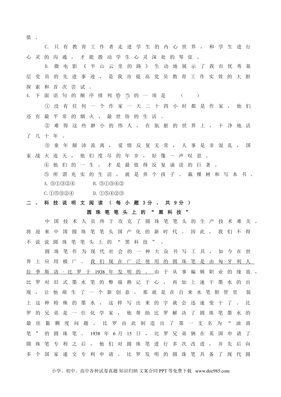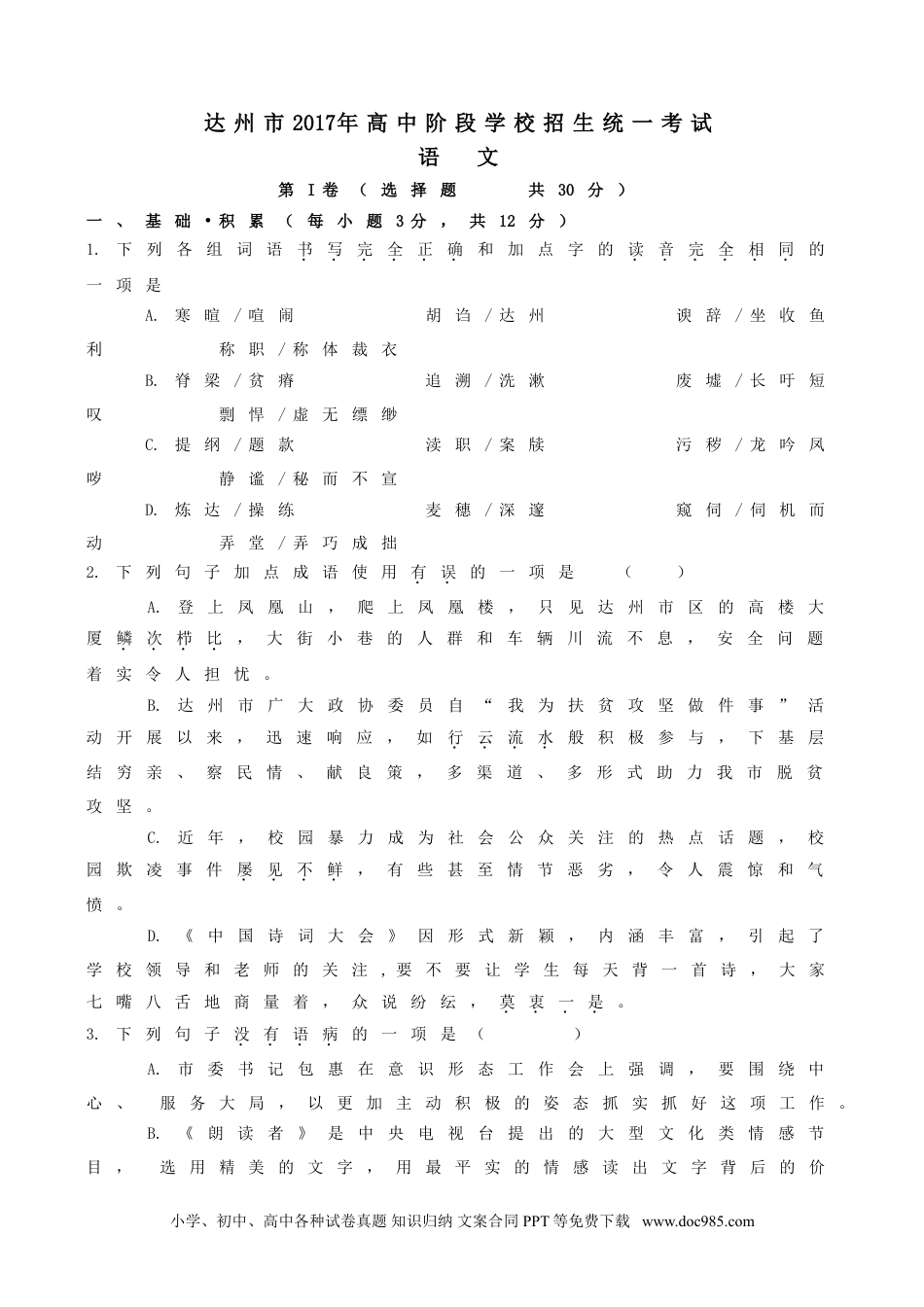 达州市2017年高中阶段学校招生统一考试语文第I卷(选择题共30分)一、基础•积累(每小题3分,共12分)1.下列各组词语书写完全正确和加点字的读音完全相同的一项是A.寒暄/喧闹胡诌/达州谀辞/坐收鱼利称职/称体裁衣B.脊梁/贫瘠追溯/洗漱废墟/长吁短叹剽悍/虚无缥缈C.提纲/题款渎职/案牍污秽/龙吟凤哕静谧/秘而不宣D.炼达/操练麦穗/深邃窥伺/伺机而动弄堂/弄巧成拙2.下列句子加点成语使用有误的一项是()A.登上凤凰山,爬上凤凰楼,只见达州市区的高楼大厦鳞次栉比,大街小巷的人群和车辆川流不息,安全问题着实令人担忧。B.达州市广大政协委员自“我为扶贫攻坚做件事”活动开展以来,迅速响应,如行云流水般积极参与,下基层结穷亲、察民情、献良策,多渠道、多形式助力我市脱贫攻坚。C.近年,校园暴力成为社会公众关注的热点话题,校园欺凌事件屡见不鲜,有些甚至情节恶劣,令人震惊和气愤。D.《中国诗词大会》因形式新颖,内涵丰富,引起了学校领导和老师的关注,要不要让学生每天背一首诗,大家七嘴八舌地商量着,众说纷纭,莫衷一是。3.下列句子没有语病的一项是()A.市委书记包惠在意识形态工作会上强调,要围绕中心、服务大局,以更加主动积极的姿态抓实抓好这项工作。B.《朗读者》是中央电视台提出的大型文化类情感节目,选用精美的文字,用最平实的情感读出文字背后的价小学、初中、高中各种试卷真题知识归纳文案合同PPT等免费下载www.doc985.com值。C.只有教育工作者走进学生的内心世界,和学生进行心灵的沟通,才能拨动学生心灵深处的琴弦。D.微电影《半山云里的路》生动地展示了我市优秀基层党员的先进事迹,是我市提高党员教育工作实效的大胆探索和首次尝试。4.下面语句的顺序排列恰当的一项是()①没有任何一个作家一天二十四小时都是作家,他们还有最平常的烟火、最世俗的生活。②难得这些渺小的伟人,在肮脏的世界上,干净地活了几十年。③童年颠沛流离,爱情反复无常,人事是非混乱,国家战火连天,他们度尽的年岁,好像一声叹息。④他们的一生,才是最值得反复诵读的巨著。⑤所谓充实的生活,就是养个孩子、栽棵树和写本书。A.⑤①③②④B.⑤①③④②C.①⑤③②④D.①⑤④②③二、科技说明文阅读(每小题3分,共9分)圆珠笔笔头上的“黑科技”中国技术人员终于攻克了圆珠笔笔头的生产技术难关,将迎来中国圆珠笔笔头国产化的新时代。因此,我们不得不说说圆珠笔笔头上的“黑科技”。圆珠笔作为现代社会的一种大众书写工具,如今在世界上应用极广。我们现在广泛使用的圆珠笔是由匈牙利人拉季斯洛·比罗于1938年发明的。由于从事编辑职业的缘故,比罗对旧式墨水笔的弊端熟记于心,再加上速干墨水的出现,让他萌生了一个新创意,那就是在自来水笔胆管里装上这种特殊的墨水,这样写出来的字就会迅速变干了。比罗的兄弟是一位化学家,他帮助比罗解决了圆珠笔墨水的最佳黏稠度问题。比罗由此制造出了第一支名为“油溶笔”的圆珠笔。1938年6月15日,比罗兄弟俩在英国申请了圆珠笔专利之后,他们对圆珠笔进行多次改进,并先后向多个国家递交专利申请。比罗发明的圆珠笔具备了现代圆小学、初中、高中各种试卷真题知识归纳文案合同PPT等免费下载www.doc985.com珠笔的雏形:在一根灌满速干墨水的管子顶端嵌装上一粒滚珠,借助滚珠的转动把墨水书写在纸张上。比罗发明的圆珠笔改进了自来水笔的吸管,并把笔头改成小圆珠3小圆珠——“书写点”直径为0.5-1.0毫米。由于小圆珠能够任意转动,因此才得以把墨水均匀平滑地书写在纸面上。为了适应圆珠笔“书写点”的变革,比罗把笔芯设计成螺旋状,从而通过控制气压来控制墨水的流量。那么,圆珠笔的“书写点”是如何工作的呢?原来,人们在用圆珠笔书写时,在大气压力与油墨重力的双重作用下,笔芯内的油墨便会流向笔头的球座体中,并黏附在“书写点”上。书写时由于球珠的滚动而使油墨附着在纸面上,从而形成清晰、鲜艳、整洁的字迹。由于圆珠笔的“书写点”在书写时需要承受很大的压力,所以笔头的球珠需要用坚硬耐磨的材料制成。最初推向市场的圆珠笔是十分昂贵的,就是因为作为“书写点”的球珠成本很高当时的球珠是用铬和钢的...