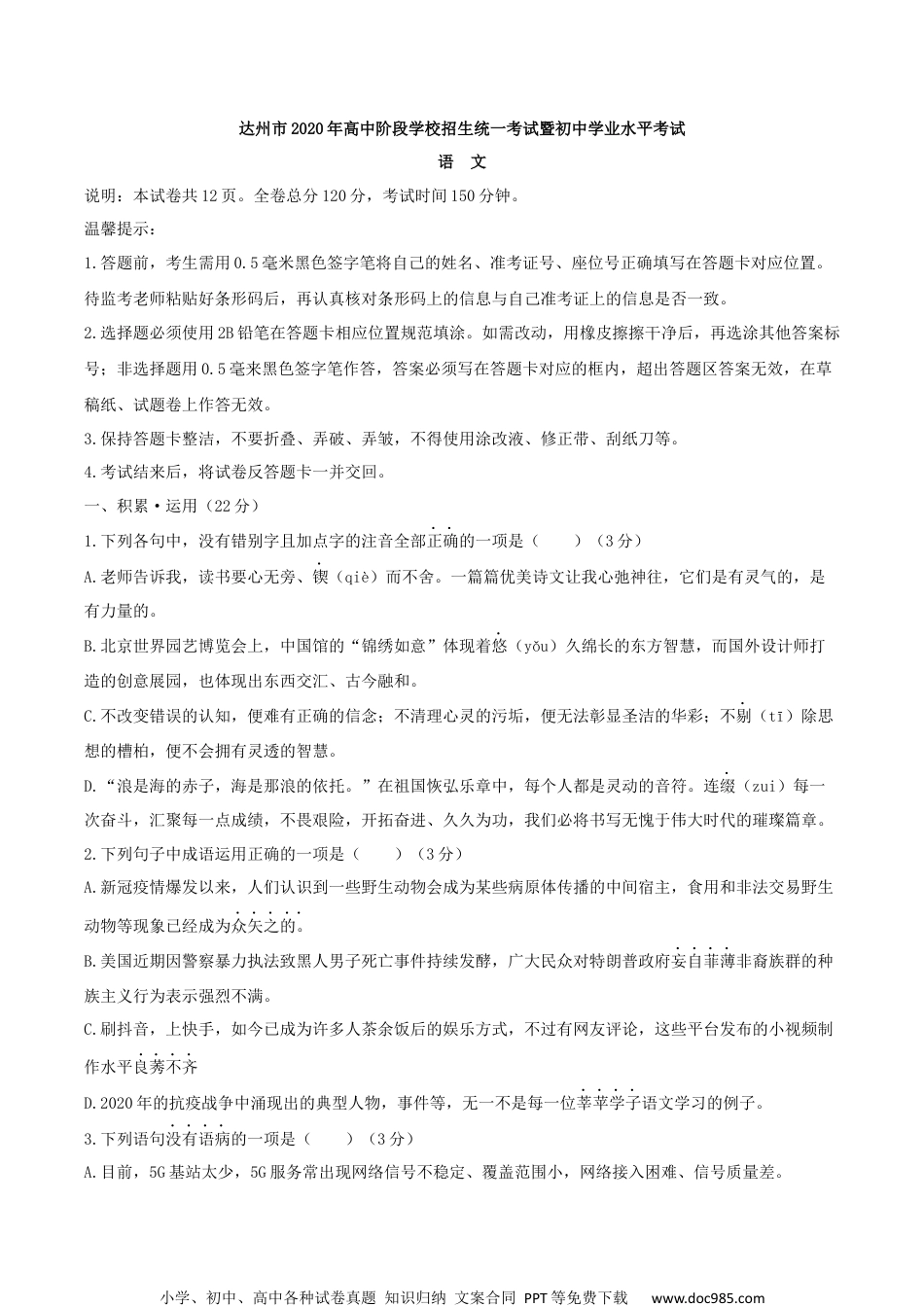 小学、初中、高中各种试卷真题知识归纳文案合同PPT等免费下载www.doc985.com达州市2020年高中阶段学校招生统一考试暨初中学业水平考试语文说明:本试卷共12页。全卷总分120分,考试时间150分钟。温馨提示:1.答题前,考生需用0.5毫米黑色签字笔将自己的姓名、准考证号、座位号正确填写在答题卡对应位置。待监考老师粘贴好条形码后,再认真核对条形码上的信息与自己准考证上的信息是否一致。2.选择题必须使用2B铅笔在答题卡相应位置规范填涂。如需改动,用橡皮擦擦干净后,再选涂其他答案标号;非选择题用0.5毫来黑色签字笔作答,答案必须写在答题卡对应的框内,超出答题区答案无效,在草稿纸、试题卷上作答无效。3.保持答题卡整洁,不要折叠、弄破、弄皱,不得使用涂改液、修正带、刮纸刀等。4.考试结来后,将试卷反答题卡一并交回。一、积累·运用(22分)1.下列各句中,没有错别字且加点字的注音全部正确的一项是()(3分)A.老师告诉我,读书要心无旁、锲(qiè)而不舍。一篇篇优美诗文让我心弛神往,它们是有灵气的,是有力量的。B.北京世界园艺博览会上,中国馆的“锦绣如意”体现着悠(yǒu)久绵长的东方智慧,而国外设计师打造的创意展园,也体现出东西交汇、古今融和。C.不改变错误的认知,便难有正确的信念;不清理心灵的污垢,便无法彰显圣洁的华彩;不剔(tī)除思想的槽柏,便不会拥有灵透的智慧。D.“浪是海的赤子,海是那浪的依托。”在祖国恢弘乐章中,每个人都是灵动的音符。连缀(zui)每一次奋斗,汇聚每一点成绩,不畏艰险,开拓奋进、久久为功,我们必将书写无愧于伟大时代的璀璨篇章。2.下列句子中成语运用正确的一项是()(3分)A.新冠疫情爆发以来,人们认识到一些野生动物会成为某些病原体传播的中间宿主,食用和非法交易野生动物等现象已经成为众矢之的。B.美国近期因警察暴力执法致黑人男子死亡事件持续发酵,广大民众对特朗普政府妄自菲薄非裔族群的种族主义行为表示强烈不满。C.刷抖音,上快手,如今已成为许多人茶余饭后的娱乐方式,不过有网友评论,这些平台发布的小视频制作水平良莠不齐D.2020年的抗疫战争中涌现出的典型人物,事件等,无一不是每一位莘苹学子语文学习的例子。3.下列语句没有语病的一项是()(3分)A.目前,5G基站太少,5G服务常出现网络信号不稳定、覆盖范围小,网络接入困难、信号质量差。小学、初中、高中各种试卷真题知识归纳文案合同PPT等免费下载www.doc985.comB.坚定文化自信,要从青少年抓起,将中华优秀传统文化写进教材,让优秀传统文化走进课堂,从而激发学生的爱国热情,让中华优秀传统文化得以传承,延续。C.为了有效防止流感病毒的泛滥和滋生,我们应做到勤洗手,常通风,注意个人卫生。D.实施精准扶贫工程,对实施到2020年让农村贫困人口彻底摆脱贫困的目标有着重要的意义。4.下列说法或判断错误的一项是()(3分)A.雨果是法国浪漫主义作家,他的许多作品深刻地反映了社会现实。他的代表作品有小说《巴黎圣母院》《悲惨世界》《九三年》等。B.水南山北为“阳”,水北山南为“阴”,如“达于仅阴”中的“阴”就指汉水的北部。C.“我们共产党人要不忘初心,牢记使命,”习近平总书记曾勉励我们,“幸福都是奋斗出来的。”(标点符号使用无误)D.“若使后之学者都墨守前人的旧说,那就没有新问题,没有新发明,一切学术停滞,人类的文化也就不会进步了。”(假设复句)5.这些被疫情改变的成语,显得别有新意,还能给人以触动,真是合情合理!请你仔细观察图(1)和图(2)的样式,然后新编两个成语吧。(2分)图(1)图(2)图(3)图(4)我的创新:图(3)成语:________________图(4)成语:________________6.下列各句表达不得体的是哪一句?为什么?(3分)(1)初次见面,我特地从达州给大家带来了一份薄礼——灯影牛肉,希望大家以后多多关照。(2)魏芳收到朋友阿香的微信消息:我明天到达州,拜托你到百节机场来接我好吗?(3)李老师,这是我要发表的文章初稿,请您斧正,如有不当之处,恳请批评指正。(4)近日听闻你家小女获得全国中学生作文竞赛一等奖,真是可喜可贺啊!不得体的是第(______)...