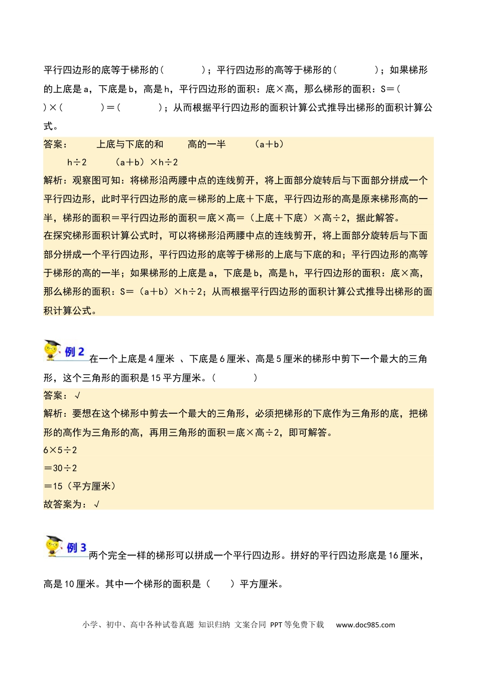 小学、初中、高中各种试卷真题知识归纳文案合同PPT等免费下载www.doc985.com温馨提示:图片放大更清晰在探究梯形面积计算公式时,可以将梯形沿两腰中点的连线剪开,将上面部分旋转后与下面部分拼成一个平行四边形,如下图所示。《梯形》精准讲练通用版小升初数学小学、初中、高中各种试卷真题知识归纳文案合同PPT等免费下载www.doc985.com平行四边形的底等于梯形的();平行四边形的高等于梯形的();如果梯形的上底是a,下底是b,高是h,平行四边形的面积:底×高,那么梯形的面积:S=()×()=();从而根据平行四边形的面积计算公式推导出梯形的面积计算公式。答案:上底与下底的和高的一半(a+b)h÷2(a+b)×h÷2解析:观察图可知:将梯形沿两腰中点的连线剪开,将上面部分旋转后与下面部分拼成一个平行四边形,此时平行四边形的底=梯形的上底+下底,平行四边形的高是原来梯形高的一半,梯形的面积=平行四边形的面积=底×高=(上底+下底)×高÷2,据此解答。在探究梯形面积计算公式时,可以将梯形沿两腰中点的连线剪开,将上面部分旋转后与下面部分拼成一个平行四边形,平行四边形的底等于梯形的上底与下底的和;平行四边形的高等于梯形的高的一半;如果梯形的上底是a,下底是b,高是h,平行四边形的面积:底×高,那么梯形的面积:S=(a+b)×h÷2;从而根据平行四边形的面积计算公式推导出梯形的面积计算公式。在一个上底是4厘米、下底是6厘米、高是5厘米的梯形中剪下一个最大的三角形,这个三角形的面积是15平方厘米。()答案:√解析:要想在这个梯形中剪去一个最大的三角形,必须把梯形的下底作为三角形的底,把梯形的高作为三角形的高,再用三角形的面积=底×高÷2,即可解答。6×5÷2=30÷2=15(平方厘米)故答案为:√两个完全一样的梯形可以拼成一个平行四边形。拼好的平行四边形底是16厘米,高是10厘米。其中一个梯形的面积是()平方厘米。小学、初中、高中各种试卷真题知识归纳文案合同PPT等免费下载www.doc985.comA.320B.160C.80D.40答案:C解析:拼成的平行四边形面积是梯形面积的2倍,用底×高,求出平行四边形面积,除2即可。16×10÷2=80(平方厘米)故答案为:C下图是直角梯形ABCD,请根据图中信息解答下面各题。(1)这个直角梯形的面积是多少平方厘米?(2)如果以AB边为轴旋转一周,得到一个立体图形,这个立体图形的体积是多少立方厘米?答案:(1)梯形的面积为:(4+7)×3÷2=11×3÷2=16.5(平方厘米)答:梯形的面积为16.5平方厘米。(2)以AB边为轴旋转一周,得到一个圆锥和一个圆柱,体积为:πr2h+πr2h,=×3.14×32×(7﹣4)+3.14×32×4=28.26+113.04=141.3(立方厘米)答:这个立体图形的体积是141.3立方厘米。小学、初中、高中各种试卷真题知识归纳文案合同PPT等免费下载www.doc985.com解析:(1)根据梯形的面积=(上底+下底)×高÷2,代入数据计算即可。(2)如果以AB边为轴旋转一周,得到的立体图形是由1个圆柱和1个圆锥组成的,上面得到一个圆锥,(7﹣4)厘米是圆锥的高,BC的长度是圆锥的半径,下面是一个圆柱,高是4厘米,半径是3厘米,根据体积=h+πr2h代入数据计算即可。一、题填空1.如图,用篱笆围成一个梯形菜园,梯形一边靠墙,篱笆总长52m,菜园的面积是()m2。答案:320:解析篱笆的长减去梯形的高是梯形的上底下底的和,再根据梯形的面积公式答可就与解即。(52-20)×20÷2=32×20÷2=640÷2=320(m2)2.图中的ABCD是长方形,长BC=8,厘米宽AB=5,厘米ABDE是梯形,△BDE的面积是________平方。厘米小学、初中、高中各种试卷真题知识归纳文案合同PPT等免费下载www.doc985.com答案:20:解析通过观察图形可知,形三角ABE形与三角ADE是同底等高的形,面积等,三角所以相此,阴影面积为长方形因ABCD面积的一半,根据长方形的面积公式:S=ab,据公把数代入式答可。解即长方形ABCD的面积为:8×5=40(平方)厘米形三角ABE形与三角ADE是同底等高的形,面积等,形三角所以相即三角ABD的面积等于阴影面积,此,阴影面积为长方形因ABCD面积的一半。阴影部分的面积是:所以40÷2=20(平方...