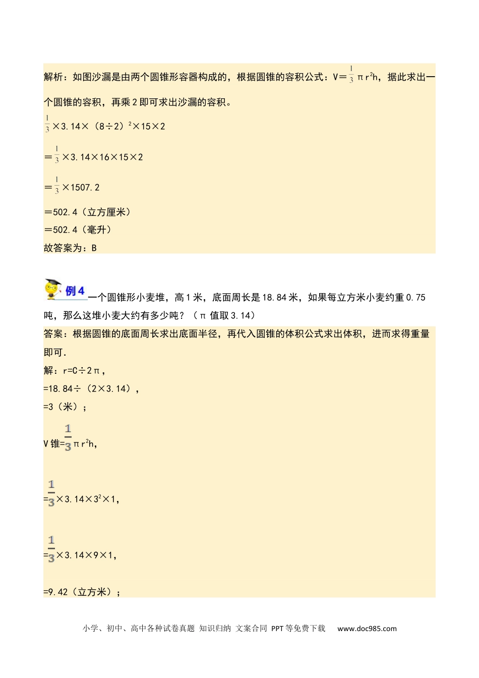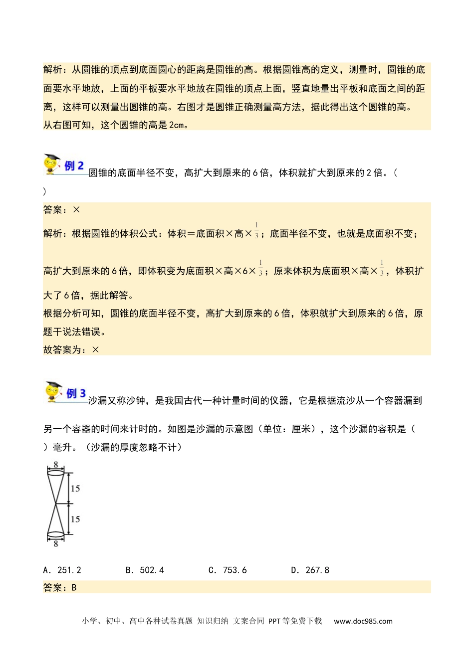 小学、初中、高中各种试卷真题知识归纳文案合同PPT等免费下载www.doc985.com温馨提示:图片放大更清晰观察如图,这个圆锥的高是()cm。答案:2《圆锥》精准讲练通用版小升初数学小学、初中、高中各种试卷真题知识归纳文案合同PPT等免费下载www.doc985.com解析:从圆锥的顶点到底面圆心的距离是圆锥的高。根据圆锥高的定义,测量时,圆锥的底面要水平地放,上面的平板要水平地放在圆锥的顶点上面,竖直地量出平板和底面之间的距离,这样可以测量出圆锥的高。右图才是圆锥正确测量高方法,据此得出这个圆锥的高。从右图可知,这个圆锥的高是2cm。圆锥的底面半径不变,高扩大到原来的6倍,体积就扩大到原来的2倍。()答案:×解析:根据圆锥的体积公式:体积=底面积×高×;底面半径不变,也就是底面积不变;高扩大到原来的6倍,即体积变为底面积×高×6×;原来体积为底面积×高×,体积扩大了6倍,据此解答。根据分析可知,圆锥的底面半径不变,高扩大到原来的6倍,体积就扩大到原来的6倍,原题干说法错误。故答案为:×沙漏又称沙钟,是我国古代一种计量时间的仪器,它是根据流沙从一个容器漏到另一个容器的时间来计时的。如图是沙漏的示意图(单位:厘米),这个沙漏的容积是()毫升。(沙漏的厚度忽略不计)A.251.2B.502.4C.753.6D.267.8答案:B小学、初中、高中各种试卷真题知识归纳文案合同PPT等免费下载www.doc985.com解析:如图沙漏是由两个圆锥形容器构成的,根据圆锥的容积公式:V=πr2h,据此求出一个圆锥的容积,再乘2即可求出沙漏的容积。×3.14×(8÷2)2×15×2=×3.14×16×15×2=×1507.2=502.4(立方厘米)=502.4(毫升)故答案为:B一个圆锥形小麦堆,高1米,底面周长是18.84米,如果每立方米小麦约重0.75吨,那么这堆小麦大约有多少吨?(π值取3.14)答案:根据圆锥的底面周长求出底面半径,再代入圆锥的体积公式求出体积,进而求得重量即可.解:r=C÷2π,=18.84÷(2×3.14),=3(米);V锥=πr2h,=×3.14×32×1,=×3.14×9×1,=9.42(立方米);小学、初中、高中各种试卷真题知识归纳文案合同PPT等免费下载www.doc985.com9.42×0.75=7.065(吨);答:这堆小麦大约有7.065吨.一、题填空1.如,用图20L把这个容器装,如果把圆锥分装,则水刚好满只部满需要________L;如水果水深,则容器里有________L。(容器的)水厚度忽略不计答案:510解:析形可知,这个容器的面是一个圆柱体,下面是一个圆锥体,圆柱体和圆锥观察图上该体等底等高,所以圆锥的体积是圆锥的体积的,容器的容积=圆锥的容积+圆柱的容积该,根据圆柱的体积公式:V=Sh,圆锥的体积公式:V=Sh,据容器的底面积,进此求出而求圆锥的容积;如果出水深,则的体积=圆锥的体积+高是(水2-1.5)dm圆柱的体积,据解答可。此即解:设容器的底面积是Sdm2。20L=20dm31.5S+×1.5S=201.5S+0.5S=202S=20S=10小学、初中、高中各种试卷真题知识归纳文案合同PPT等免费下载www.doc985.com×10×1.5=×15=5(dm3)=5(L)10×(2-1.5)+5=10×0.5+5=5+5=10(L)则如果把圆锥分装,则只部满需要5L;如果水水深,则容器里有10L。水2.悠悠过生日,爸爸送给他一个圆锥形的陀螺,陀螺的底面直径是4cm,高是2.7cm,这个陀螺的体积是()cm3;如果用一个长方体盒子包装它,这个盒子的容积至少是()cm3。答案:11.30443.2解:析根据圆锥体积=底面积×高÷3,陀螺体积;长方体盒子的长和至少等陀螺底求出宽于面直径,长方体的高至少等陀螺的高,根据长方体体积=长于×宽×高,盒子容积可求出即。3.14×(4÷2)2×2.7÷3=3.14×4×0.9=11.304(cm3)4×4×2.7=43.2(cm3)这个陀螺的体积是11.304cm3;这个盒子的容积至少是43.2cm3。3.一圆柱形,底面积是块橡皮泥24方米,高是平厘5米,如果成圆柱等底的圆锥形厘捏与,高是()米;如果成圆柱等高的圆锥形,底面积是厘捏与()方米。平厘答案:1572解:析根据圆柱的体积公式:V=Sh,据的体积,的体积,根据圆锥此求出橡皮泥橡皮泥不变的体积公式:V=Sh,据解答可;此即小学、初中、高中各种试卷真题知识归纳文案合同PPT等免费下...
