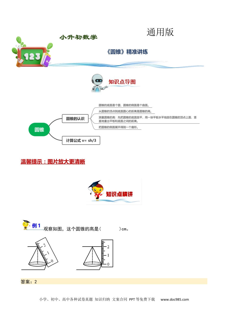 小学、初中、高中各种试卷真题知识归纳文案合同PPT等免费下载www.doc985.com温馨提示:图片放大更清晰观察如图,这个圆锥的高是()cm。答案:2《圆锥》精准讲练通用版小升初数学小学、初中、高中各种试卷真题知识归纳文案合同PPT等免费下载www.doc985.com解析:从圆锥的顶点到底面圆心的距离是圆锥的高。根据圆锥高的定义,测量时,圆锥的底面要水平地放,上面的平板要水平地放在圆锥的顶点上面,竖直地量出平板和底面之间的距离,这样可以测量出圆锥的高。右图才是圆锥正确测量高方法,据此得出这个圆锥的高。从右图可知,这个圆锥的高是2cm。圆锥的底面半径不变,高扩大到原来的6倍,体积就扩大到原来的2倍。()答案:×解析:根据圆锥的体积公式:体积=底面积×高×;底面半径不变,也就是底面积不变;高扩大到原来的6倍,即体积变为底面积×高×6×;原来体积为底面积×高×,体积扩大了6倍,据此解答。根据分析可知,圆锥的底面半径不变,高扩大到原来的6倍,体积就扩大到原来的6倍,原题干说法错误。故答案为:×沙漏又称沙钟,是我国古代一种计量时间的仪器,它是根据流沙从一个容器漏到另一个容器的时间来计时的。如图是沙漏的示意图(单位:厘米),这个沙漏的容积是()毫升。(沙漏的厚度忽略不计)A.251.2B.502.4C.753.6D.267.8答案:B小学、初中、高中各种试卷真题知识归纳文案合同PPT等免费下载www.doc985.com解析:如图沙漏是由两个圆锥形容器构成的,根据圆锥的容积公式:V=πr2h,据此求出一个圆锥的容积,再乘2即可求出沙漏的容积。×3.14×(8÷2)2×15×2=×3.14×16×15×2=×1507.2=502.4(立方厘米)=502.4(毫升)故答案为:B一个圆锥形小麦堆,高1米,底面周长是18.84米,如果每立方米小麦约重0.75吨,那么这堆小麦大约有多少吨?(π值取3.14)答案:根据圆锥的底面周长求出底面半径,再代入圆锥的体积公式求出体积,进而求得重量即可.解:r=C÷2π,=18.84÷(2×3.14),=3(米);V锥=πr2h,=×3.14×32×1,=×3.14×9×1,=9.42(立方米);小学、初中、高中各种试卷真题知识归纳文案合同PPT等免费下载www.doc985.com9.42×0.75=7.065(吨);答:这堆小麦大约有7.065吨.一、题填空1.如,用图20L把这个容装,如果把圆锥分装,水刚好器满只部满则需要________L;如水果水深,容则器里有________L。容的水(器厚度忽略不计)2.悠悠过生日,爸爸送给他一个圆锥形的陀螺,陀螺的底面直径是4cm,高是2.7cm,这个陀螺的体积是()cm3;如果用一个长方体盒子包装它,这个盒子的容积至少是()cm3。3.一圆柱形,底面积是块橡皮泥24方米,高是平厘5米,如果成圆柱等底的圆锥形厘捏与,高是()米;如果成圆柱等高的圆锥形,底面积是厘捏与()方米。平厘4.把一个圆柱钢坯削成一个最大的圆锥,削要去,未削前圆柱钢坯的体积是________。5.一个圆柱的体积是31.4立方米,底面积和高成厘();如果这个圆柱一个圆比例与锥的高都是10米,它们的体积也相等,圆锥的底面积是厘要使则()方米。平厘、题二判断1.一个圆锥的底面积是12.56cm2,体积是25.12cm3,那么高是9cm。()2.三角形绕任何一边所在直线旋转都可以得到一个圆锥。()3.如果圆锥底面的直径是圆柱底面直径的3倍,它们的高相等,那么它们的体积也相等。(小学、初中、高中各种试卷真题知识归纳文案合同PPT等免费下载www.doc985.com)4.一个圆锥的体积和一个圆柱的体积相等,那么圆锥的高是圆柱高的3倍。()5.把一个棱长3分米的正方体削成一个最大的圆锥,这个圆锥的体积是70.65立方分米。()三、题选择1.下是进容的相同,下的是容中的高左图水滴玻璃器示意图(滴水速度)右图表示器水度随的中、都相同。下中正的是滴水时间变化情况(图刻度单位)列选项对应关系确(。)A.(1)—(a)B.(2)—(b)C.(3)—(c)D.(4)—(d)2.下正的列说法确占(。)①小军进行打靶训练,他命中100发,脱靶5发,命中率是95%如果②,那么x和y成正。比例关系③“每满100元减20和送一的相同,都是打。元”“买四”优惠幅度八折如果④x=y+1(x、y,那么均为非零自然数)x、y的最小倍是公数xy。一个圆锥的...