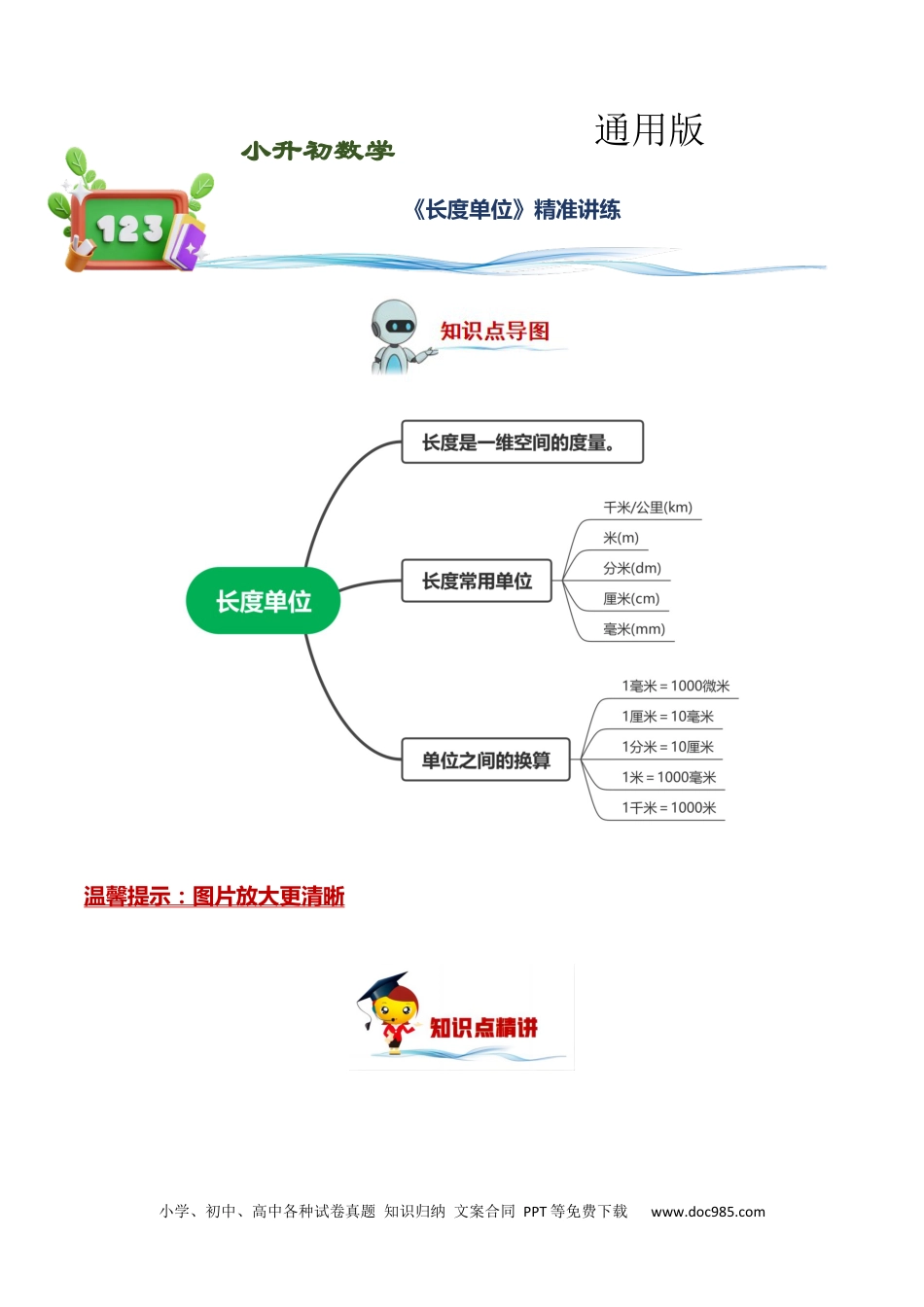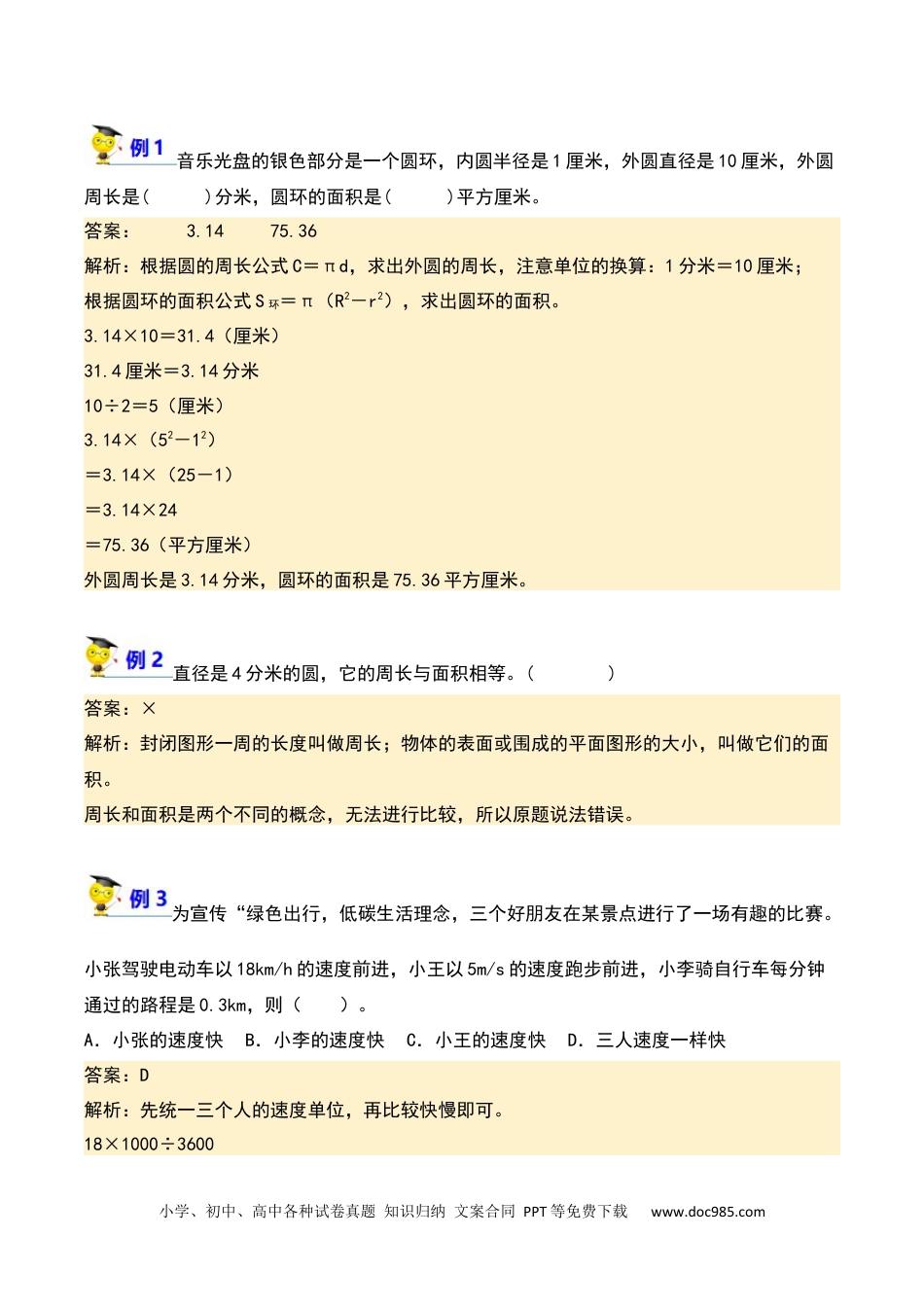 小学、初中、高中各种试卷真题知识归纳文案合同PPT等免费下载www.doc985.com温馨提示:图片放大更清晰《长度单位》精准讲练通用版小升初数学小学、初中、高中各种试卷真题知识归纳文案合同PPT等免费下载www.doc985.com音乐光盘的银色部分是一个圆环,内圆半径是1厘米,外圆直径是10厘米,外圆周长是()分米,圆环的面积是()平方厘米。答案:3.1475.36解析:根据圆的周长公式C=πd,求出外圆的周长,注意单位的换算:1分米=10厘米;根据圆环的面积公式S环=π(R2-r2),求出圆环的面积。3.14×10=31.4(厘米)31.4厘米=3.14分米10÷2=5(厘米)3.14×(52-12)=3.14×(25-1)=3.14×24=75.36(平方厘米)外圆周长是3.14分米,圆环的面积是75.36平方厘米。直径是4分米的圆,它的周长与面积相等。()答案:×解析:封闭图形一周的长度叫做周长;物体的表面或围成的平面图形的大小,叫做它们的面积。周长和面积是两个不同的概念,无法进行比较,所以原题说法错误。为宣传“绿色出行,低碳生活理念,三个好朋友在某景点进行了一场有趣的比赛。小张驾驶电动车以18km/h的速度前进,小王以5m/s的速度跑步前进,小李骑自行车每分钟通过的路程是0.3km,则()。A.小张的速度快B.小李的速度快C.小王的速度快D.三人速度一样快答案:D解析:先统一三个人的速度单位,再比较快慢即可。18×1000÷3600小学、初中、高中各种试卷真题知识归纳文案合同PPT等免费下载www.doc985.com=18000÷3600=5(m/s);0.3×1000÷60=300÷60=5(m/s);故答案为:D甲、乙两个工程队合作开挖一条6千米的隧道,两队从两端同时施工,甲队每天修85米,乙队每天比甲队少修20米,挖通这条隧道需要几天?答案:6千米=6000米6000÷(85-20+85)=6000÷150=40(天)答:挖通这条隧道需要40天。解析:6千米=6000米,先用甲队每天修的长度减去20米,可以计算出乙队每天修的长度,再根据工作时间=工作总量÷工作效率和,计算出挖通这条隧道需要几天。一、题填空1.的图案我国发行菊花1的度是元硬币厚1.85毫米,重6.1,这,克照样计算1这的万枚样在一高硬币叠放起()米,1这的在一亿枚样硬币堆起共重()。吨答案:18.5610:解析一的度枚硬币厚×=的高度,数量叠放根据1米=1000毫米,一单位一的统;枚硬币质量×=,数量总质量根据1=吨1000千=克1000000,进。克行换算1.85×10000=18500(毫米)=18.5(米)6.1×100000000=610000000()=克610()吨小学、初中、高中各种试卷真题知识归纳文案合同PPT等免费下载www.doc985.com1这的在一高万枚样硬币叠放起18.5米,1这的在一亿枚样硬币堆起共重610。吨2.比长是马拉松赛全程42.195千米,合()千米()米一位手用;选2小时15分,合跑完全程()小时。答案:421952.25:解析1千米=1000米,1小时=60分,这个进率进。根据两行换算即可0.195×1000=195(米)15÷60=0.25(小时)2+0.25=2.25(小时),比长是所以马拉松赛全程42.195千米,合42千米195米一位手用;选2小时15分跑完全,合程2.25小时。3.3.07mk=()千米()米4小时12分=()小时(分)填数答案:370:解析(1)高单位的小的方:小的分高把级数改写成复名数法把数整数部直接写成复名数级单位上的,小分个单位间的进率单位上的。数把数部乘两改写成低级数(2)高单位的单的方:中高单位的,为分把复名数改写成级名数法复名数级数不变作整数部;中单位的个单位间的进率高单位的,为小分(真分把复名数低级数除以两改写成级数作数部分)。数部(1)把3.07千米的分高单位(千米)上的整数部直接写成复名数级数;把0.07千米乘1000,即0.07×1000=70,70为单位(米)上的,作复名数低级数即3.07千米=3千米70米。(2)4小时12分中高单位的,分的分级数不变作带数整数部;把12分除以60,即12÷60==,分的真分分。作带数数部即4小时12分=小时。(2)进间的时,一个单位间的进率是。行名数改写定要明确两多少4.题。仔细读并按要求填空小学、初中、高中各种试卷真题知识归纳文案合同PPT等免费下载www.doc985.com,位,安庆于安徽西南截至2021,下年末全市辖3个、区5个、县代管2个,县级市全市总约...