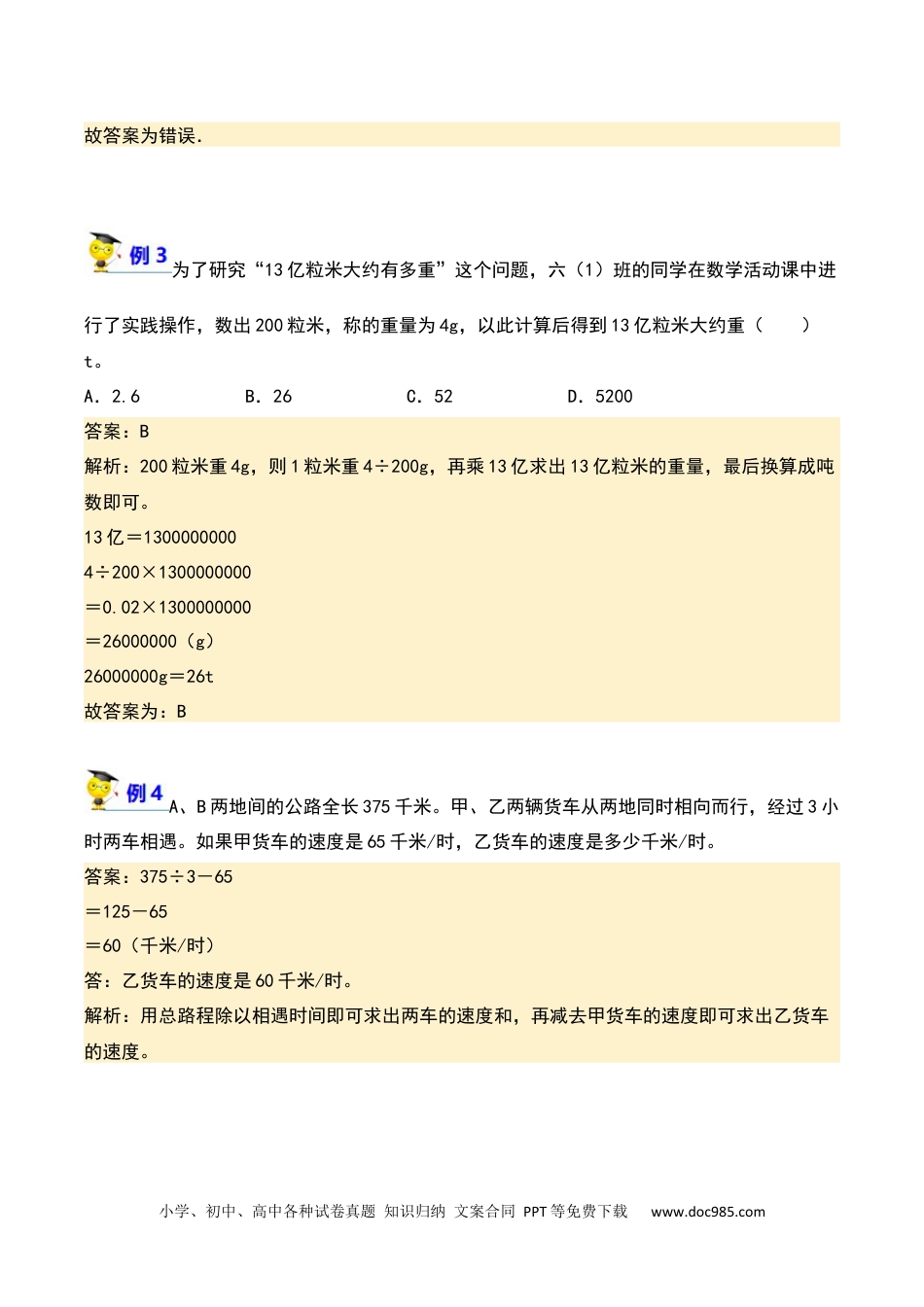 小学、初中、高中各种试卷真题知识归纳文案合同PPT等免费下载www.doc985.com温馨提示:图片放大更清晰《整数与小数的一般应用》精准讲练通用版小升初数学小学、初中、高中各种试卷真题知识归纳文案合同PPT等免费下载www.doc985.com2022年2月5日晚,北京冬奥会第一个比赛日,中国队夺得短道速滑混合团体接力冠军。短道速滑赛道直道长28.85米,两端近似半圆平均半径8米,赛道的周长大约是()米。(得数保留整数)答案:108解析:通过观察图形可知,赛道的周长等于半径为8米的圆的周长加上两条直道的长度,根据圆的周长公式:,把数据代入公式解答。2×3.14×8+28.85×2=6.28×8+57.7=50.24十57.7=107.94≈108(米)一根木头,锯成3段要付锯板费3元;如果锯成9段,则要付锯板费9元.()答案:×试题分析:根据“锯成3段要付锯板费3元,也就是锯2次要付锯板费3元;,可求出锯1次要付钱数;要求锯成9段付的钱数,也就是求锯8次付多少钱,列式解答即可.解:锯1次要付钱数:3÷(3﹣1)=1.5(元);锯成9段付的钱数:1.5×(9﹣1)=12(元);小学、初中、高中各种试卷真题知识归纳文案合同PPT等免费下载www.doc985.com故答案为错误.为了研究“13亿粒米大约有多重”这个问题,六(1)班的同学在数学活动课中进行了实践操作,数出200粒米,称的重量为4g,以此计算后得到13亿粒米大约重()t。A.2.6B.26C.52D.5200答案:B解析:200粒米重4g,则1粒米重4÷200g,再乘13亿求出13亿粒米的重量,最后换算成吨数即可。13亿=13000000004÷200×1300000000=0.02×1300000000=26000000(g)26000000g=26t故答案为:BA、B两地间的公路全长375千米。甲、乙两辆货车从两地同时相向而行,经过3小时两车相遇。如果甲货车的速度是65千米/时,乙货车的速度是多少千米/时。答案:375÷3-65=125-65=60(千米/时)答:乙货车的速度是60千米/时。解析:用总路程除以相遇时间即可求出两车的速度和,再减去甲货车的速度即可求出乙货车的速度。小学、初中、高中各种试卷真题知识归纳文案合同PPT等免费下载www.doc985.com一、题填空1.六年级(2的同学一,)班站成排他们先自左向右从“1”,开始报数然后又自右向左从“1”,时,开始报数结果发现两次报数报“20”的同学同学两名之间(包括这两名)恰有15,同学人则全班共有_________人。2.一个的每漏水水龙头天要白白地流掉约10千,个的克水。照这样计算这漏水水龙头2021一年第季度要白白流掉()千克水。3.小学的长、宽、长、面积和高时,强在记录校篮球场周篮球架由于疏忽把数据弄乱了:420、28、86、15、3,的长你认为篮球场周应该是()米,面积应该是()平方米。4.小伟1.2小时车骑6千米,车的每小时他骑速度是()千米,小车的如果伟骑速度一,行的和时定他骑路程间成()比例。5.车费行驶千米的,某市出租夜间收(单位:元)与路程(单位:)之间关系如图所示如果车勇勇乘出租最远能到8,公里那么他恰有________元。6.下面的在括号里填上适当数。0.08m3=()dm33.45=升()升()毫升2小时45分=()小时350米=毫()米5吨65千=克()吨60=公顷()平方千米7.分我国国旗尺寸6种,中一种长规格其是1.44米,宽是0.96米,种的面积这国旗大约是()平方米,它的长宽的是()倍。小学、初中、高中各种试卷真题知识归纳文案合同PPT等免费下载www.doc985.com、题二判断1.小时,小计算数乘法先把数乘法转化成整数乘法计算。()2.一个长方形的长和宽各增加0.3米,它的面积就增加9平方米.()3.一个中用奶奶编“国结”要丝绳0.85米,亮亮有8.3米,丝绳可以编9个的中这样“国.结”()4.、个合一,每甲乙两修路队修条路甲队天修18米,每乙队天修15米,合两队修24天修,长米完这条路全多少?列式是:18+15=33米()33×24=792米()()5.汽车3时行驶270千米,它平均每分行驶90千米.()、题三选择1.小用红“下的长方形面积中方形的面积用”表示图。图①号正,表示那么表示小长方形面积的④号算式是()。A.B.C.D.2.李阿姨买了19,每的盆花盆花价格在31和39,的元之间这些盆花总价钱()。A.不足400元B.在400和600元之间C.在600和800元之间D.超过800元3.平...