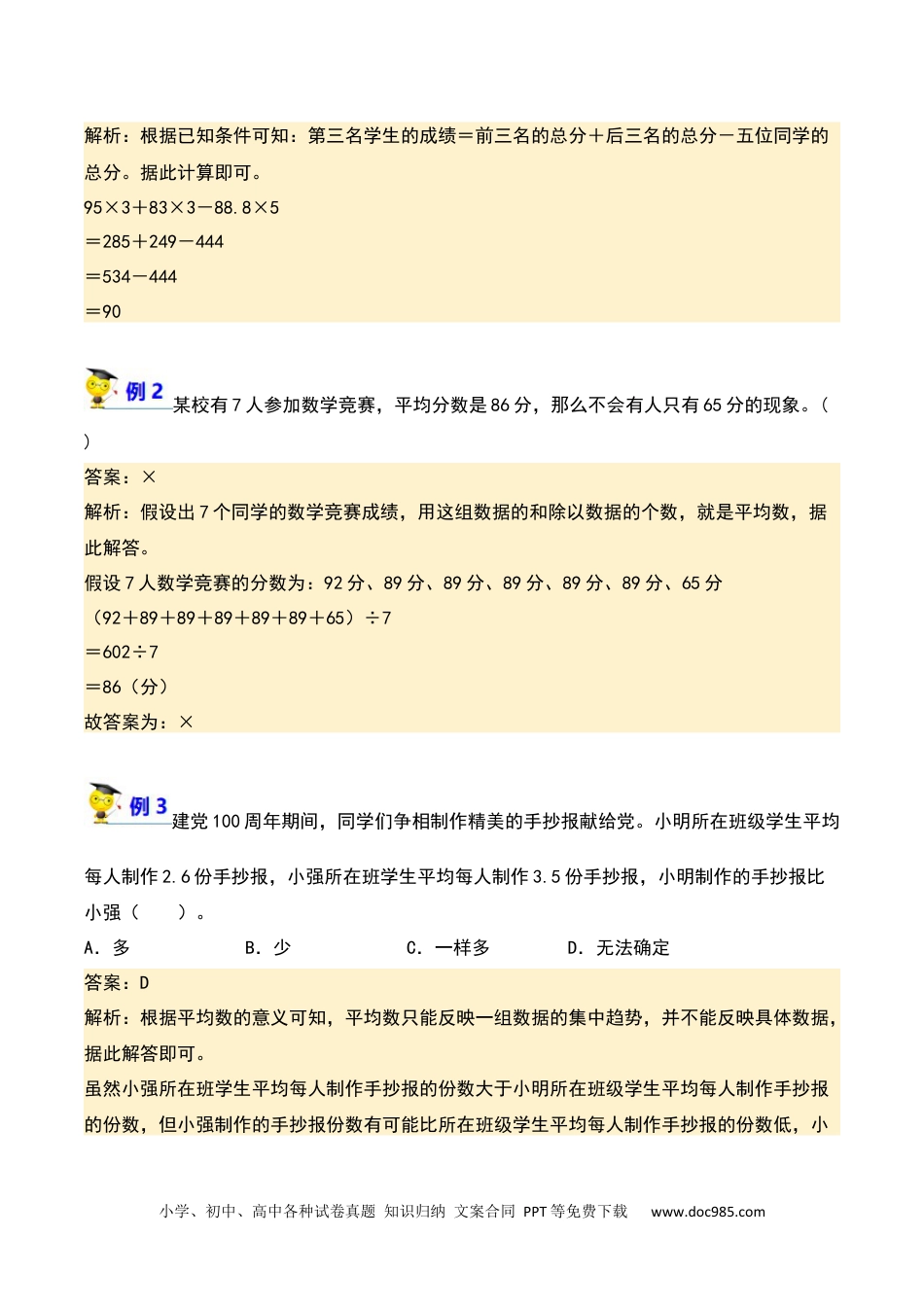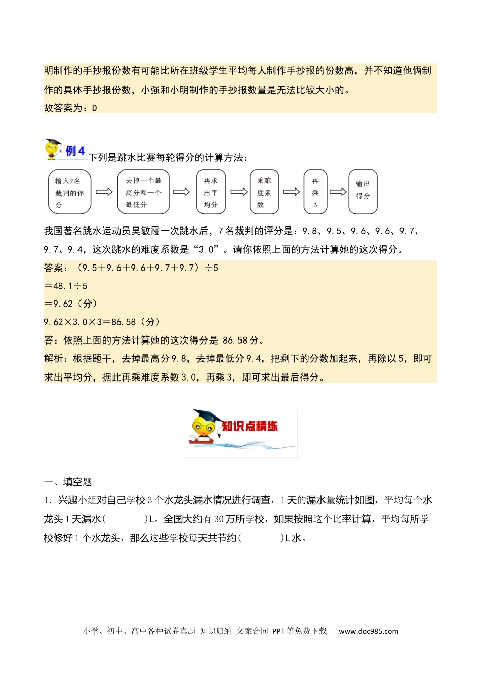 小学、初中、高中各种试卷真题知识归纳文案合同PPT等免费下载www.doc985.com温馨提示:图片放大更清晰五位同学参加数学考试,平均分是88.8分。把他们的得分按从高到低排列,前三名的平均分是95分,后三名的平均分是83分。从高到低第三名学生的得分是()分。答案:90《平均数问题》精准讲练通用版小升初数学小学、初中、高中各种试卷真题知识归纳文案合同PPT等免费下载www.doc985.com解析:根据已知条件可知:第三名学生的成绩=前三名的总分+后三名的总分-五位同学的总分。据此计算即可。95×3+83×3-88.8×5=285+249-444=534-444=90某校有7人参加数学竞赛,平均分数是86分,那么不会有人只有65分的现象。()答案:×解析:假设出7个同学的数学竞赛成绩,用这组数据的和除以数据的个数,就是平均数,据此解答。假设7人数学竞赛的分数为:92分、89分、89分、89分、89分、89分、65分(92+89+89+89+89+89+65)÷7=602÷7=86(分)故答案为:×建党100周年期间,同学们争相制作精美的手抄报献给党。小明所在班级学生平均每人制作2.6份手抄报,小强所在班学生平均每人制作3.5份手抄报,小明制作的手抄报比小强()。A.多B.少C.一样多D.无法确定答案:D解析:根据平均数的意义可知,平均数只能反映一组数据的集中趋势,并不能反映具体数据,据此解答即可。虽然小强所在班学生平均每人制作手抄报的份数大于小明所在班级学生平均每人制作手抄报的份数,但小强制作的手抄报份数有可能比所在班级学生平均每人制作手抄报的份数低,小小学、初中、高中各种试卷真题知识归纳文案合同PPT等免费下载www.doc985.com明制作的手抄报份数有可能比所在班级学生平均每人制作手抄报的份数高,并不知道他俩制作的具体手抄报份数,小强和小明制作的手抄报数量是无法比较大小的。故答案为:D下列是跳水比赛每轮得分的计算方法:我国著名跳水运动员吴敏霞一次跳水后,7名裁判的评分是:9.8、9.5、9.6、9.6、9.7、9.7、9.4,这次跳水的难度系数是“3.0”。请你依照上面的方法计算她的这次得分。答案:(9.5+9.6+9.6+9.7+9.7)÷5=48.1÷5=9.62(分)9.62×3.0×3=86.58(分)答:依照上面的方法计算她的这次得分是86.58分。解析:根据题干,去掉最高分9.8,去掉最低分9.4,把剩下的分数加起来,再除以5,即可求出平均分,据此再乘难度系数3.0,再乘3,即可求出最后得分。一、题填空1.小组学兴趣对自己校3个,水龙头漏水情况进行调查1的量,平均每个天漏水统计如图水龙头1天漏水()L。有全国大约30学,这个比,平均每学万所校如果按照率计算所校修好1个,这学每水龙头那么些校天共节约()L。水小学、初中、高中各种试卷真题知识归纳文案合同PPT等免费下载www.doc985.com2.、、三人分钟跳绳的平均成绩典典华华天天半为44下,三人跳绳的成绩比是245∶∶,则华分钟跳绳华半()下。3.某款年年下,题。汽车厂两新车今上半销售情况统计图如看图回答问(1)B款车()出的多;月售最A款车()出的。月售最少(2)A款年年平均每出车今上半月售()辆:5月B款的量比车销售4月B款的量车销售多()%。4.小红小,第一组幼儿园老师折花表彰朋友4名老师折140,第二组朵5名老师折130,朵平均每个老师折________;平均每个小组朵折________。朵5.是某四个年第一、二个生数的。如图工厂车间去两季度产电脑台统计图小学、初中、高中各种试卷真题知识归纳文案合同PPT等免费下载www.doc985.com(1)年第一第去季度()生的数;第二第车间产电脑台最少季度()生的车间产电脑数多。台最(2)年第一平均每个生了去季度车间产();第三年第一生的台电脑车间去季度产电脑台数比第二多季度()%。6.学六年级同学校把全体按的比分成三个小组,平均每个小组的人数植树为30人,最多一组的人数比一组的人数多最少()人。7.小了个数,了一,这个数的平均数是芳在练习本上写几她算算几68,一个她又写80,这平均数高了时把提到70,一个数平均数她想再写使又回到68,出的这个数应是她最后写()。二、题判断1.光明小学组织“爱心捐书”活动。四年级学生平均每人捐书数量多于六年级学生平均每人捐书数量,四年级学生的捐书总量一定多于六年级...