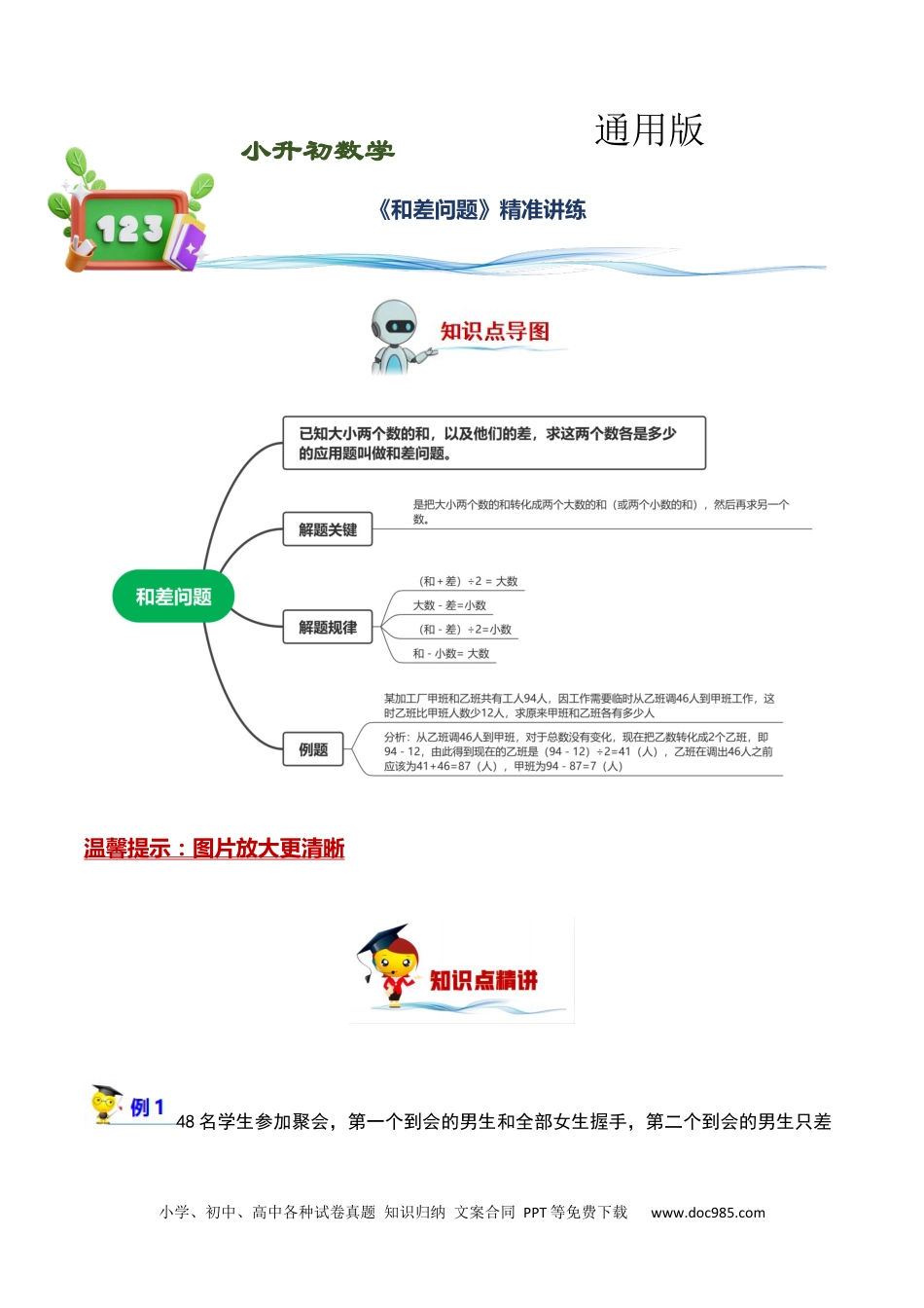 小学、初中、高中各种试卷真题知识归纳文案合同PPT等免费下载www.doc985.com温馨提示:图片放大更清晰48名学生参加聚会,第一个到会的男生和全部女生握手,第二个到会的男生只差《和差问题》精准讲练通用版小升初数学小学、初中、高中各种试卷真题知识归纳文案合同PPT等免费下载www.doc985.com一名女生没握过手,第三个到会的男生只差2名女生没握过手,……最后一个到会的男生同9名女生握过手,这48名学生中共有()名女生。答案:解析:根据题意知道,女多男少所有的女生全部提前到达,在门口列队迎接男生到来第一个到来的男生和所有女生握过手后把一名女生领了进去;第二个到来的男生也和第一名男生一样和站在门口的所有女生握手后把个女生领了进去,同样最后一名到来的男生同最后剩下的9名女生握手后,把一名女生领进去;最后会剩下8名女生,可见女生比男生多8名;再根据和差问题公式求得女生人数即可。根据题意可知,女生比男生多(9-1)名;[48+(9-1)]÷2=[48+8]÷2=56÷2=28(名)所以,这48名学生中共有28名女生。有两匹马和一副鞍,白马配鞍售价800元,黑马配鞍售价600元,两匹马售价1000元,那么一副鞍售价______元。答案:解析:根据题意可知,白黑马价格和是1000元,白黑马差价是:800-600=200(元);所以白马售价是:(200+1000)÷2=600(元),黑马售价为:1000-600=400(元),一副鞍售甲是:600-400=200(元)。[1000+(800-600)]÷2=[1000+200]÷2=1200÷2=600(元)800-600=200(元)所以,一副鞍售价200元。小学、初中、高中各种试卷真题知识归纳文案合同PPT等免费下载www.doc985.com有大、小两个油桶,一共装油24千克,两个油桶都倒出同样多的油后分别还剩9千克和5千克。问:原来大、小两个油桶各装油多少千克?答案:根据题意画线段图如下:大桶:(24+4)÷2=28÷2=14(千克)小桶:14-4=10(千克)答:原来大、小两个油桶各装油14千克、10千克。解析:两个油桶都倒出同样多的油后分别还剩9千克和5千克,那么也就是说大桶比小桶多4千克的油,知道这两桶油的和,又找到了这两桶油的差,据此解题即可。兔妈妈拔了29个萝卜分给了小白兔和小黑兔,因为分的萝卜不一样多,兔妈妈让小白兔给了小黑兔5个,这时再来数发现小黑兔比小白兔多出1个萝卜,你知道原来小白兔和小黑兔各分到了多少个萝卜吗?答案:[29+(5×2-1)]÷2=[29+(10-1)]÷2=[29+9]÷2=38÷2=19(个)29-19=10(个)答:小白兔19个,小黑兔10个.解析:小白兔给了小黑兔5个后,小黑兔又比小白兔多出1个萝卜,可以得出小白兔原来的萝卜比小黑兔多:(个)。这时就可以根据和差问题问题来解决了。小学、初中、高中各种试卷真题知识归纳文案合同PPT等免费下载www.doc985.com、题一填空1小小.在国家出台“双减”政策后,曾经背着沉甸甸的书包在课后忙着补习的身影,如今可各各以在运动场上体验式样的体育活动,即将参加1小小分钟仰卧起坐比赛的建和雷每天课小后都在练习,今天建先做了3各分钟,然后两人做了5分钟,一共做仰卧起坐136个。已知小小每分钟建比雷多做4小小个,那么建比雷多做了()个。案答:56解析:题小小由意,假设建每分钟做仰卧起坐的个数与雷一样多,这样两人做仰卧起坐的总个数就减少了:4×(3+5)=32()知小(个,由此可雷每分钟做了:136-32)÷(3+5+5)=8()小个,进而可以分别求出建每分钟做的个数以及两人分别做仰卧起坐的总个数之差;据此解答。小小假设建每分钟做仰卧起坐的次数与雷一样多,两人做仰卧起坐的总次数就减少:4×(3+5)=4×8=32()个;小(雷每分钟做:136-32)÷(3+5+5)=104÷13=8()个;小建每分钟做:8+4=12()个;小建一共做:12×(3+5)=12×8=96()个;小雷一共做:8×5=40()个小小建比雷多做:96-40=56()个小小所以,建比雷多做56个。2.如图,4同个相的长方形和1小知中小个正方形拼成一个大正方形,已其正方形的面积为4平方厘米,大正方形的面积为400中平方厘米,则其长方形长为_____厘米,宽为_____厘米。小学、初中、高中各种试卷真题知识归纳文案合同PPT等免费下载...