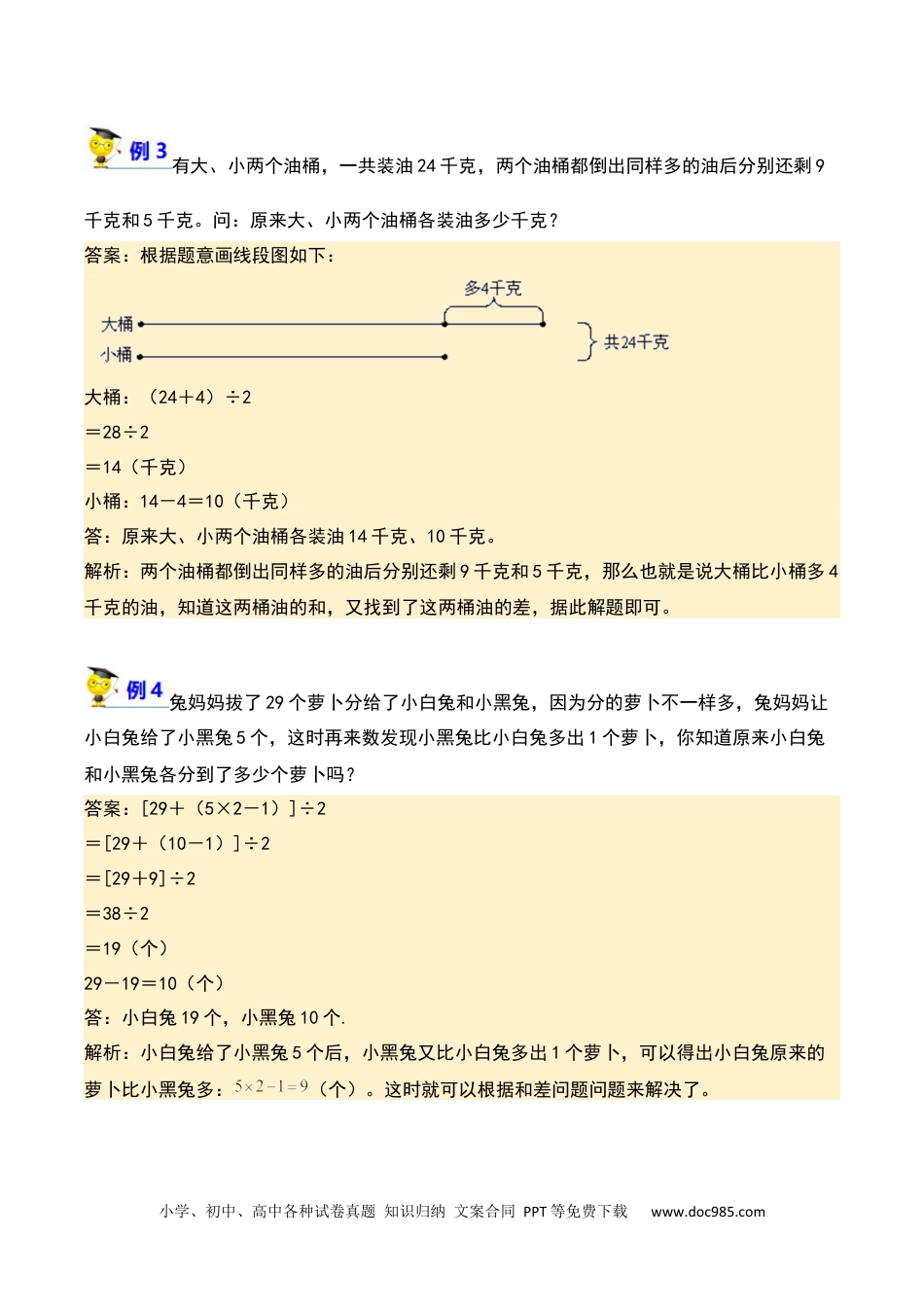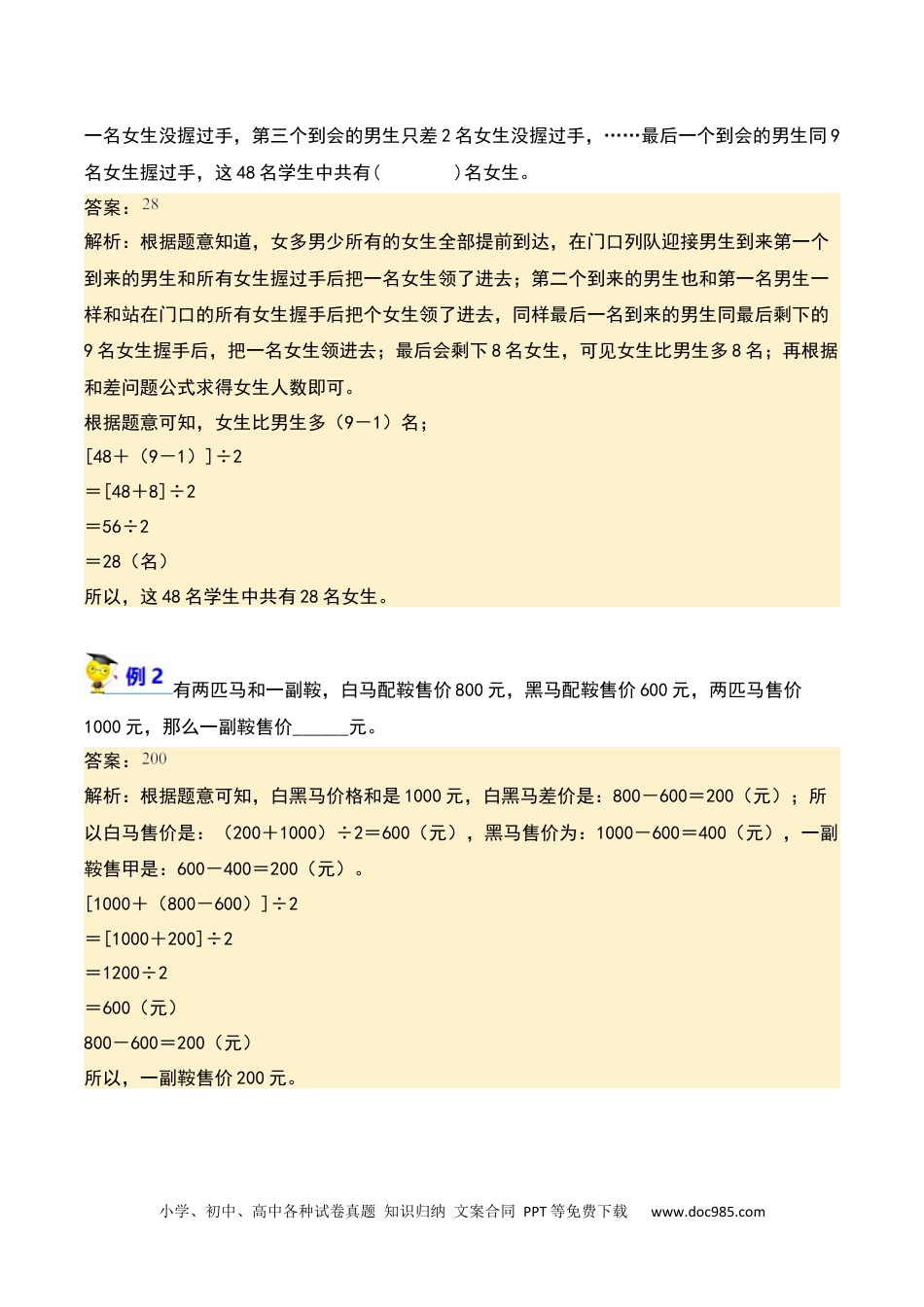 小学、初中、高中各种试卷真题知识归纳文案合同PPT等免费下载www.doc985.com温馨提示:图片放大更清晰48名学生参加聚会,第一个到会的男生和全部女生握手,第二个到会的男生只差《和差问题》精准讲练通用版小升初数学小学、初中、高中各种试卷真题知识归纳文案合同PPT等免费下载www.doc985.com一名女生没握过手,第三个到会的男生只差2名女生没握过手,……最后一个到会的男生同9名女生握过手,这48名学生中共有()名女生。答案:解析:根据题意知道,女多男少所有的女生全部提前到达,在门口列队迎接男生到来第一个到来的男生和所有女生握过手后把一名女生领了进去;第二个到来的男生也和第一名男生一样和站在门口的所有女生握手后把个女生领了进去,同样最后一名到来的男生同最后剩下的9名女生握手后,把一名女生领进去;最后会剩下8名女生,可见女生比男生多8名;再根据和差问题公式求得女生人数即可。根据题意可知,女生比男生多(9-1)名;[48+(9-1)]÷2=[48+8]÷2=56÷2=28(名)所以,这48名学生中共有28名女生。有两匹马和一副鞍,白马配鞍售价800元,黑马配鞍售价600元,两匹马售价1000元,那么一副鞍售价______元。答案:解析:根据题意可知,白黑马价格和是1000元,白黑马差价是:800-600=200(元);所以白马售价是:(200+1000)÷2=600(元),黑马售价为:1000-600=400(元),一副鞍售甲是:600-400=200(元)。[1000+(800-600)]÷2=[1000+200]÷2=1200÷2=600(元)800-600=200(元)所以,一副鞍售价200元。小学、初中、高中各种试卷真题知识归纳文案合同PPT等免费下载www.doc985.com有大、小两个油桶,一共装油24千克,两个油桶都倒出同样多的油后分别还剩9千克和5千克。问:原来大、小两个油桶各装油多少千克?答案:根据题意画线段图如下:大桶:(24+4)÷2=28÷2=14(千克)小桶:14-4=10(千克)答:原来大、小两个油桶各装油14千克、10千克。解析:两个油桶都倒出同样多的油后分别还剩9千克和5千克,那么也就是说大桶比小桶多4千克的油,知道这两桶油的和,又找到了这两桶油的差,据此解题即可。兔妈妈拔了29个萝卜分给了小白兔和小黑兔,因为分的萝卜不一样多,兔妈妈让小白兔给了小黑兔5个,这时再来数发现小黑兔比小白兔多出1个萝卜,你知道原来小白兔和小黑兔各分到了多少个萝卜吗?答案:[29+(5×2-1)]÷2=[29+(10-1)]÷2=[29+9]÷2=38÷2=19(个)29-19=10(个)答:小白兔19个,小黑兔10个.解析:小白兔给了小黑兔5个后,小黑兔又比小白兔多出1个萝卜,可以得出小白兔原来的萝卜比小黑兔多:(个)。这时就可以根据和差问题问题来解决了。小学、初中、高中各种试卷真题知识归纳文案合同PPT等免费下载www.doc985.com、题一填空1小小.在国家出台“双减”政策后,曾经背着沉甸甸的书包在课后忙着补习的身影,如今可各各以在运动场上体验式样的体育活动,即将参加1小小分钟仰卧起坐比赛的建和雷每天课小后都在练习,今天建先做了3各分钟,然后两人做了5分钟,一共做仰卧起坐136个。已知小小每分钟建比雷多做4小小个,那么建比雷多做了()个。2.如图,4同个相的长方形和1小知中小个正方形拼成一个大正方形,已其正方形的面积为4平方厘米,大正方形的面积为400中平方厘米,则其长方形长为_____厘米,宽为_____厘米。3学学.和思思共有87学学颗糖果,给了思思5学学颗后,思思比还多3学学颗,原来有_________颗糖果,思思有___________颗糖果。4小、小小小.星期天明强和佳一起去采摘。强说:“我摘的苹果最多了,比你们俩摘的苹果总和还多1小个。”明回答说:“是啊。你比我多摘了10小个,但我比佳多摘了10个。”那么他们三人共摘了__________个苹果。5.老师出了200题、、道让王亮李涛张清三人做。三人每人都做对了120题道,且每道都有题题题题人做对。如果把三人都做对的称为简单,只有一人做对的称为难,那么难比简单多__________道。6各.豆豆和苗苗有一盒玻璃球,共有108粒,豆豆给了苗苗10下粒,豆豆剩的玻璃球比苗苗还多8粒,原来苗苗有()粒玻璃球。7各.某校三年级和四年级有两个班。三年级一班...