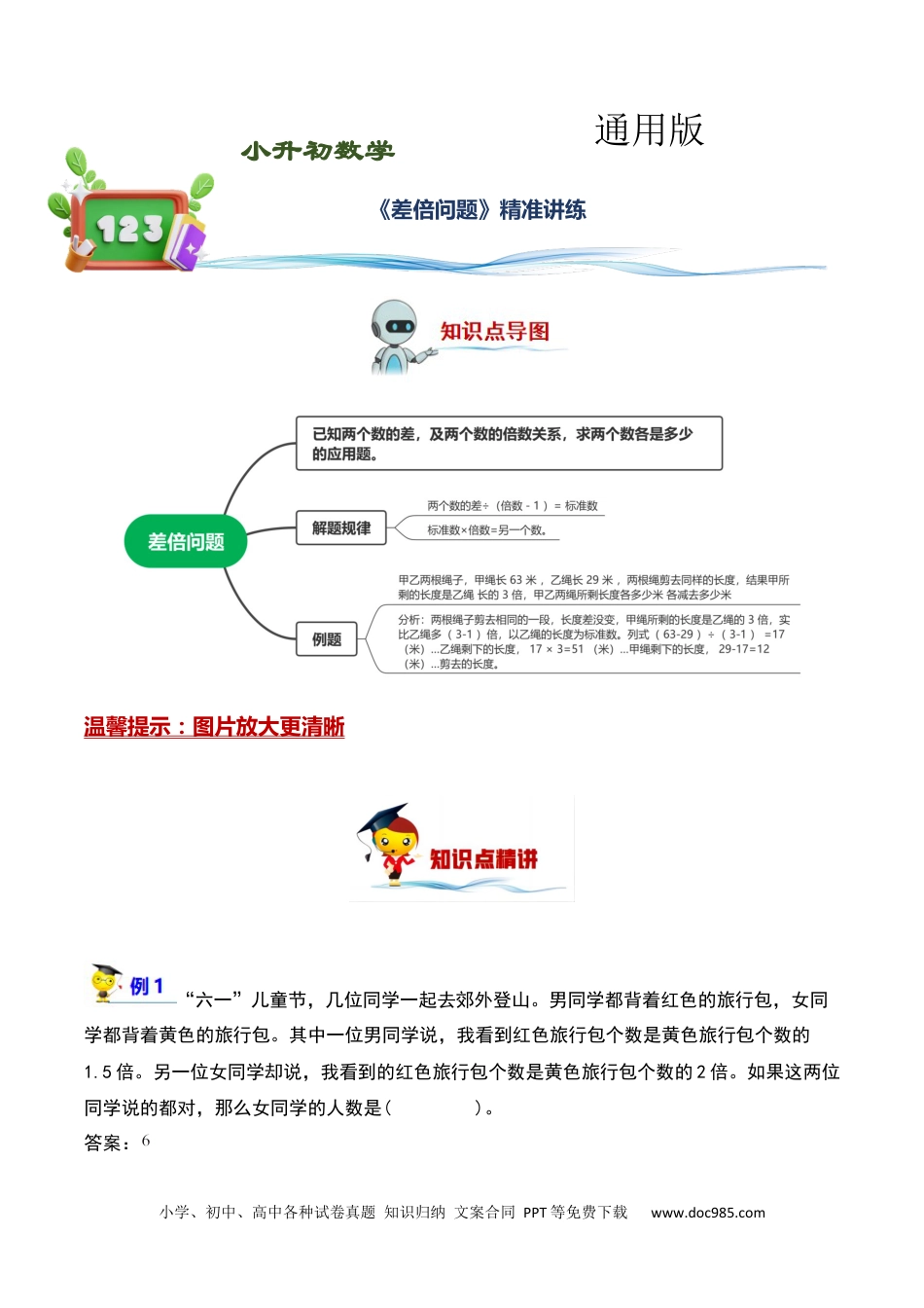 小学、初中、高中各种试卷真题知识归纳文案合同PPT等免费下载www.doc985.com温馨提示:图片放大更清晰“六一”儿童节,几位同学一起去郊外登山。男同学都背着红色的旅行包,女同学都背着黄色的旅行包。其中一位男同学说,我看到红色旅行包个数是黄色旅行包个数的1.5倍。另一位女同学却说,我看到的红色旅行包个数是黄色旅行包个数的2倍。如果这两位同学说的都对,那么女同学的人数是()。答案:《差倍问题》精准讲练通用版小升初数学小学、初中、高中各种试卷真题知识归纳文案合同PPT等免费下载www.doc985.com解析:根据“其中一位男同学说,我看到红色旅行包个数是黄色旅行包个数的1.5倍。另一位女同学却说,我看到的红色旅行包个数是黄色旅行包个数的2倍”。设女同学x人,列方程为:1.5x+1=2(x-1),据此解方程即可。解:设女同学x人,则:1.5x+1=2(x-1)1.5x+1=2x-20.5x=3x=6答:女生人数是6人。幼儿园大班每人发张画片,小班每人发张画片,小班人数是大班人数的倍,小班比大班多发张画片,那么小班有多少人?答案:126÷(13×2-17)×2=126÷9×2=14×2=28(人)答:小班有28人。解析:小班每个人就会发(13×2)张,即26张画片,那么,小班的个人比大班的个人多发了(26-17)张,即9张画片,总共多发了张,所以小班有:(人)。某日停电,房间里燃起了长、短两根蜡烛,它们燃烧速度是—样的。开始时长蜡烛是短蜡烛长度的2倍,当送电后吹灭蜡烛,发现此时长蜡烛是短蜡烛长度的3倍。短蜡烛燃烧掉的长度是5厘米。问原来两根蜡烛各有多长?答案:根据分析可知:5×2=10(厘米)10×2=20(厘米)答:原短蜡烛长10厘米;原长蜡烛长20厘米。小学、初中、高中各种试卷真题知识归纳文案合同PPT等免费下载www.doc985.com解析:所以我们根据题意可知:原长蜡烛长度倍原短蜡烛长度,差为倍原短蜡烛长度;后长蜡烛长度倍后短蜡烛长度,差为倍后短蜡烛长度;所以原短蜡烛长度倍后短蜡烛长度,也就是说短蜡烛燃烧了倍后短蜡烛长度,为厘米,所以原短蜡烛长厘米,原长蜡烛长厘米。、题一填空1.小学学花园组织生植树,五年级植树160棵,正好是四年级的2倍。三年级比四年级少20棵。三年级植树_____棵。2.中请根据图的信息计算,白兔原有胡萝卜_________个,灰兔原有胡萝卜_________个。3.同中王宇玩射击气球的游戏,游戏有两关,两关气球数量相。若王宇第一关射的气球数比中没射的气球数的4倍多2中个;第二关射的气球数比第一关增加了8中个,正好是没射的气球数的6中倍,则游戏每一关有气球________个。4.学种知红星校花坛放有红黄蓝三颜色的花,已蓝花比红花多20盆;黄花比红花的4倍多30盆,又是蓝花数量的3倍,则有______盆黄花。5.同、同学老师买了样多的田格本横线本和练习本。他发给每个1、个田格本3个横线本和5个练习本。这时横线本还剩24个,那么田格本和练习本共剩了()个。6.一箱番茄连箱共重25千克,一筐萝卜连筐共重48中各千克,其的番茄和萝卜卖掉一半后,下剩的番茄和萝卜连箱共重38千克。则一只箱子和一个筐共重()千克。7.一次校友聚会有50同学中识各同人参加,在参加聚会的,每个女生认的男生人数不相,小学、初中、高中各种试卷真题知识归纳文案合同PPT等免费下载www.doc985.com识识而且恰好构成一串连续的自然数,最多的全认,最少的也认15人。这次聚会有()个女生参加。8.小小知小小为了过冬,白兔和黑兔都储藏了一些胡萝卜。已白兔储藏的胡萝卜数量是黑兔储藏数量的3各倍。它们吃了5小下小下个胡萝卜后,白兔剩的胡萝卜数量是黑兔剩数量的4下倍。那么它们剩的胡萝卜共有()个。9.在一个庆典晚会上,男女嘉宾共69识人。出现了一个非常有趣的情况:每位女士认的男各同识士的人数不相,而且组成连续的自然数,最少的认16位男士,最多的只有两位男士不识认。这次晚会上,共有女嘉宾()人。10.小中、几个朋友在一起游戏,选一个人作队长,男孩作队长时,队员男孩女孩一样多;中女孩作队长时,队员男孩比女孩多一倍。男孩()人,女孩()人。、题二选择1.两条纸带,较长的一条为23cm,较短的一条为15cm下同。把两条纸带剪样长的一段后,下中下剩的两条纸带...
