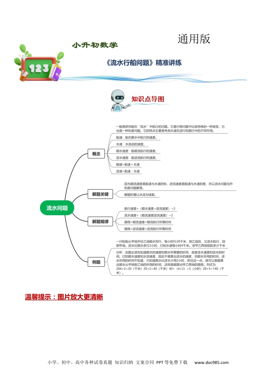 小学、初中、高中各种试卷真题知识归纳文案合同PPT等免费下载www.doc985.com温馨提示:图片放大更清晰《流水行船问题》精准讲练通用版小升初数学小学、初中、高中各种试卷真题知识归纳文案合同PPT等免费下载www.doc985.com甲、乙两港间的水路长208千米,一只船从甲港开往乙港,顺水8小时到达,从乙港返回甲港,逆水13小时到达,求船在静水中的速度和水流速度。答案:顺水速度:208÷8=26(千米/小时)逆水速度:208÷13=16(千米/小时)船速:(26+16)÷2=42÷2=21(千米/小时)水速:(26—16)÷2=10÷2=5(千米/小时)答:船在静水中的速度是21千米/小时,水流速度是5千米/小时。解析:根据题意,用208÷8求出顺水速度,然后再用208÷13求出逆水速度,用逆水速度加顺水速度的和÷2求出静水速度,再用顺水速度减去静水速度等于水流速度。轮船用同一速度往返于两码头之间,它顺流而下行了8个小时,逆流而上行了10小时,如果水流速度是每小时3千米,两码头之间的距离是多少千米?答案:解:设船在静水中的速度是每小时x千米。(x+3)×8=(x-3)×108x+3×8=10x-3×108x+24=10x-3010x-8x=30+242x=54x=27小学、初中、高中各种试卷真题知识归纳文案合同PPT等免费下载www.doc985.com(27+3)×8=30×8=240(千米)答:两码头之间的距离是240千米。解析:顺流速度=船速+3,逆流速度=船速-3;速度×时间=路程,由于轮船顺水航行和逆水航行的路程相同,得等量关系式(船速+3)×8=(船速-3)×10。据此列方程解答求出船速。进而求出两码头之间的距离。乙船顺水航行2小时,行了120千米,返回原地用了4小时,甲船顺水航行同一段水路,用了3小时。甲船返回原地比去时多用了几小时?答案:乙船顺水速度:120÷2=60(千米/小时)乙船逆水速度:120÷4=30(千米/小时)水流速度:(60-30)÷2=15(千米/小时)甲船顺水速度:120÷3=40(千米/小时)甲船逆水速度:40-2×15=10(千米/小时)甲船逆水航行时间:120÷10=12(小时)甲船返回原地比去时多用时间:12-3=9(小时)答:甲船返回原地比去时多用了9小时。解析:顺水速度=顺水路程÷顺水时间,顺水速度=船速+水速;逆水速度=逆水路程÷逆水时间,顺水速度=船速-水速;水速=(顺水速度-逆水速度)÷2,船速=(顺水速度+逆水速度)÷2,据此解答即可。、题一填空1.轮船由于水小时一艘从甲港开往乙港,顺,每可以航行28千米,3小时轮船到达。这艘从小学、初中、高中各种试卷真题知识归纳文案合同PPT等免费下载www.doc985.com时由于水小时乙港返回甲港,逆,每只能航行21轮船小时的平速度千米。这艘往返一次每均是()千米/小时。答案:24解:析由小时“每可以航行28千米,3小时的由轮船到达”可以求出甲乙两港距离,“这艘时由于水小时从乙港返回甲港,逆,每只能航行21水用的时千米”,求出逆所间,再根据往路程时解题返除以往返间,决问。28×3=84()千米84÷21=4(小时)84×2÷(3+4)=168÷7=24(千米/小时)2.小一条河经过A,B,C三镇,A,B船船水中的速度为小时两镇之间有汽来往,汽在静每11千米,B,C船两镇之间有木摆渡,A、C的为两地之间距离50船水中的速度千米,木在静为小时每3.5水流速度为千米,1.5小时千米每。某人从A船流下镇上汽顺而到B镇,接着乘船流下木又顺而到C程用镇。全共7小时,那么A,B的两镇间距离是________。答案:25千米解:析题船水中的速度为根据意,汽在顺12.5千米/小时船水中的速度为,木在顺5千米/小时设,可以A到B的为地距离x则千米,B地到C的为(地距离50-x):路程千米。根据÷速度=时知间,可A到B用时为,B到C用时为用时,总共7小时此程。据列出方即解可求。解:设A到B的为地距离x则千米,B地到C的为(地距离50-x)千米。小学、初中、高中各种试卷真题知识归纳文案合同PPT等免费下载www.doc985.com所以,从A地到B的为地距离25千米。3.船从甲地到乙地要行驶2小时,从乙地到甲地要行驶3小时流,现有一条木筏从甲地漂到乙地要()小时。答案:12、题二选择1.轮船流一艘顺而行,从甲地到乙地需要6流天;逆而行,从乙地到甲地需要8天。若不考流(虑其...