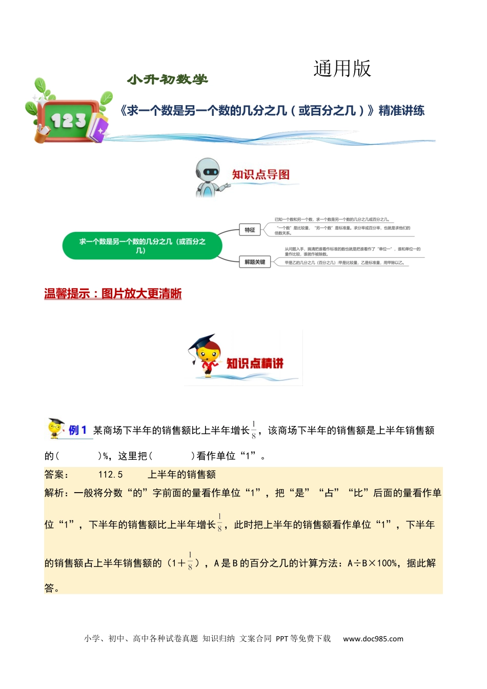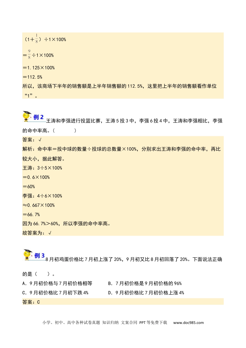 小学、初中、高中各种试卷真题知识归纳文案合同PPT等免费下载www.doc985.com温馨提示:图片放大更清晰某商场下半年的销售额比上半年增长,该商场下半年的销售额是上半年销售额的()%,这里把()看作单位“1”。答案:112.5上半年的销售额解析:一般将分数“的”字前面的量看作单位“1”,把“是”“占”“比”后面的量看作单位“1”,下半年的销售额比上半年增长,此时把上半年的销售额看作单位“1”,下半年的销售额占上半年销售额的(1+),A是B的百分之几的计算方法:A÷B×100%,据此解答。《求一个数是另一个数的几分之几(或百分之几)》精准讲练通用版小升初数学小学、初中、高中各种试卷真题知识归纳文案合同PPT等免费下载www.doc985.com(1+)÷1×100%=÷1×100%=1.125×100%=112.5%所以,该商场下半年的销售额是上半年销售额的112.5%,这里把上半年的销售额看作单位“1”。王涛和李强进行投篮比赛,王涛5投3中,李强6投4中,王涛和李强相比,李强的命中率高。()答案:√解析:命中率=投中球的数量÷投球的总数量×100%,分别求出王涛和李强的命中率,再比较大小,据此解答。王涛:3÷5×100%=0.6×100%=60%李强:4÷6×100%≈0.667×100%=66.7%因为66.7%>60%,所以李强的命中率高。故答案为:√8月初鸡蛋价格比7月初上涨了20%,9月初又比8月初回落了20%。下面说法正确的是()。A.9月初价格与7月初价格相等B.7月初价格是9月初价格的96%C.9月初价格比7月初下跌4%D.9月初价格比7月初价格上涨4%答案:C小学、初中、高中各种试卷真题知识归纳文案合同PPT等免费下载www.doc985.com解析:假设7月初价格是100元,由于8月初价格比7月初上涨20%,则8月初价格是7月初价格的:(1+20%),此时8月初的价格:100×(1+20%)=120(元),9月初又比8月初回落了20%,则此时9月初价格是8月初的:1-20%,单位“1”是8月初价格,单位“1”已知,用乘法,即此时9月初的价格是:120×(1-20%)=96(元),用7月初价格除以9月初的价格再乘100%即可求出7月初价格是9月初的百分之多少;之由于9月初价格比7月初降低,则是下跌,用少的量除以7月初价格乘100%即可求解。假设7月初价格是100元。100×(1+20%)×(1-20%)=120×80%=96(元)100÷96×100%≈1.041×100%=104.1%(100-96)÷100×100%=4÷100×100%=0.04×100%=4%所以,7月初价格是9月初的104.4%,9月初价格比7月初下跌4%。故答案为:C8克糖融入40克水中成为糖水,要保持同样的浓度和甜度,280克水中应该融入多少克糖?(两种方法解答)答案:方法一:280×(8÷40)=280×=56(克)方法二:设280克水中应该融入x克糖。8∶40=x∶28040x=280×8小学、初中、高中各种试卷真题知识归纳文案合同PPT等免费下载www.doc985.com40x=2240x=2240÷40x=56答:280克水中应该融入56克糖。解析:方法一:根据题意,8克糖融入40克水中成为糖水,由此可知,糖占水的几分之几;8÷40=,再用280×,即可求出280克水中应该融入多少克糖;方法二:根据比例的意义:表示两个比相等的式子叫做比例;由于糖和水的比值不变,设280克水中应该融入x克糖,列比例:8∶40=x∶280,解比例,即可解答。一、题填空1.数的是纺织厂男工和女工人比,数是全数的男工人厂职工人。答案::解析数是根据男工和女工人比1∶4,知是可男工1数,是份女工4数,全数份则厂职工人就是1+4=5数,用的数全的数,答。份再男工份除以厂职工份即可解1÷(1+4)=1÷5=数的是纺织厂男工和女工人比,数是全数的男工人厂职工人。2.,的为两个正方形叠放如图打正方形边长被分a、b,是两段长度比1∶2,小的正方形面小学、初中、高中各种试卷真题知识归纳文案合同PPT等免费下载www.doc985.com占的积大正方形面积。答案::解析将a的长度看作1,b的长度看作2,=正方形面积边长×,=边长三角形面积底×高÷2,小的=-小正方形面积大正方形面积三角形面积×4,小的正方形面积÷的大正方形面=小的占的。积正方形面积大正方形面积几分之几(1+2)×(1+2)=3×3=99-(1×2÷2×4)=9-4=55÷9=小的占的正方形面积大正方形面积。3.六(1)班、...