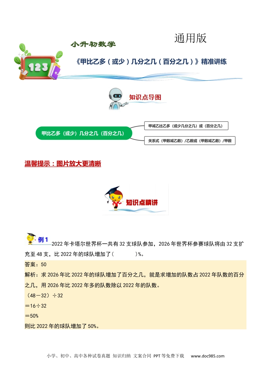 小学、初中、高中各种试卷真题知识归纳文案合同PPT等免费下载www.doc985.com温馨提示:图片放大更清晰2022年卡塔尔世界杯一共有32支球队参加,2026年世界杯参赛球队将由32支扩充至48支,比2022年的球队增加了()%。答案:50解析:求2026年比2022年的球队增加了百分之几,就是求增加的队数占2022年队数的百分之几,用2026年比2022年多的队数除以2022年的队数。(48-32)÷32=16÷32=50%则比2022年的球队增加了50%。《甲比乙多(或少)几分之几(百分之几)》精准讲练通用版小升初数学小学、初中、高中各种试卷真题知识归纳文案合同PPT等免费下载www.doc985.com—件衣服网上售价是125元,双十一期间降价,100元钱可以买到手。()答案:√解析:把这件衣服的售价看作单位“1”,则现在的到手价相当售价的(1-),根据分数乘法的意义,用售价乘(1-)求出到手价即可判断。125×(1-)=125×=100(元)原题计算正确;故答案为:√某乡去年收棉花37.4万千克,今年遭受虫害,收棉花31.79万千克,减产()。A.1.5%B.一成五C.0.15%D.16.7%答案:B解析:根据题意,求今年棉花比去年减产多少,用今年和去年的差额÷去年的棉花产量×100%即可解答。(37.4-31.79)÷37.4×100%=5.61÷37.4×100%=0.15×100%=15%15%=一成五今年棉花比去年减产一成五。故答案为:B小学、初中、高中各种试卷真题知识归纳文案合同PPT等免费下载www.doc985.com2022年冬奥会将在北京举行,已招募了大量志愿者,其中女志愿者5.4万人,男志愿者比女志愿者多。冬奥会共招募志愿者多少万人?答案:由分析可得:男志愿者人数:5.4×(1+)=5.4×=6.6(万人)6.6+5.4=12(万人)答:冬奥会共招募志愿者12万人。解析:把女志愿者数量看作单位“1”,男志愿者比女志愿者多,则男志愿者占女志愿者分率为(1+),求比一个数多几分之几的数是多少用乘法,即用女志愿者的数量乘(1+),可求出男志愿者数量,再加上女志愿者数量即可。、题一填空1.中个周长是向阳广场间有一62.8米的圆,这个的是形喷水池喷水池半径()米,是面积()米。现在要这个,后的比原来了平方把喷水池扩宽扩宽半径增加,扩宽后的的周长是喷水池()米,比原来了面积增加()米。平方答案:1031487.92301.44:解析根据圆的周长公式:C=2r,那么r=C÷÷2,圆的公式:面积S=r2,数代入值小学、初中、高中各种试卷真题知识归纳文案合同PPT等免费下载www.doc985.com求出的和可喷水池半径面积;原来的作“把半径看单位1”,大后的是原来的(扩半径半径1+),根据求个数的几分一之几是多少,用求出大后,后数据公式求出圆的周长和,用现在的乘法扩半径然把代入面积原来的求出了多少。面积减去面积可面积增加分:由析可得的是:喷水池半径62.8÷3.14÷2=20÷2=10(米)的是:喷水池面积3.14×102=3.14×100=314(米)平方后的为:扩宽喷水池半径10×(1+)=10×=14(米)后的周长:扩宽喷水池2×3.14×14=6.28×14=87.92(米)后的比原来的米:扩宽喷水池面积增加平方3.14×142-314=3.14×196-314=615.44-314=301.44(米)平方小学、初中、高中各种试卷真题知识归纳文案合同PPT等免费下载www.doc985.com2.明文具彩超市新购进180支笔,的圆笔的数量比笔多钢新购进珠钢,的圆笔新购进珠有()支的中笔比圆笔少;新购进性珠50%。的中笔新购进性有()支。答案:216108:解析根据题,笔的支数作“意把新购进钢看单位1”,那么的圆笔笔的(新购进珠就占钢1+),要求圆笔多少支,用要求的中笔是多少支,圆笔的珠乘法计算即可;新购进性把珠支数作“看单位1”,的中笔圆笔的(新购进性占珠1-50%),用圆笔的支数(珠乘1-50%),求出中笔的支数。即可性180×(1+)=180×=216(支)216×(1-50%)=216×50%=108(支)所以,明文具彩超市新购进180支笔,的圆笔的数量比笔多钢新购进珠钢,的圆新购进珠笔有216支的中笔比圆笔少;新购进性珠50%。的中笔新购进性有108支。3.上,了手工课琪琪折28,的数量比的多只纸鹤萍萍折纸鹤琪琪。上了手工课萍萍折()。只纸鹤答案:35:解析知的数量比的多已萍萍折纸鹤琪琪,用的数量琪琪×(1+)...