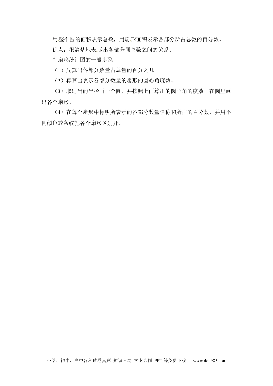 小学、初中、高中各种试卷真题知识归纳文案合同PPT等免费下载www.doc985.com小升初数学知识点汇总-小升初数学总复习资料第五章简单的统计一统计表(一)意义[来源:学#科#网Z#X#X#K]★把统计数据填写在一定格式的表格内,用来反映情况、说明问题,这样的表格就叫做统计表。[来源:学科网](二)组成部分★一般分为表格外和表格内两部分。表格外部分包括标的名称,单位说明和制表日期;表格内部包括表头、横标目、纵标目和数据四个方面。(三)种类★单式统计表:只含有一个项目的统计表。★复式统计表:含有两个或两个以上统计项目的统计表。[来源:Z,xx,k.Com]★百分数统计表:不仅表明各统计项目的具体数量,而且表明比较量相当于标准量的百分比的统计表。(四)制作步骤1搜集数据2整理数据:要根据制表的目的和统计的内容,对数据进行分类。3设计草表:要根据统计的目的和内容设计分栏格内容、分栏格画法,规定横栏、竖栏各需几格,每格长度。4正式制表:把核对过的数据填入表中,并根据制表要求,用简单、明确的语言写上统计表的名称和制表日期。[来源:Zxxk.Com]二统计图(一)意义★用点线面积等来表示相关的量之间的数量关系的图形叫做统计图。小学、初中、高中各种试卷真题知识归纳文案合同PPT等免费下载www.doc985.com(二)分类1条形统计图用一个单位长度表示一定的数量,根据数量的多少画成长短不同的直条,然后把这些直线按照一定的顺序排列起来。优点:很容易看出各种数量的多少。注意:画条形统计图时,直条的宽窄必须相同。取一个单位长度表示数量的多少要根据具体情况而确定;复式条形统计图中表示不同项目的直条,要用不同的线条或颜色区别开,并在制图日期下面注明图例。制作条形统计图的一般步骤:(1)根据图纸的大小,画出两条互相垂直的射线。(2)在水平射线上,适当分配条形的位置,确定直线的宽度和间隔。(3)在与水平射线垂直的深线上根据数据大小的具体情况,确定单位长度表示多少。(4)按照数据的大小画出长短不同的直条,并注明数量。2折线统计图用一个单位长度表示一定的数量,根据数量的多少描出各点,然后把各点用线段顺次连接起来。[来源:Z,xx,k.Com]优点:不但可以表示数量的多少,而且能够清楚地表示出数量增减变化的情况。注意:折线统计图的横轴表示不同的年份、月份等时间时,不同时间之间的距离要根据年份或月份的间隔来确定。制作折线统计图的一般步骤:(1)根据图纸的大小,画出两条互相垂直的射线。(2)在水平射线上,适当分配折线的位置,确定直线的宽度和间隔。(3)在与水平射线垂直的深线上根据数据大小的具体情况,确定单位长度表示多少。(4)按照数据的大小描出各点,再用线段顺次连接起来,并注明数量。3扇形统计图小学、初中、高中各种试卷真题知识归纳文案合同PPT等免费下载www.doc985.com用整个圆的面积表示总数,用扇形面积表示各部分所占总数的百分数。优点:很清楚地表示出各部分同总数之间的关系。制扇形统计图的一般步骤:(1)先算出各部分数量占总量的百分之几。(2)再算出表示各部分数量的扇形的圆心角度数。(3)取适当的半径画一个圆,并按照上面算出的圆心角的度数,在圆里画出各个扇形。(4)在每个扇形中标明所表示的各部分数量名称和所占的百分数,并用不同颜色或条纹把各个扇形区别开。小学、初中、高中各种试卷真题知识归纳文案合同PPT等免费下载www.doc985.com