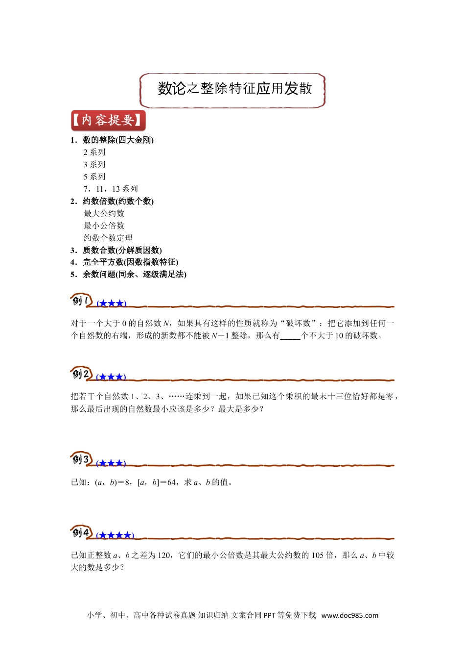 1.数的整除(四大金刚)2系列3系列5系列7,11,13系列2.约数倍数(约数个数)最大公约数最小公倍数约数个数定理3.质数合数(分解质因数)4.完全平方数(因数指数特征)5.余数问题(同余、逐级满足法)对于一个大于0的自然数N,如果具有这样的性质就称为“破坏数”:把它添加到任何一个自然数的右端,形成的新数都不能被N+1整除,那么有_____个不大于10的破坏数。把若干个自然数1、2、3、……连乘到一起,如果已知这个乘积的最末十三位恰好都是零,那么最后出现的自然数最小应该是多少?最大是多少?已知:(a,b)=8,[a,b]=64,求a、b的值。已知正整数a、b之差为120,它们的最小公倍数是其最大公约数的105倍,那么a、b中较大的数是多少?小学、初中、高中各种试卷真题知识归纳文案合同PPT等免费下载www.doc985.com之整除特征用散数论应发(★★★)(★★★)(★★★)(★★★★)已知A数有7个约数,B数有12个约数,且A、B的最小公倍数[A,B]=1728,则B=_____。两数乘积为2800,而且己知其中一数的约数个数比另一数的约数个数多1个,那么这两个数分别是________、_______。有三个连续的自然数,它们从小到大依次是5、7、9的倍数。这三个连续自然数最小是多少?1.数的整除(四大金刚)2.约数倍数(约数个数)3.质数合数(分解质因数)4.完全平方数(因数指数特征)5.余数问题(同余、逐级满足法)小学、初中、高中各种试卷真题知识归纳文案合同PPT等免费下载www.doc985.com(★★★★)(2008年101中学考题)(★★★★)(★★★★)