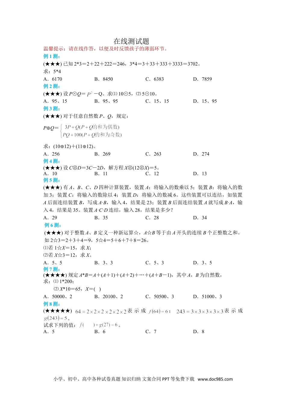 已知,(10,1)=101,(20,1)=401,(20,2)=402。请问(9,3)=?(南京市首届“兴趣杯”少年数学邀请赛预赛)两个数A和B,A除以B的余数记为A-B。例如,14-5=4,5-11=5,12-4=0。计算(26-9)-4。规定,符号“〇”表示选择两数中较大数的运算,如:5〇9=9。符号“△”表示选择两数中较小数的运算,如:3△2=2。请计算(65△27)×(15〇4)。设a、b都表示数,规定a△b=3×a-2×b,①求3△2,2△3;②这个运算“△”有交换律吗?③求(17△6)△2,17△(6△2);④这个运算“△”有结合律吗?小学、初中、高中各种试卷真题知识归纳文案合同PPT等免费下载www.doc985.com定义新运算(★★★)(★★)(★★★)(★★★)(第七届《小数报>数学竞赛初赛)一个特殊的计算器上面有个“※”键,当计算器上显示的数是a时,按一下“※”键后,计算器上的a立刻消失并显示一个新数2a+1。现在这个计算器上显示5,那么连续按“※”键_____次后,会显示95;接着再按“※”键4次,计算器上显示的数将是____。规定a☆b=2×b+3×a,已知⑴x☆2=13,求字母x表示多少?⑵6☆x=50,求字母x表示多少?规定a▲b=a+(a+1)+(a+2)+…+(a+b-1),其中a、b表示自然数。⑴求1▲100的值;⑵已知x▲10=75,求x。(第六届“祖冲之杯”数学邀请赛)麦丹来到红毛族探险,看到下面几个红毛族的算式:8×8=8,9×9×9=5。9×3=3,(93+8)×7=837。翻译告诉她,红毛族算术中所用的符号“+、-、×、÷、()、=”与我们算术中的意义相同,进位也是十进制,只是每个数字虽然与我们写法相同,但代表的数却不同。请你按红毛族的算术规则,完成下面算式:89×57=______。一、定义新运算的核心——定义二、定义新运算的关键——按规则办事三、定义新运算的陷阱——绝对不能想当然四、定义新运算的进阶——读懂定义,看透本质小学、初中、高中各种试卷真题知识归纳文案合同PPT等免费下载www.doc985.com(★★★)(★★★)(★★★★)(★★★★★)在线测试题温馨提示:请在线作答,以便及时反馈孩子的薄弱环节。例1测:(★★★)已知2*3=2+22+222=246,3*4=3+33+333+3333=3702。求:5*4A.6170B.8450C.6383D.7859例2测:(★★★)设P⊙Q=-Q。求⑴10⊙5,⑵5⊙10。A.95、15B.95、95C.15、15D.15、95例3测:(★★★)对于任意自然数P、Q,规定:P⊕Q=求:(10⊕12)+(11⊕12)。A.256B.269C.263D.274例4测:(★★★)设C㊣D=3C-2D,解方程X㊣(12㊣X)=5。A.10B.11C.12D.13例5测:(★★★)有A、B、C、D四种计算装置,装置A:将输入的数乘以5;装置B:将输入的数加3;装置C:将输入的数除以4;装置D:将输入的数减6。这些装置可以连结,如装置A后面连结装置B,写成A·B,输入4,结果是23;装置B后面连结装置A就写成B·A,输入4,结果是35。装置A·C·D连结,输入28,结果是多少?A.29B.35C.28D.34例6测:(★★★)对于整数A、B定义一种新运算☆,A☆B等于由A开头的连续B个正整数之和。如2☆3=2+3+4=9,5☆4=5+6+7+8=26。⑴若1☆X=15,求X;⑵若X☆3=12,求X。A.5、5B.3、3C.5、3D.3、5例7测:(★★★★)规定A*B=A+(A+1)+(A+2)+…+(A+B-1),其中A,B为自然数,求:⑴1*200;⑵X*10=65,X=()A.50000、2B.20100、2C.50500、3D.51000、3例8测:(★★★★★)表示成;表示成。试求下列的值:。A.5B.6C.7D.8小学、初中、高中各种试卷真题知识归纳文案合同PPT等免费下载www.doc985.com